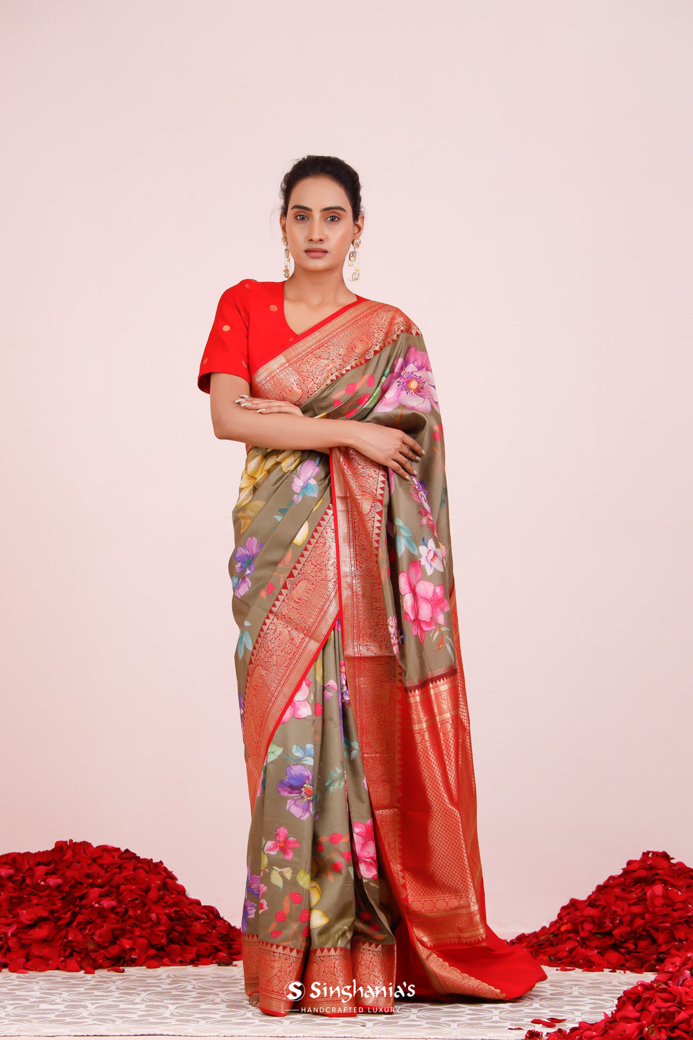This olive green Kanjivaram silk saree is adorned with rich printed floral patterns, giving it a royal and festive appeal. Ideal for weddings and grand occasions, the contrast red border and pallu features floral-fauna motifs in gold zari.