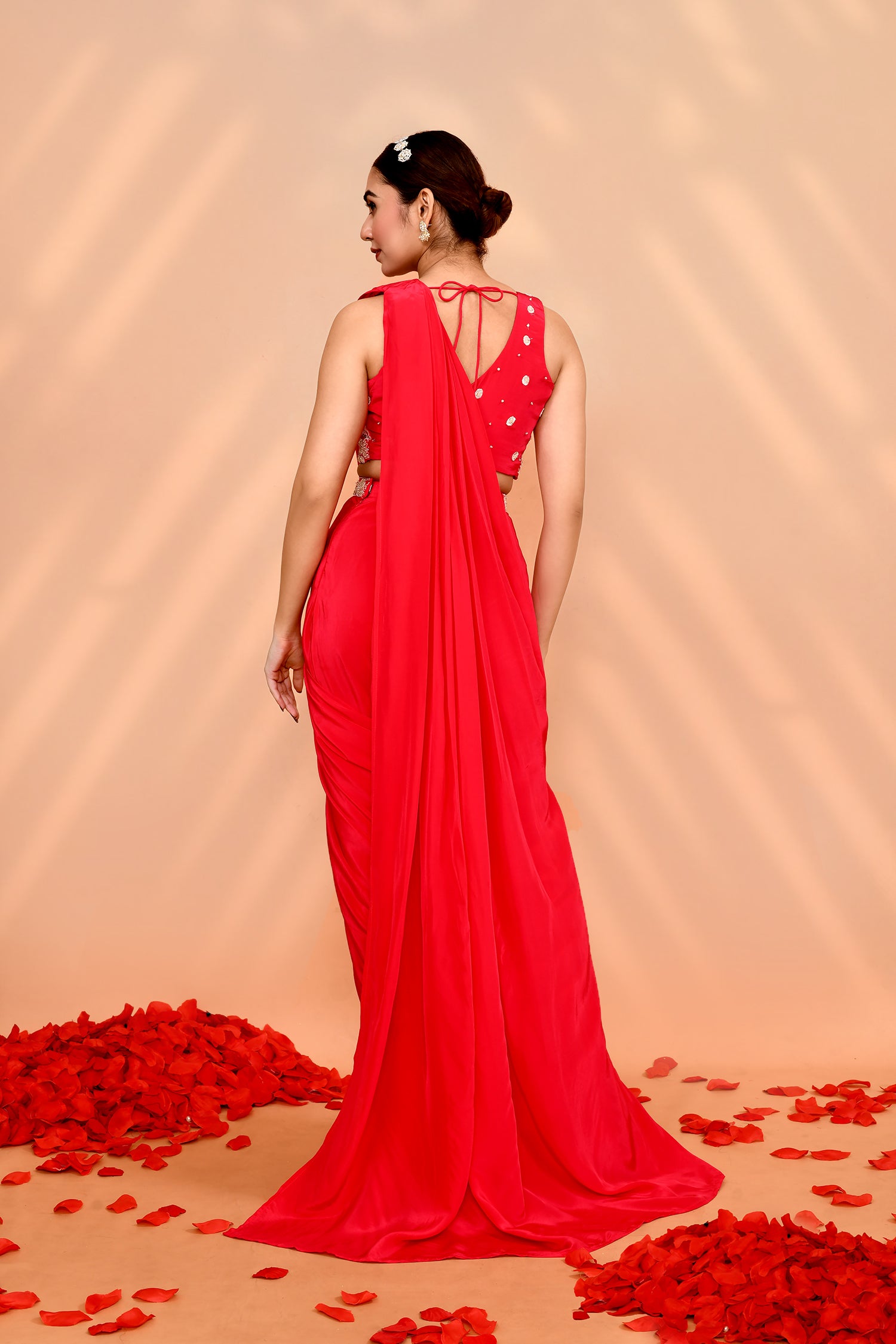 The reddish pink crepe silk draped saree with sequin work blouse with solid bottom for a stylish ethnic look with graceful appearance.