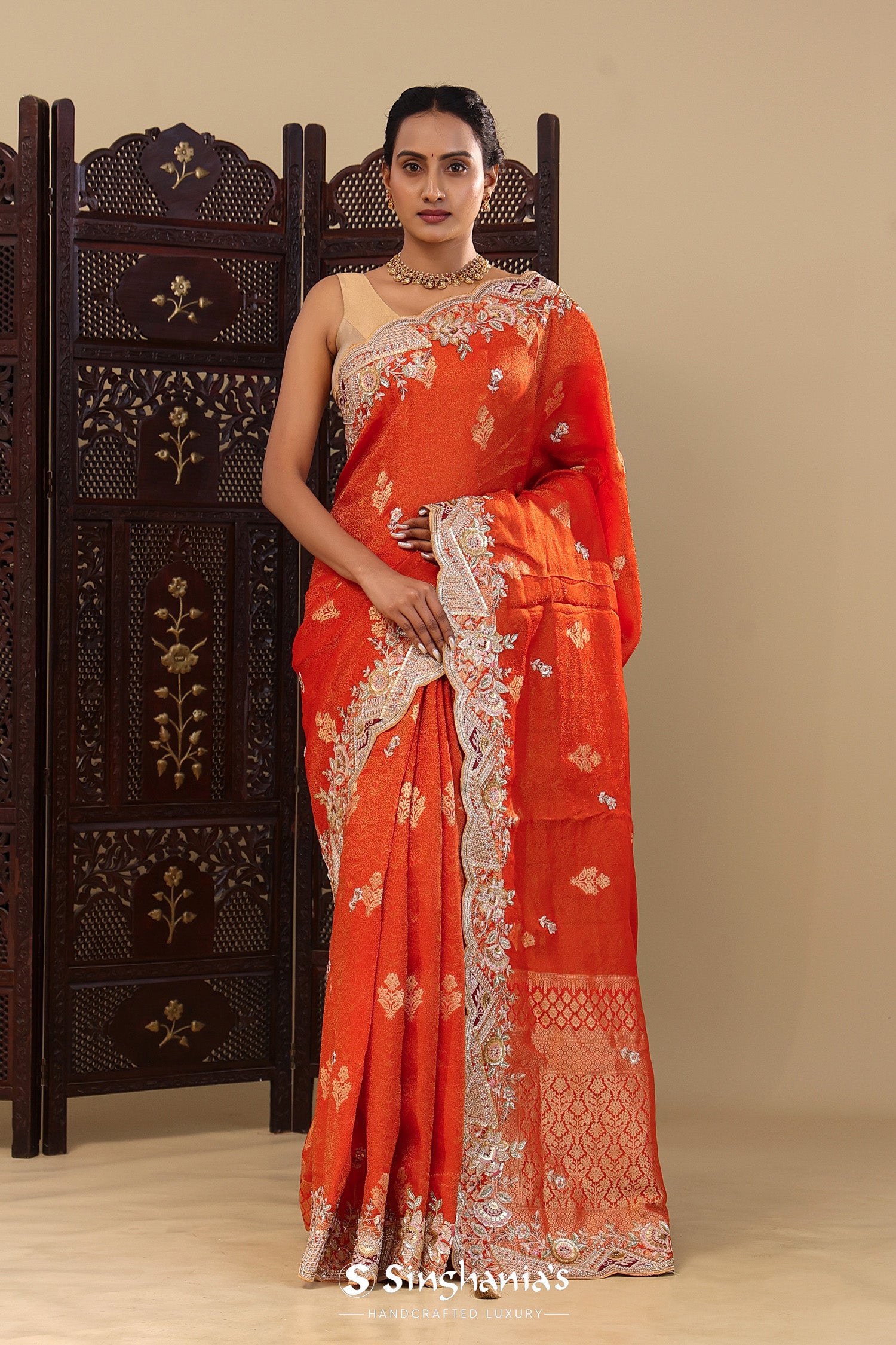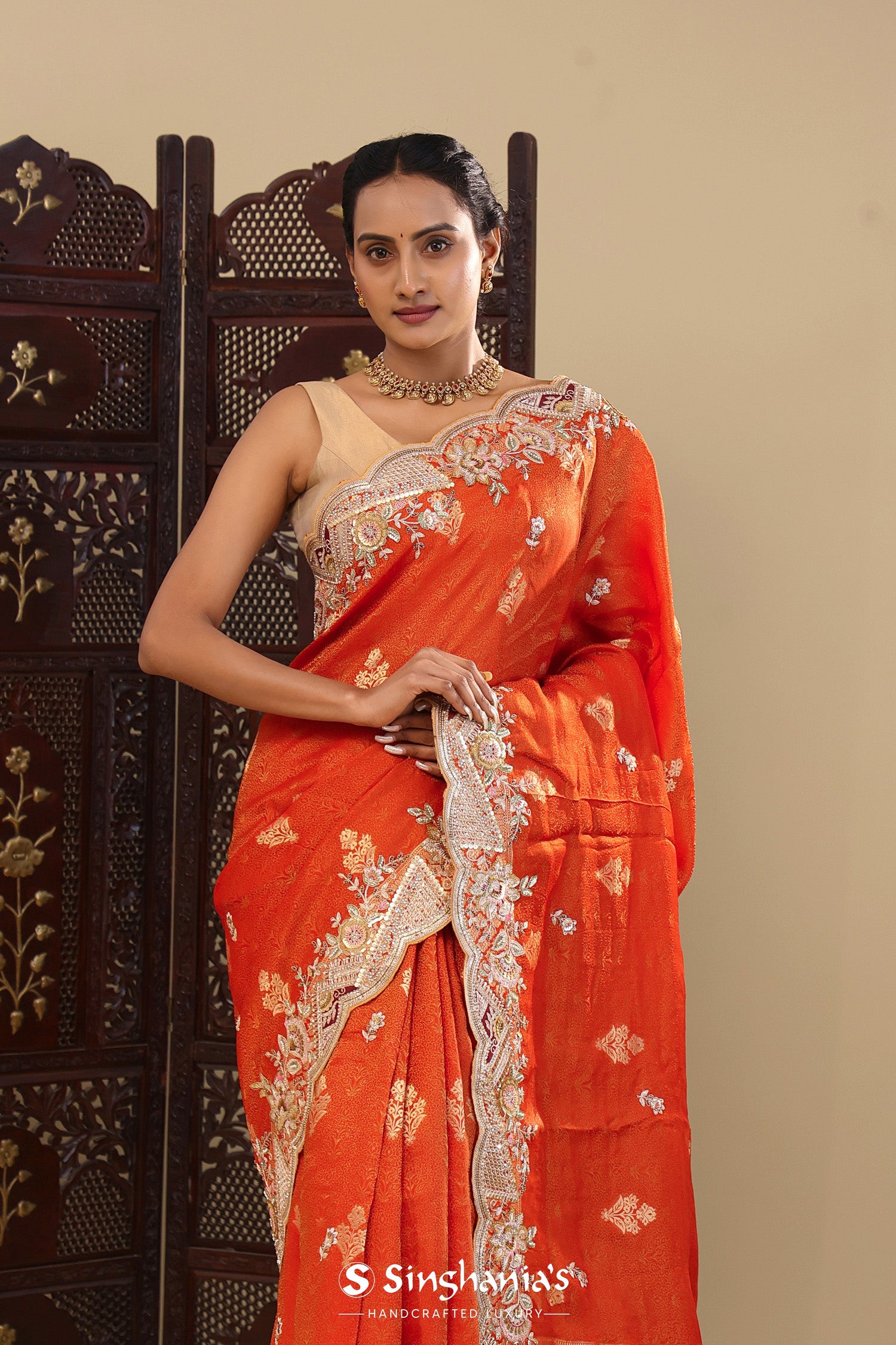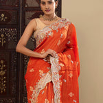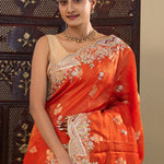 Vibrant Orange Tissue Saree With Scallop Border