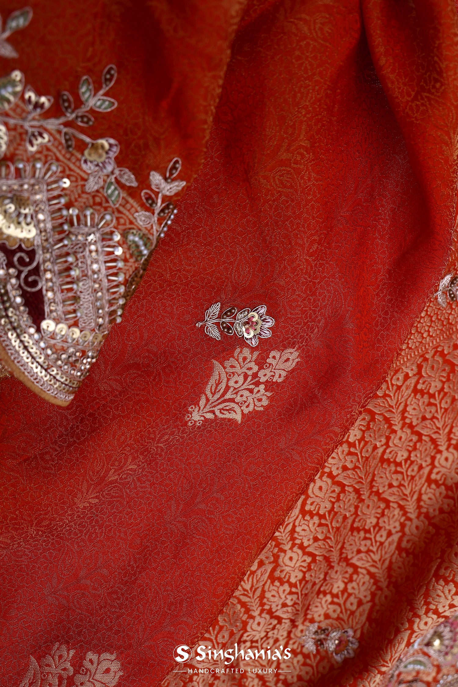 The floral design woven with gold zari scattered on the entire body complemented with scallop border adorned with sequins and zari embroidery