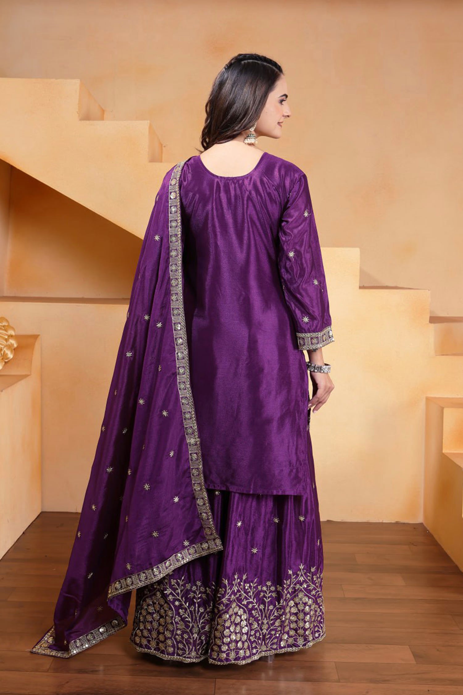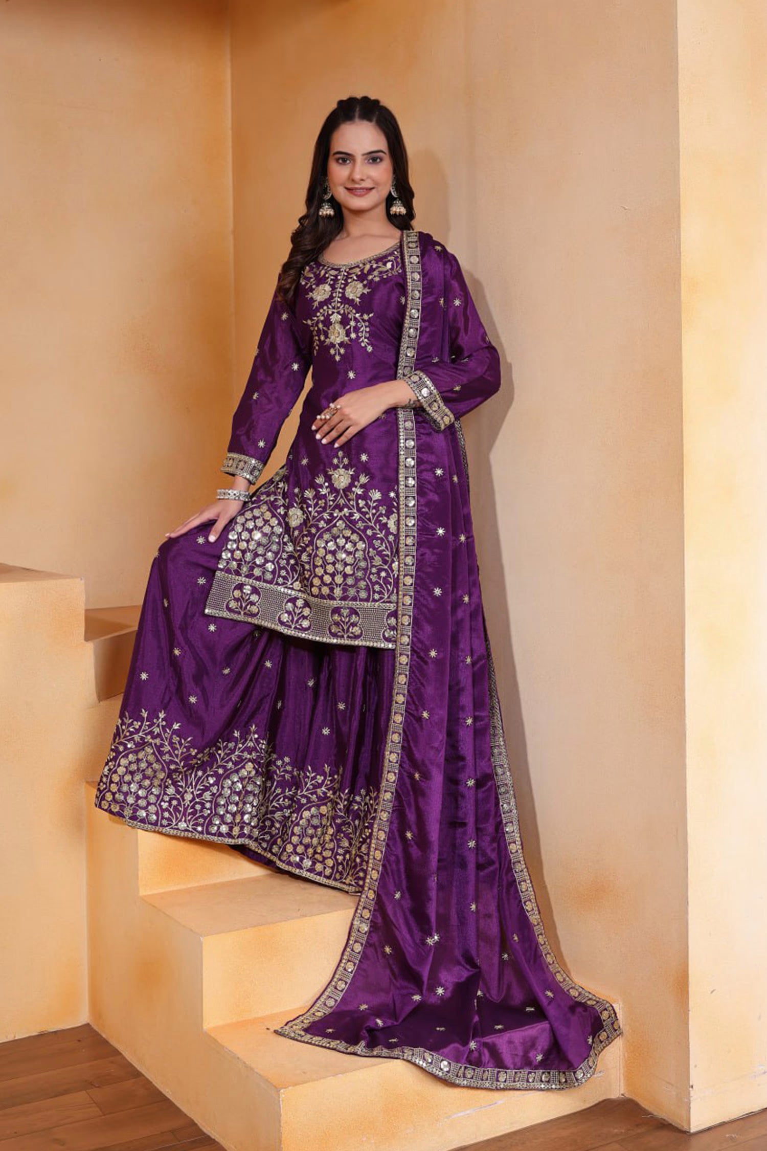 The dark purple silk sharara set with sharara and floral embroidered short kurta and dupatta for a stylish traditional look.