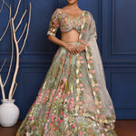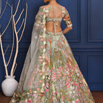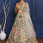 The fairy pastel grey organza lehenga with floral thread embroidery along with matching embroidered blouse and dupatta for a grand look with grace.