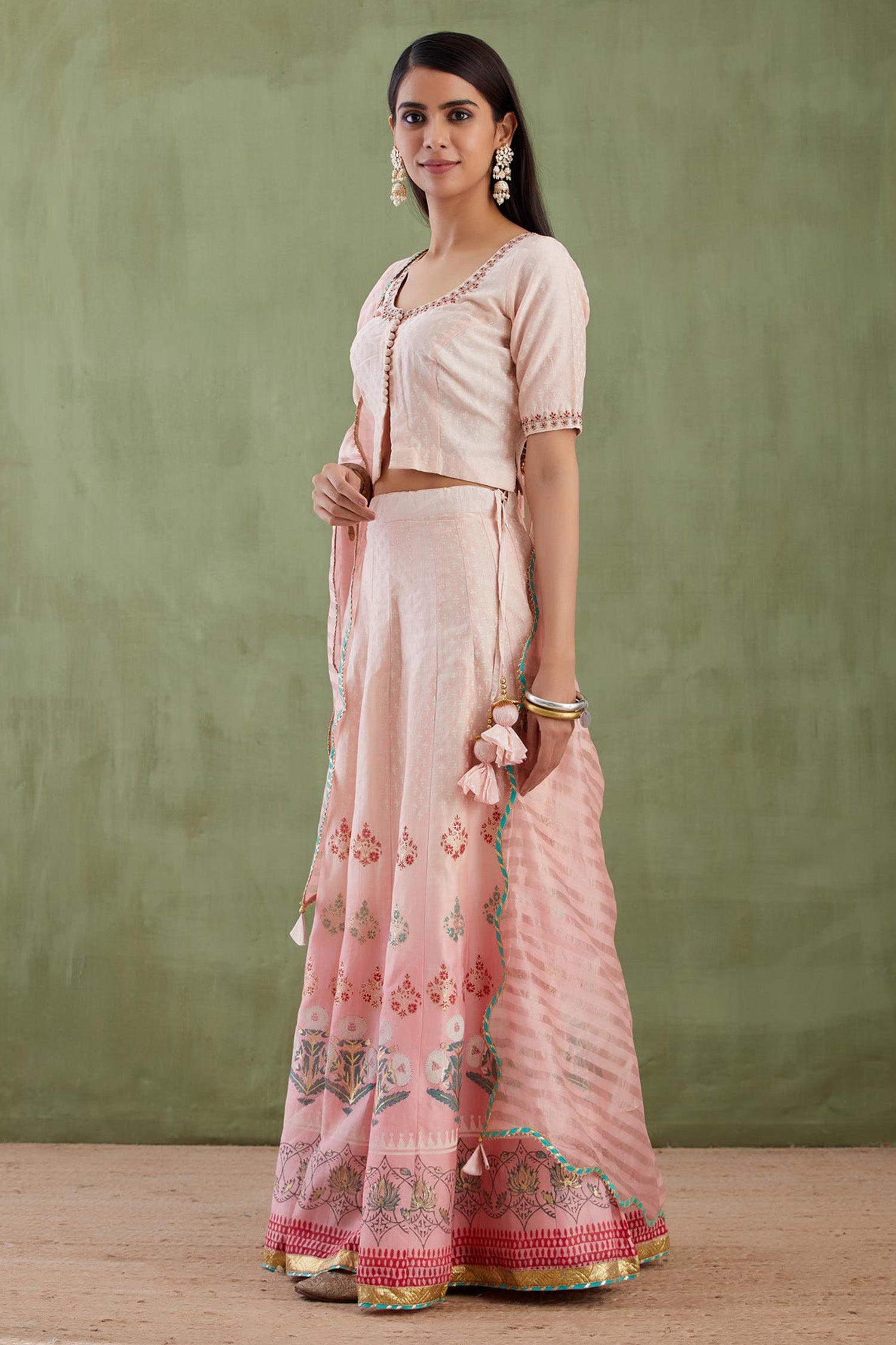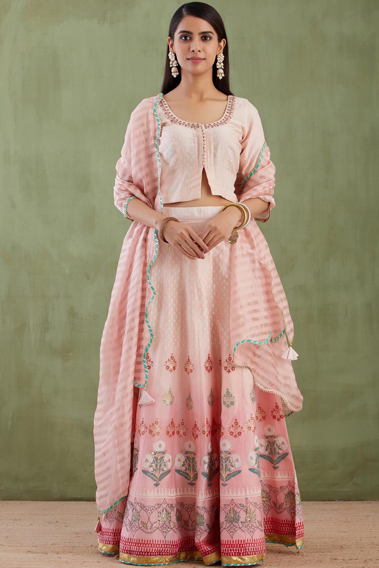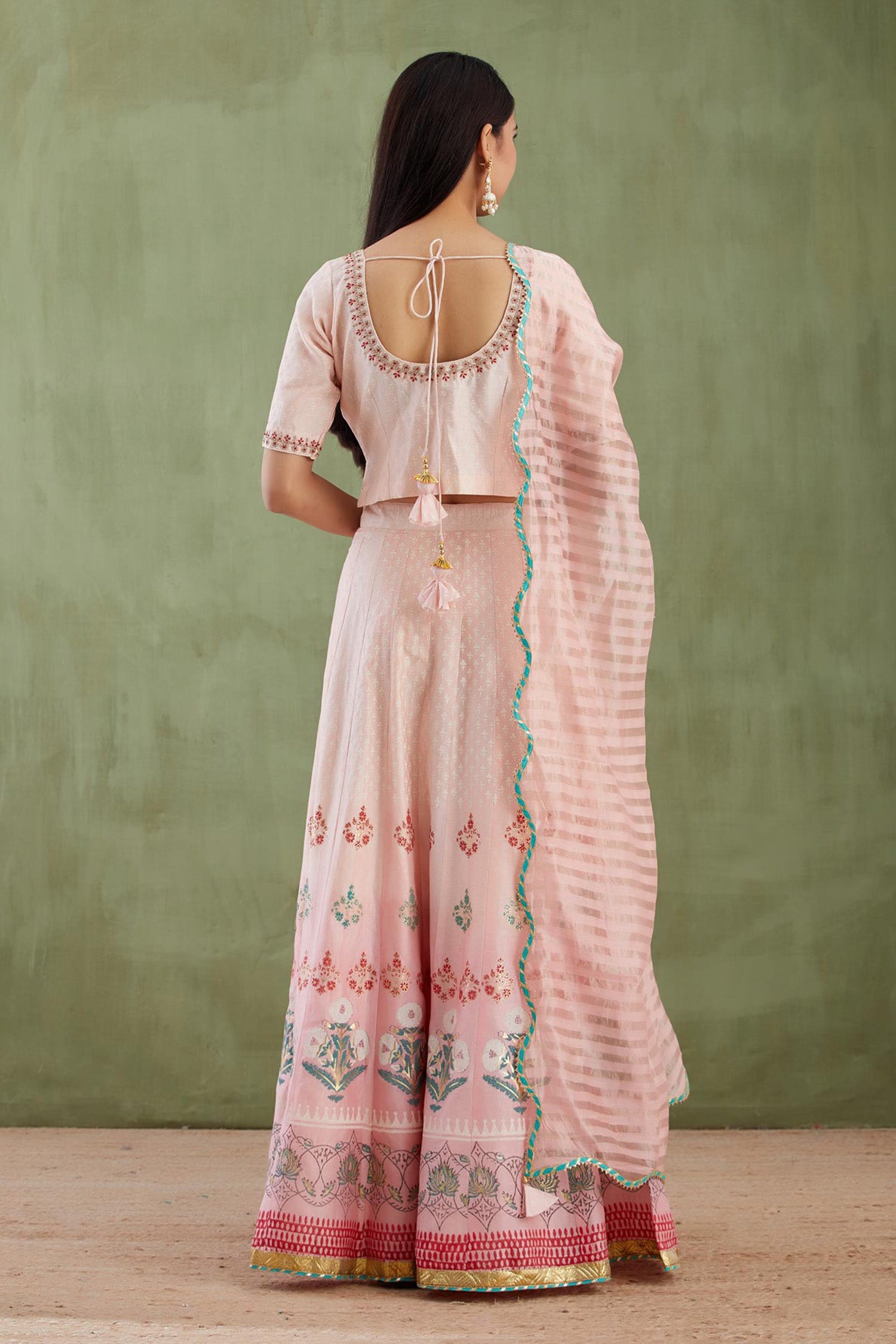 The light blush pink chanderi floral printed lehenga set with matching dupatta for a dignified look with ethnic touch.