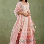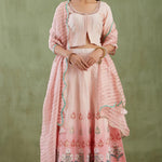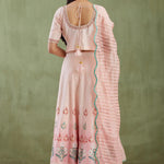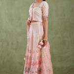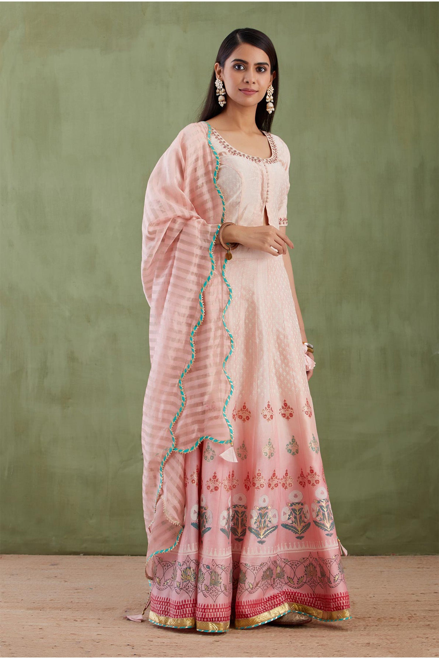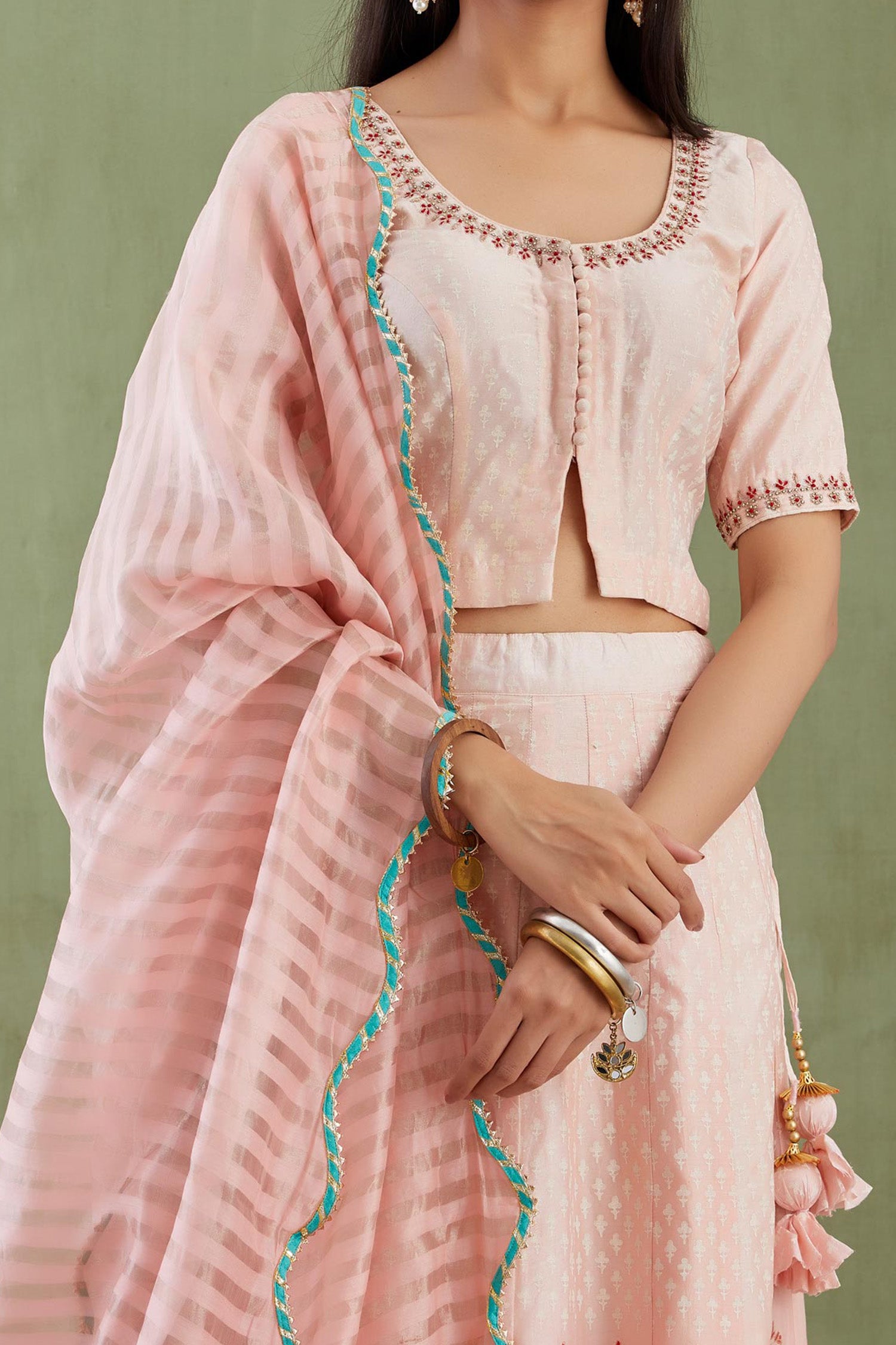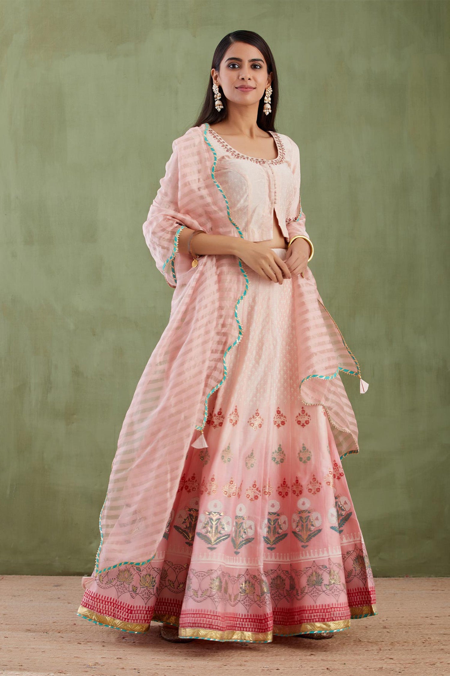 The light blush pink chanderi floral printed lehenga set with matching dupatta for a dignified look with ethnic touch.