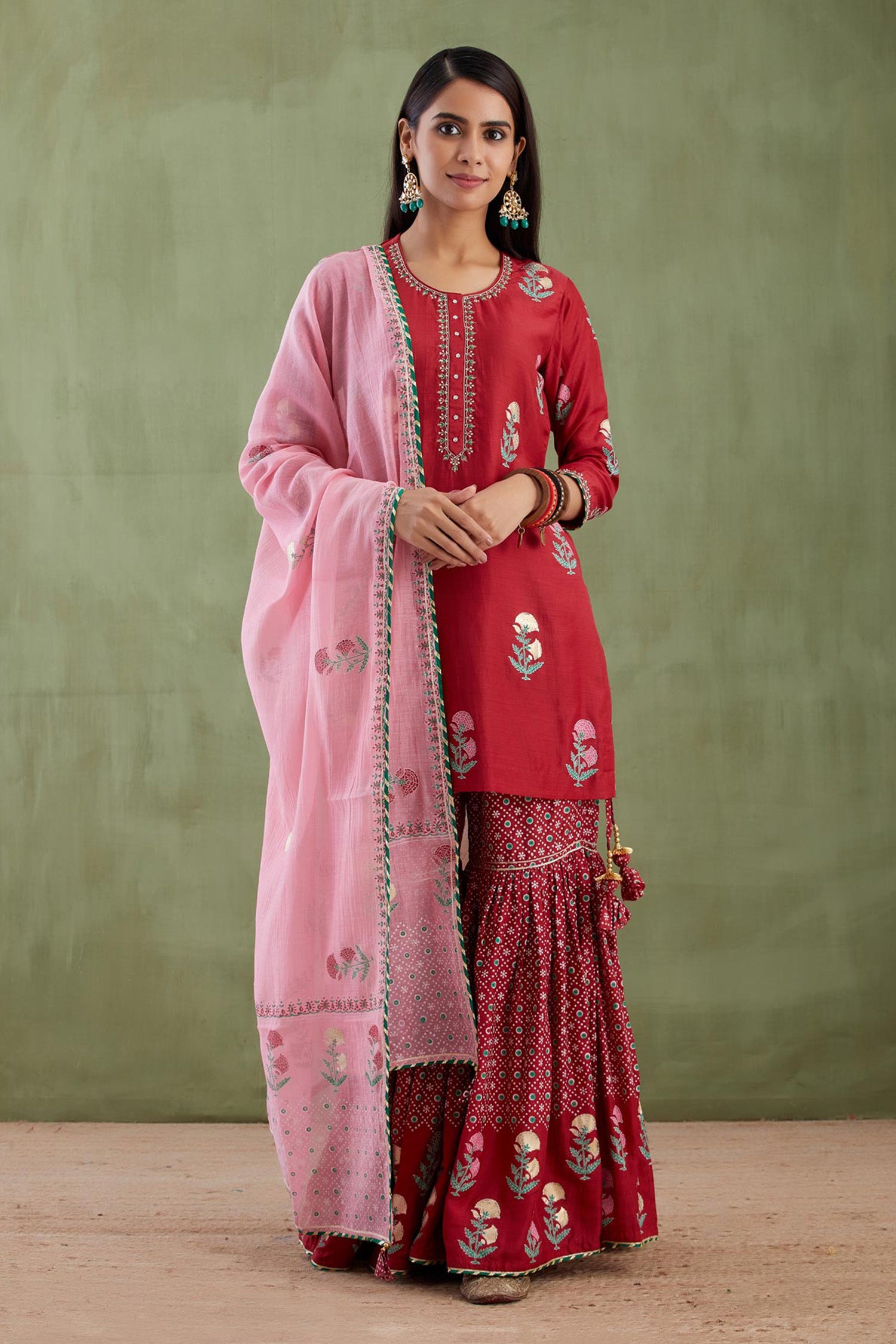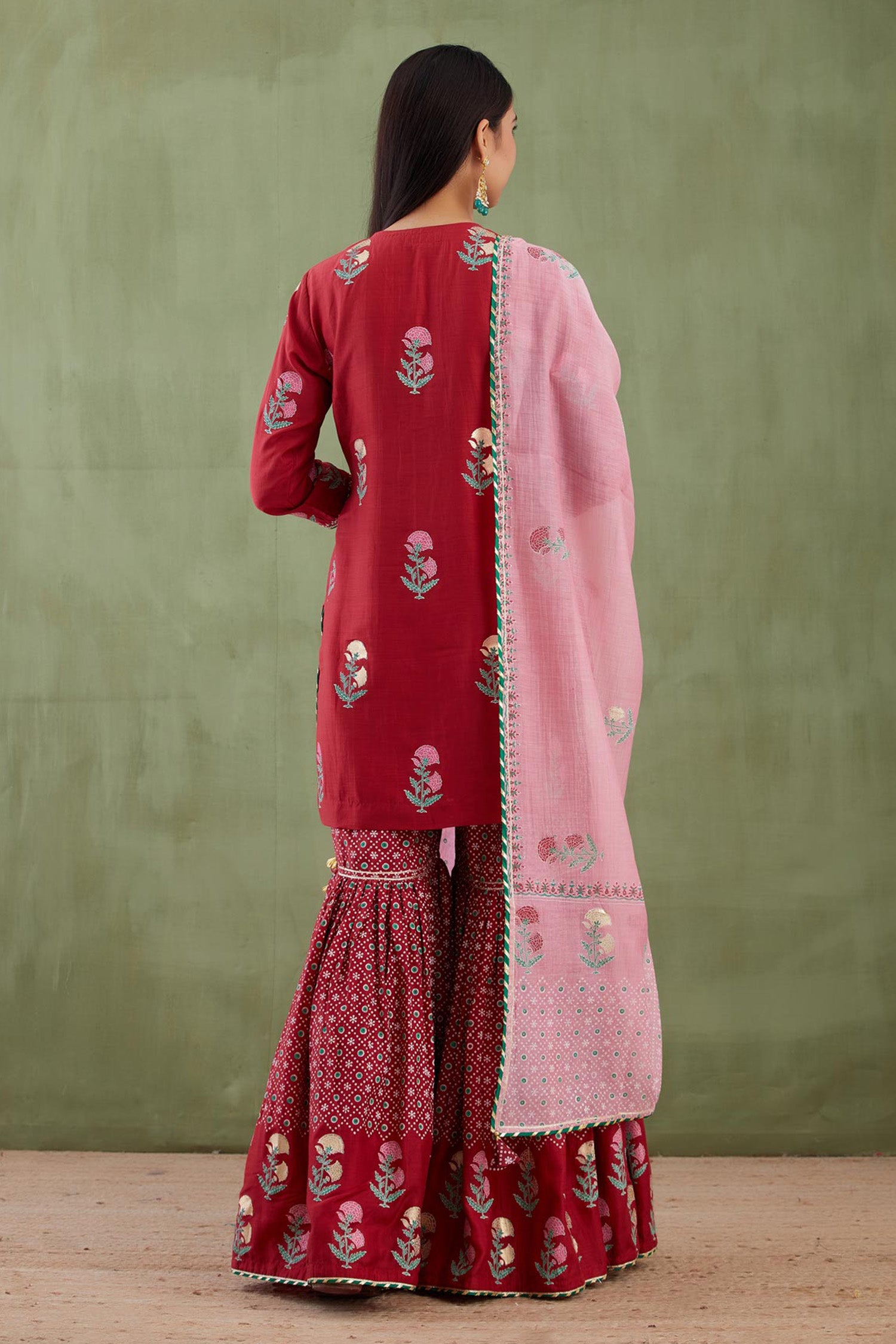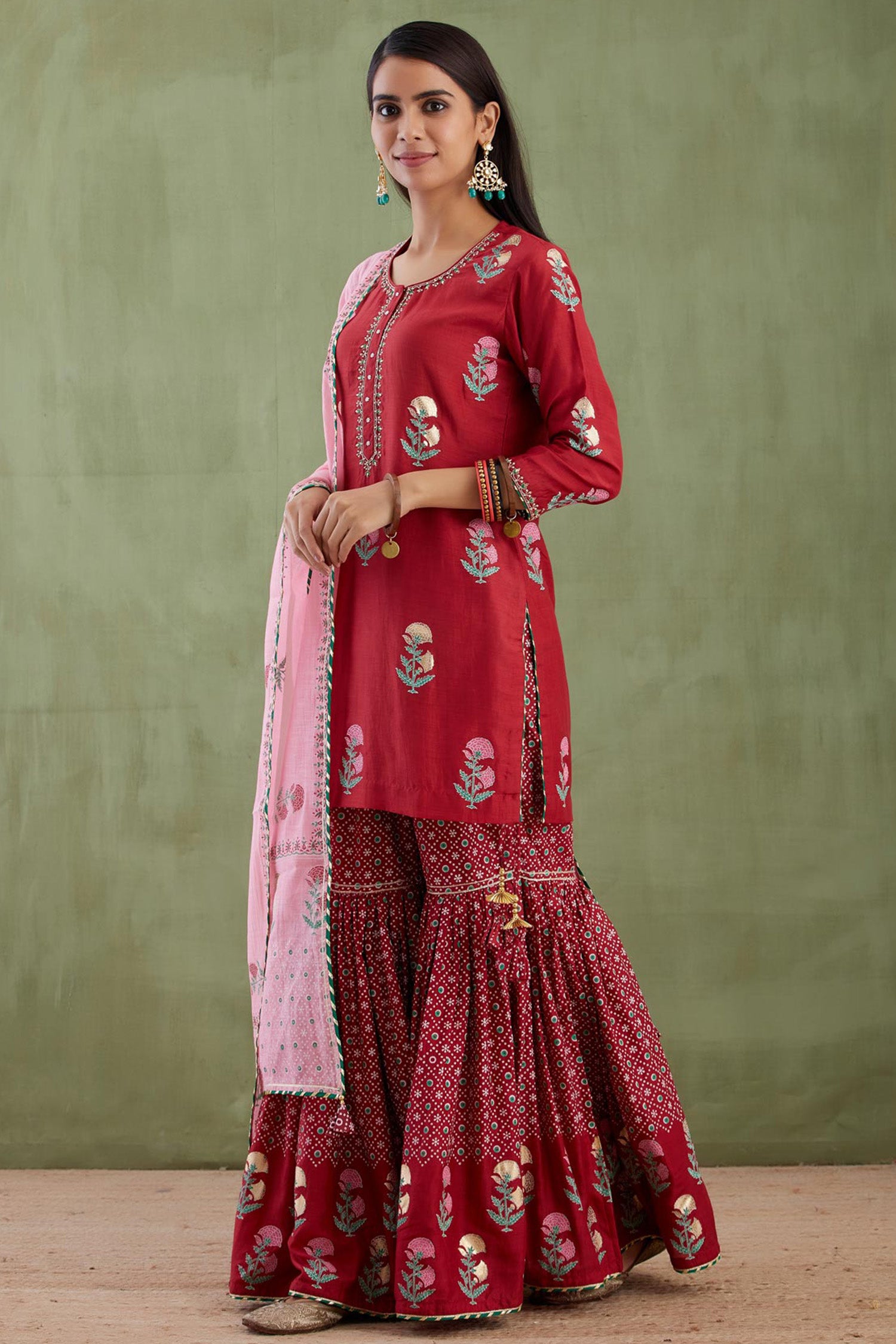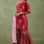 The ethnic maroon floral foil printed cotton silk kurti set paired with matching gharara pants and a contrast pink dupatta for casual to festive wear with an elegance.