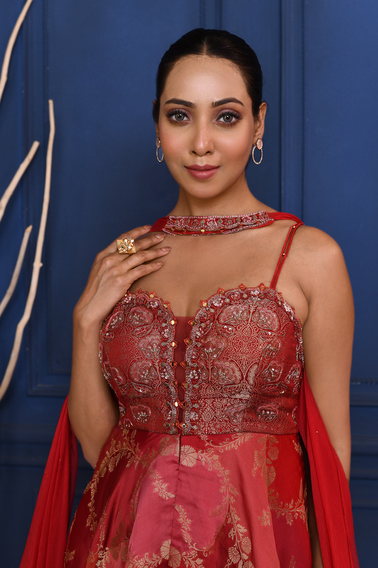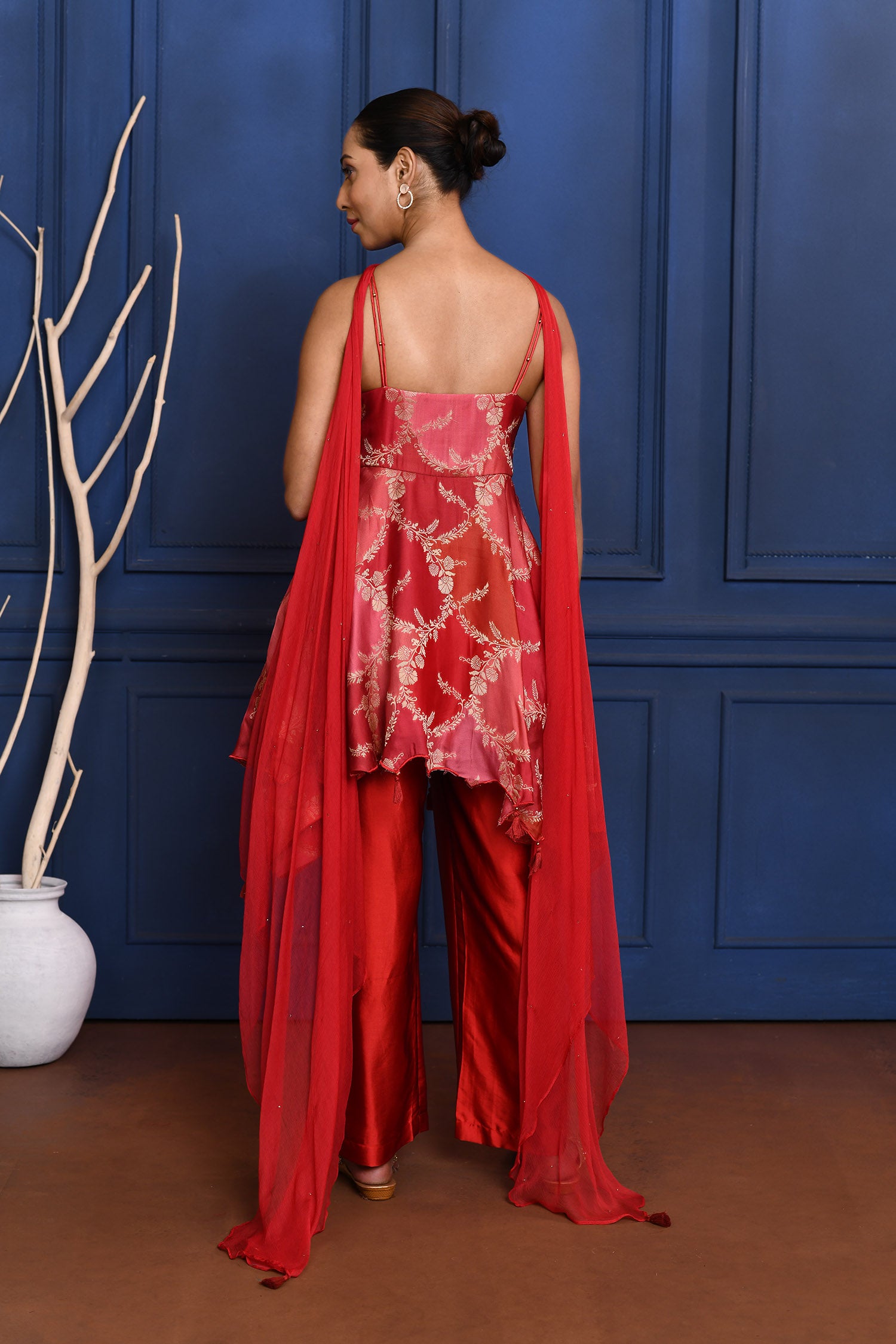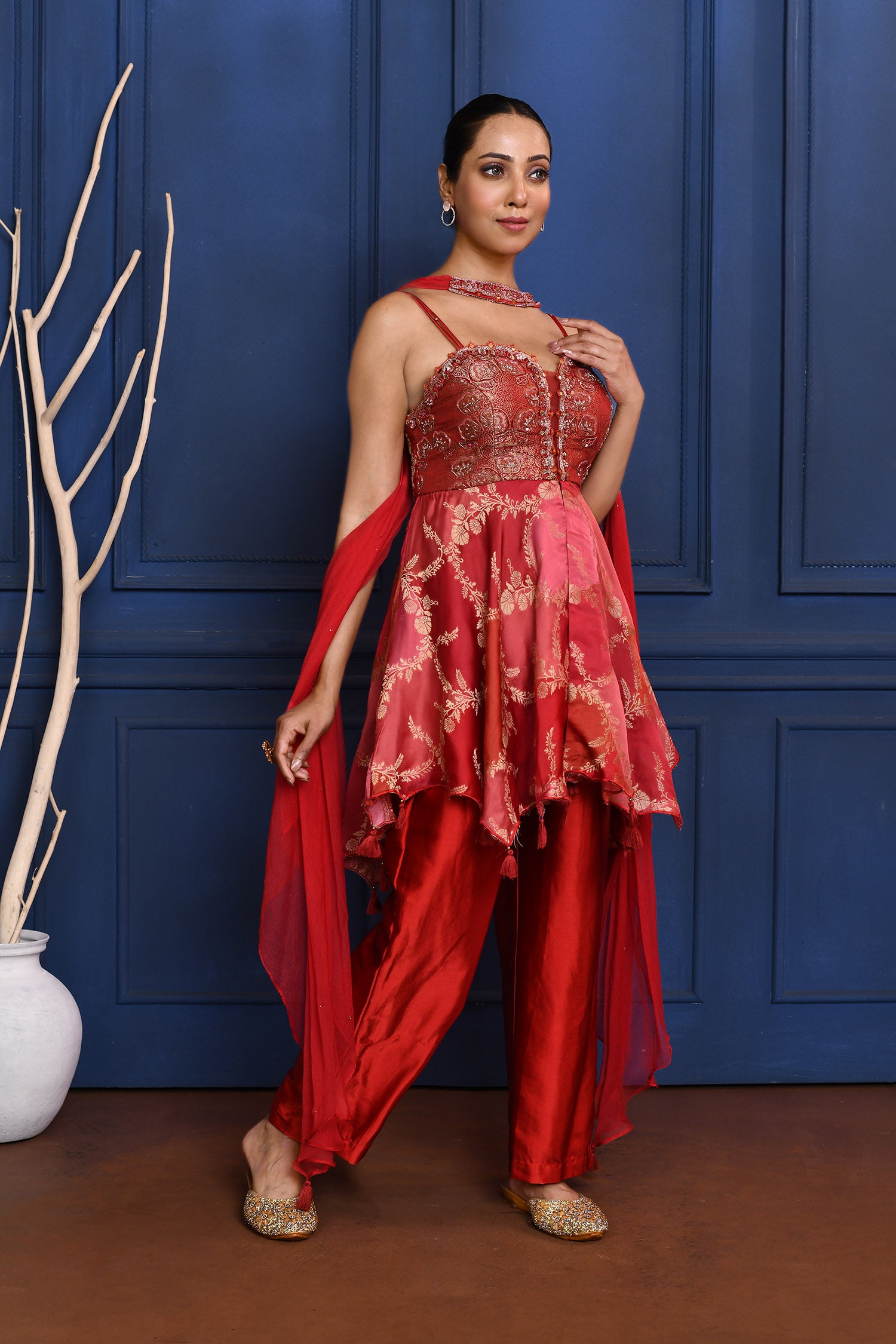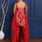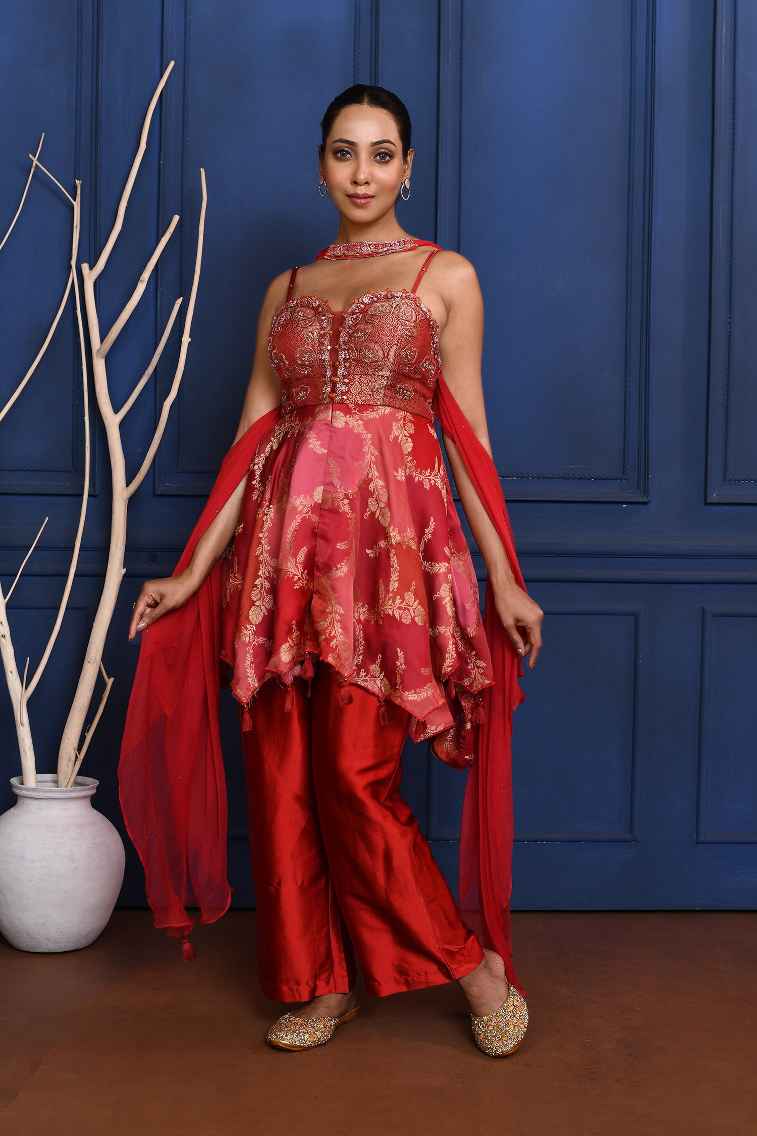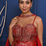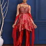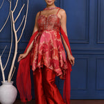 The rich scarlet red satin peplum with zari work and subtle embroidery along with chiffon dupatta and satin pant for a perfect blend of style and tradition.