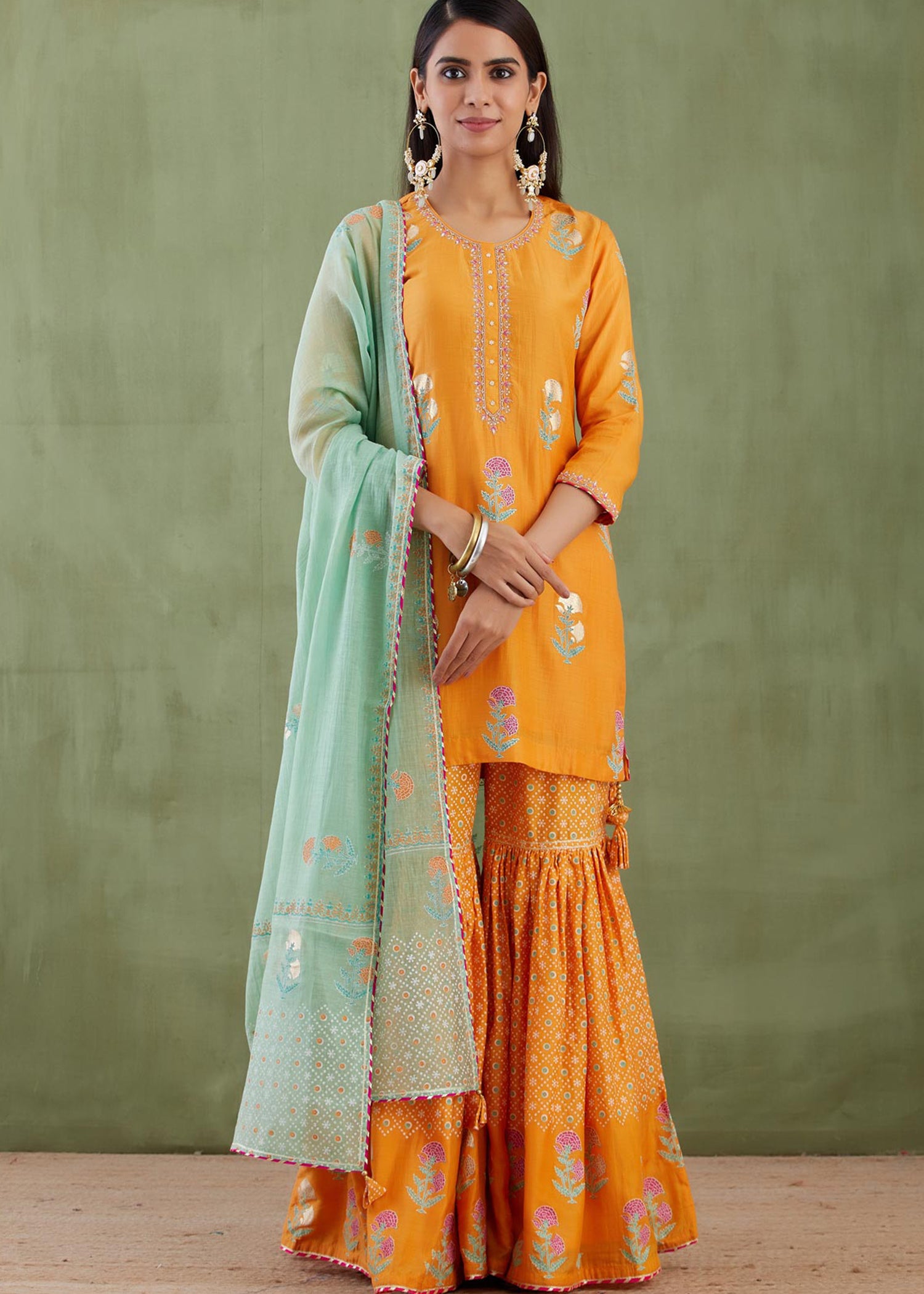 Orange Cotton Silk Kurti Set With Gharara Pants