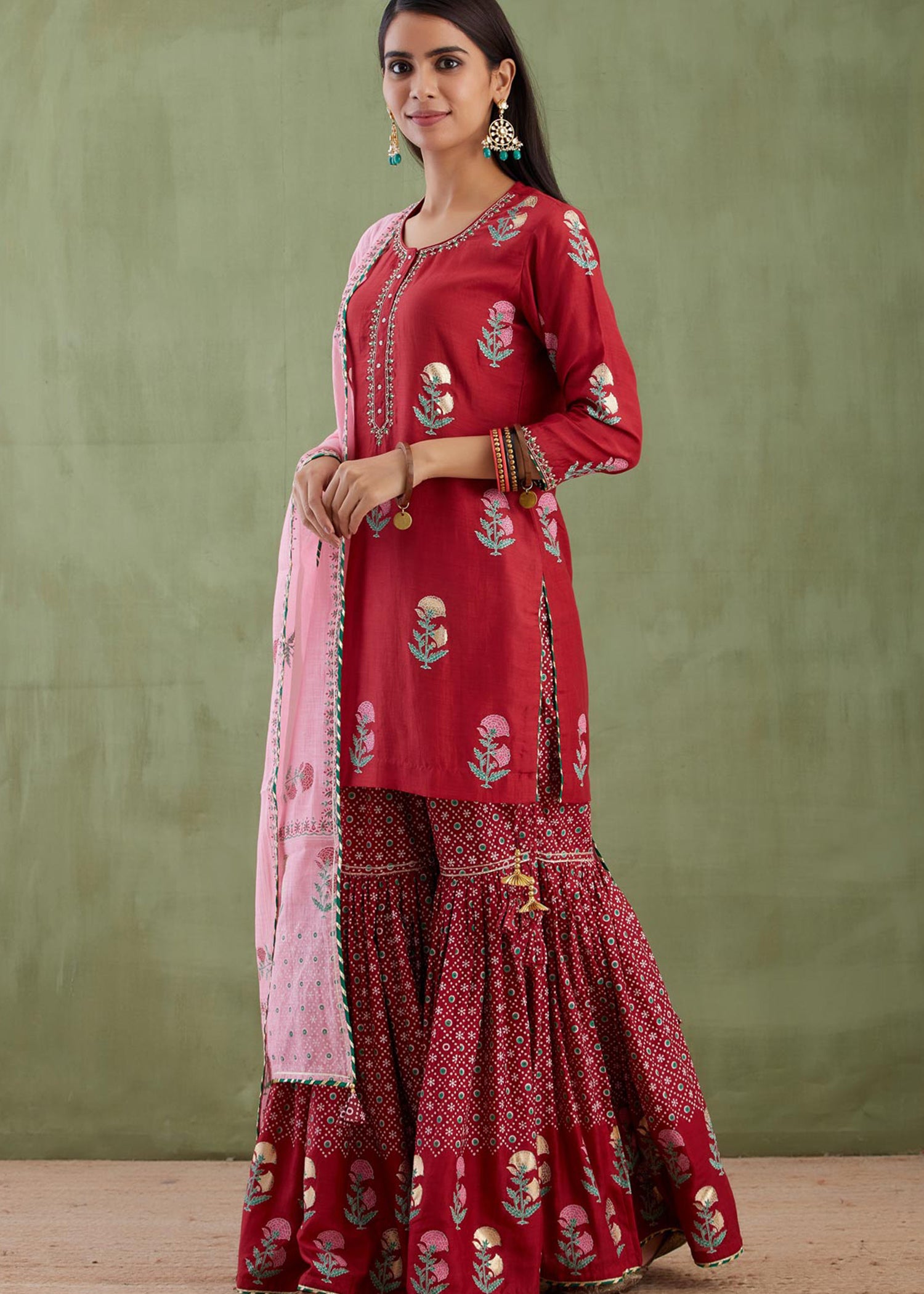 Maroon Cotton Silk Kurti Set With Gharara Pants