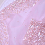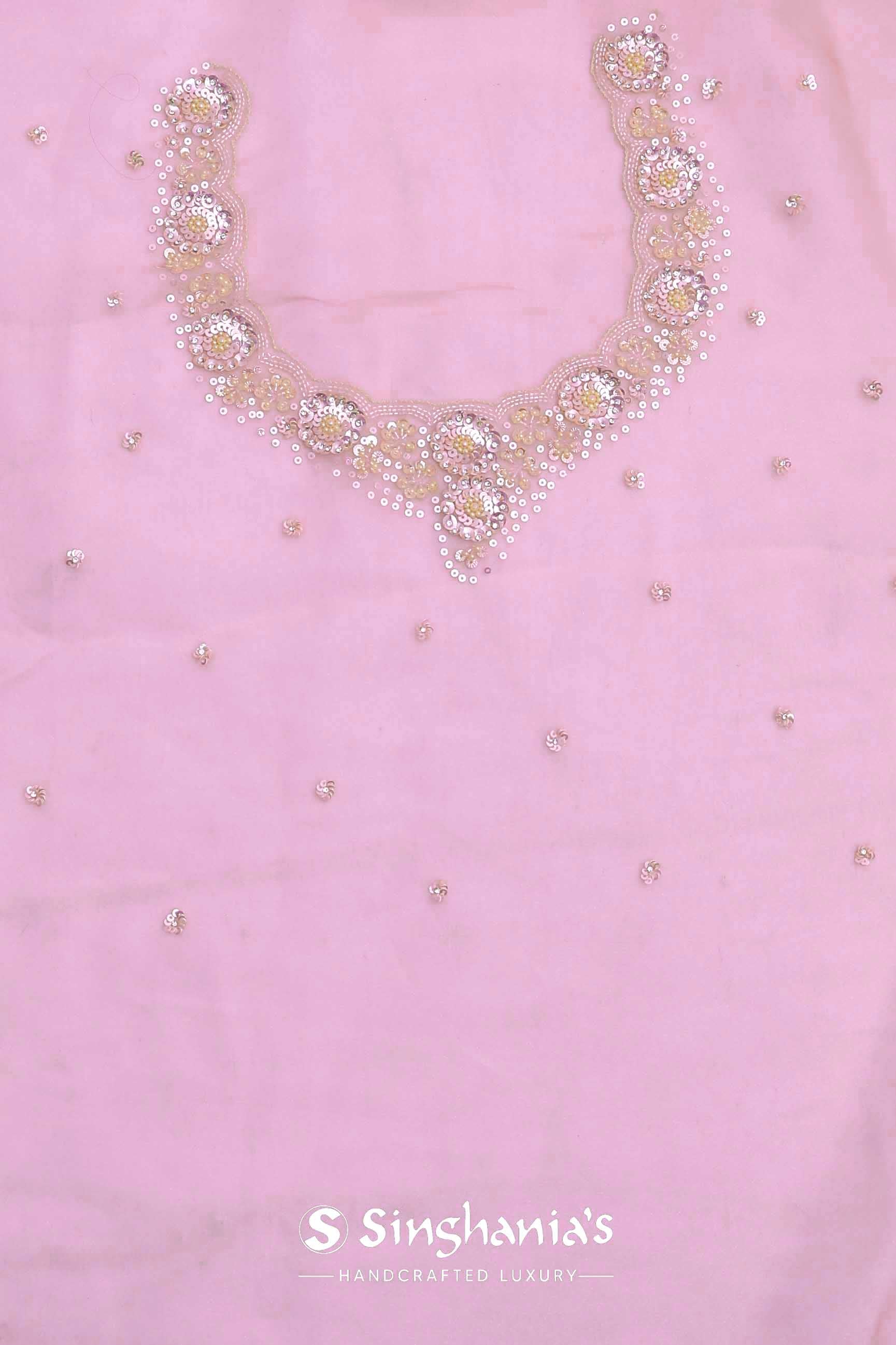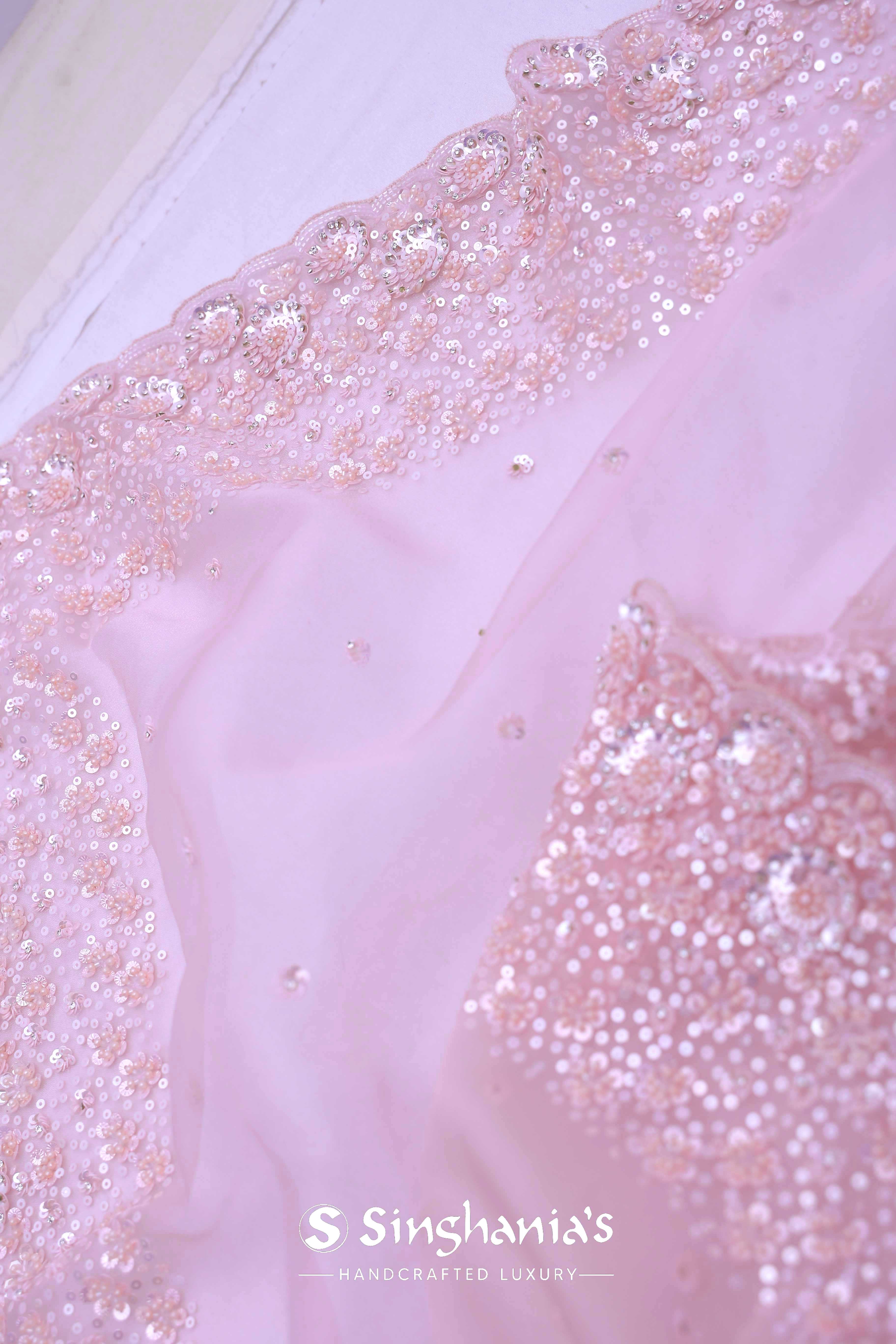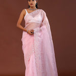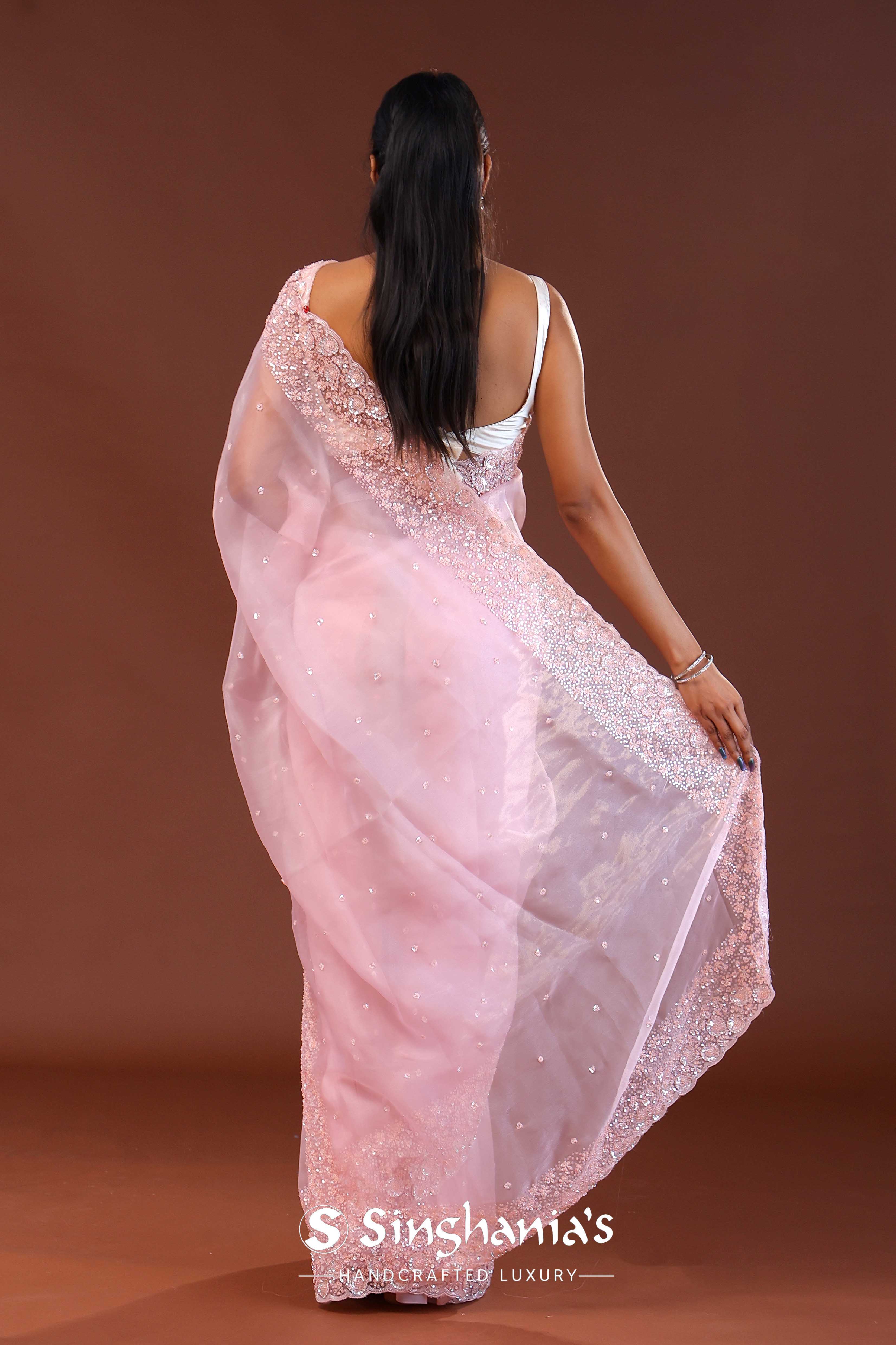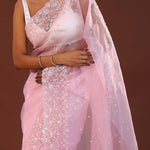 Classy look emitted by the organza base of the saree .This Baby pink organza saree with scallop border features sequins work acroos the border makes it stand out from other saree and making every moment picture perfect.
