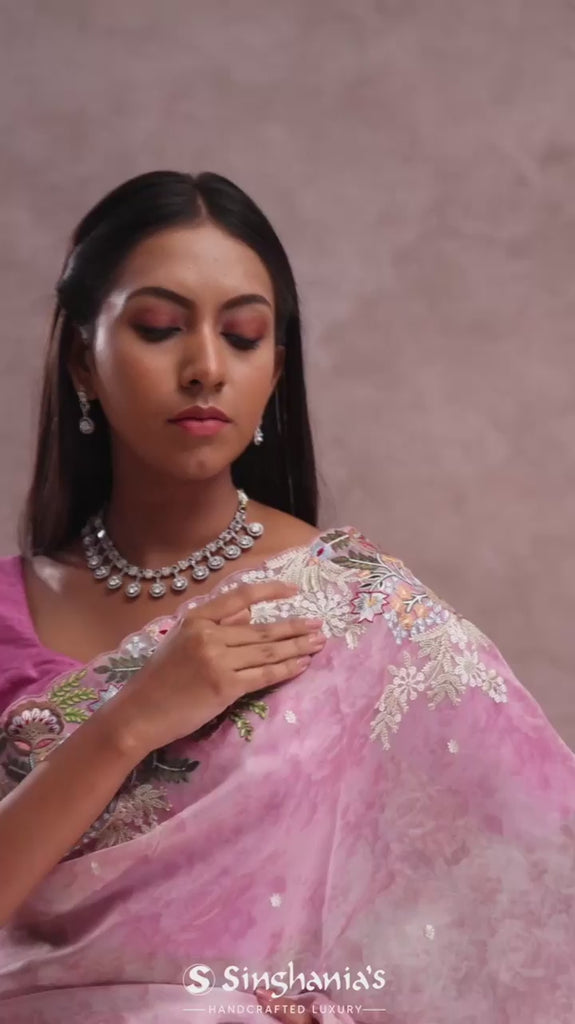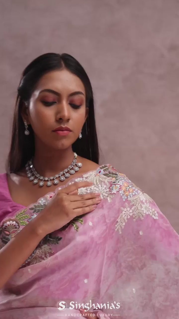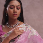 This blush pink organza saree features delicate embroidery and a graceful floral border, blending softness with timeless charm. Perfect for daytime events, festive gatherings, or intimate celebrations.