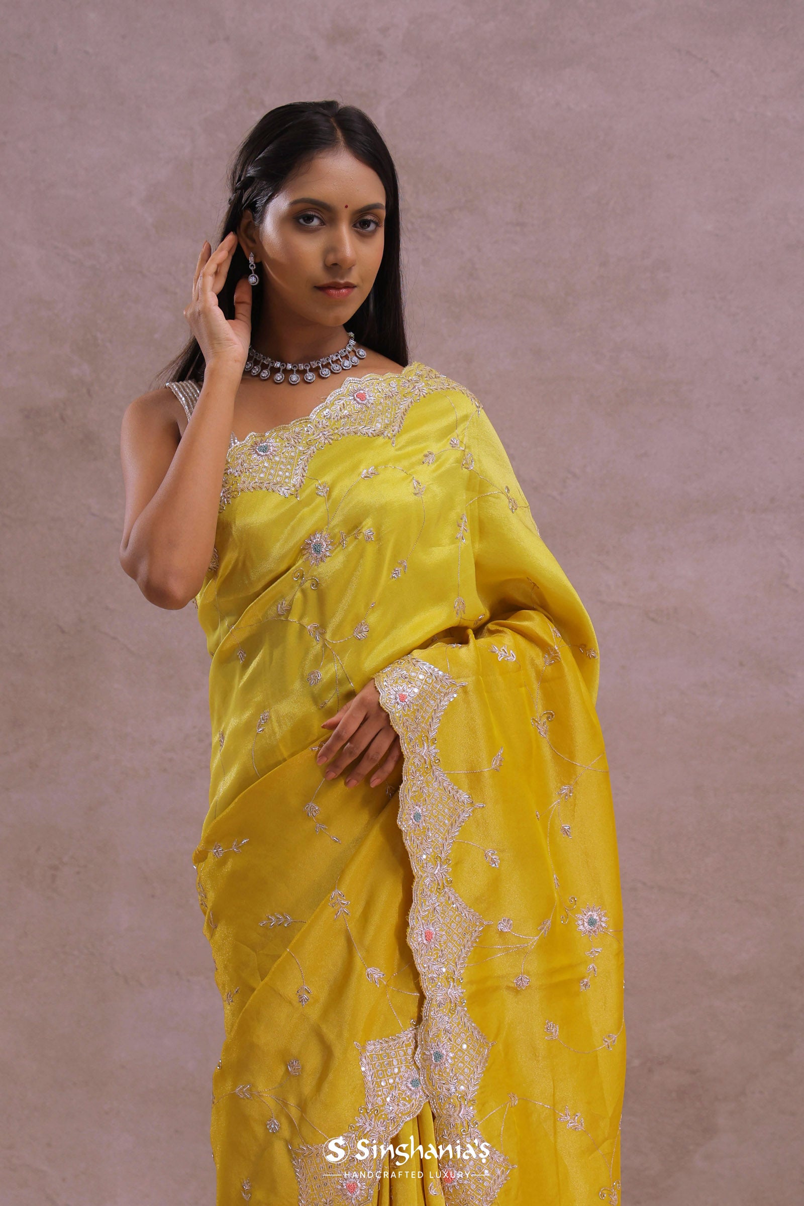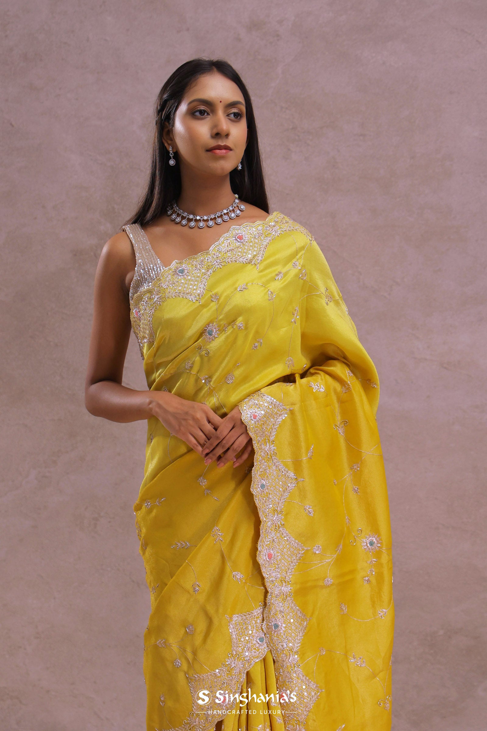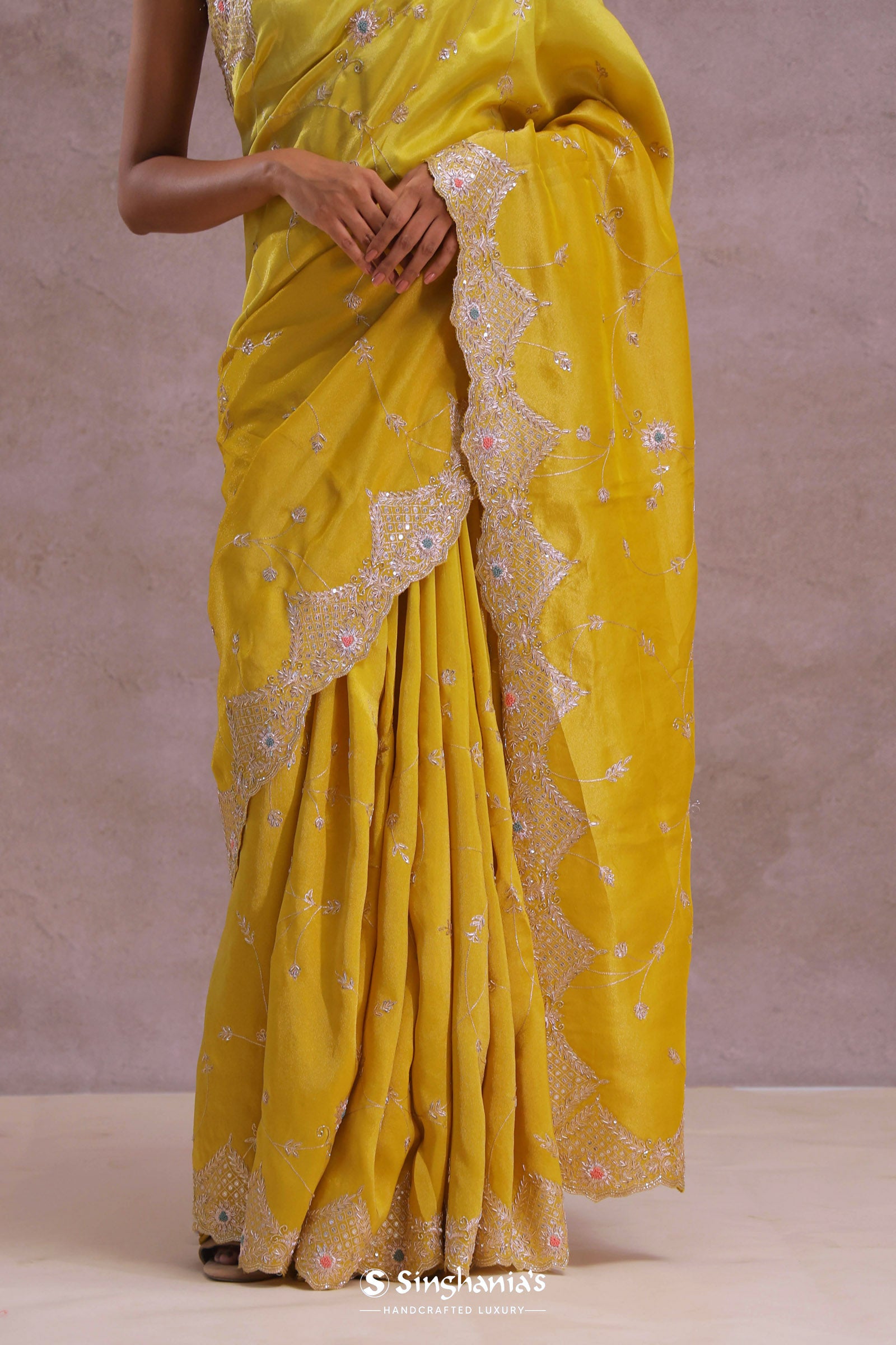Bright Yellow Organza Embroidery Saree With Scallop Border