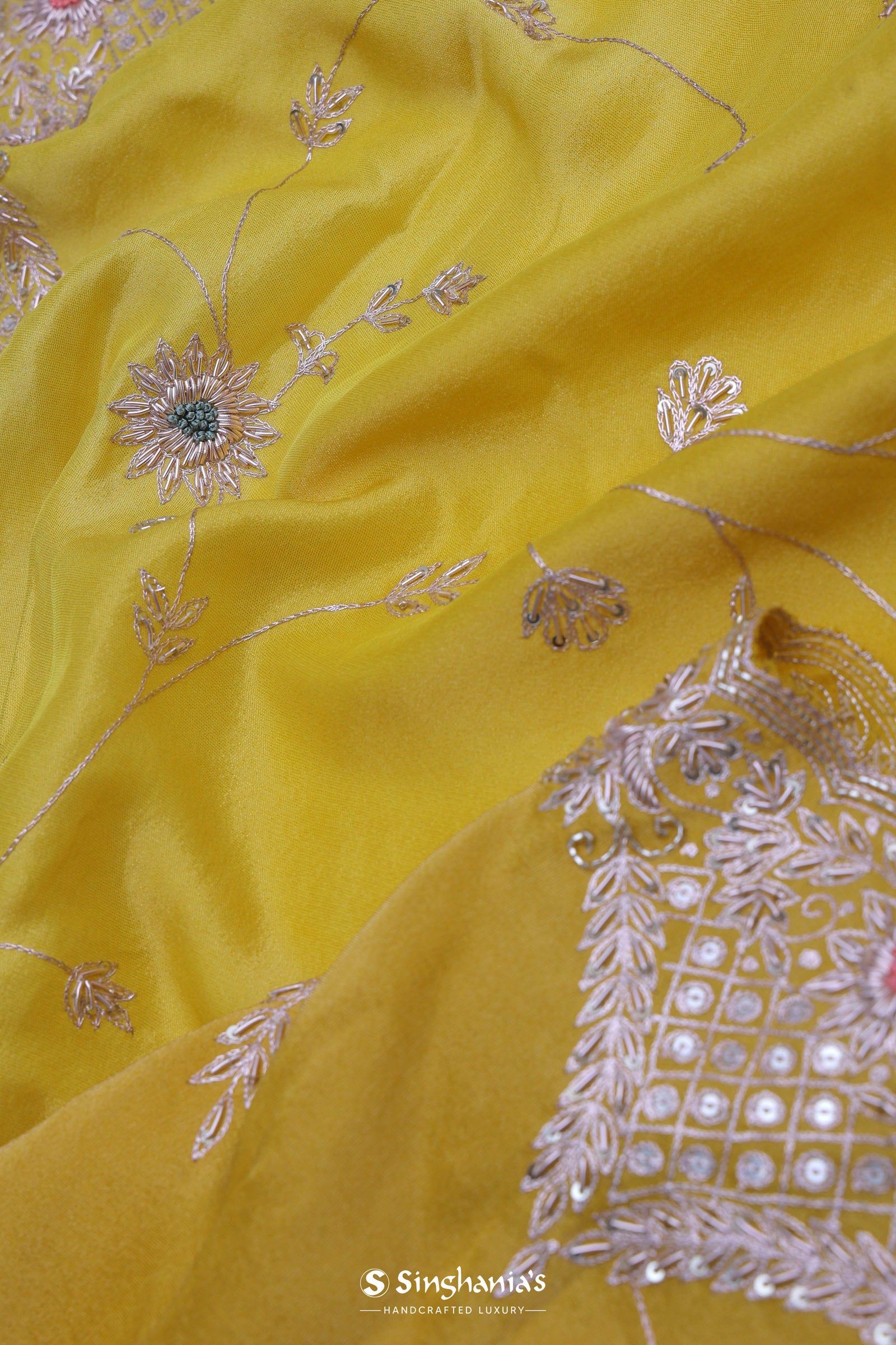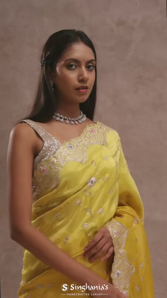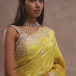 This bright yellow organza saree radiates vibrancy, with complex embroidery spread across the body, presenting kardana and French knot work for a textured, artistic touch. The saree is finished with a delicate scallop border which is adding elegance and charm