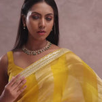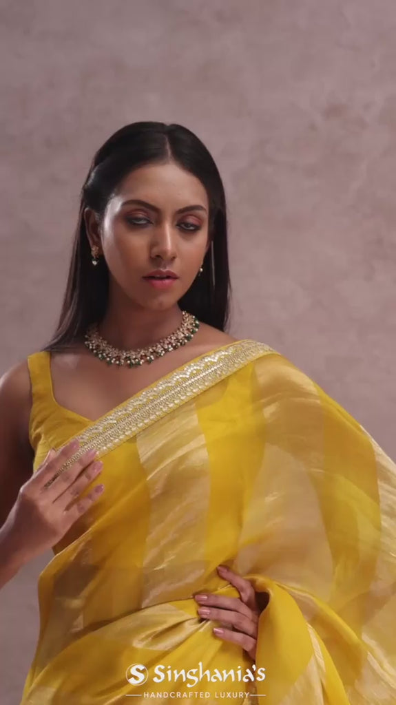 This dual yellow shade organza saree features a stunning blend of yellow and gold in sections of rich embroidery running across the fabric. The intricate detailing enhances the fluidity of the organza, creating a beautiful contrast between the vibrant yellow and the luxurious gold accents along with the border which has sequins work , perfect for a sophisticated and eye-catching look.