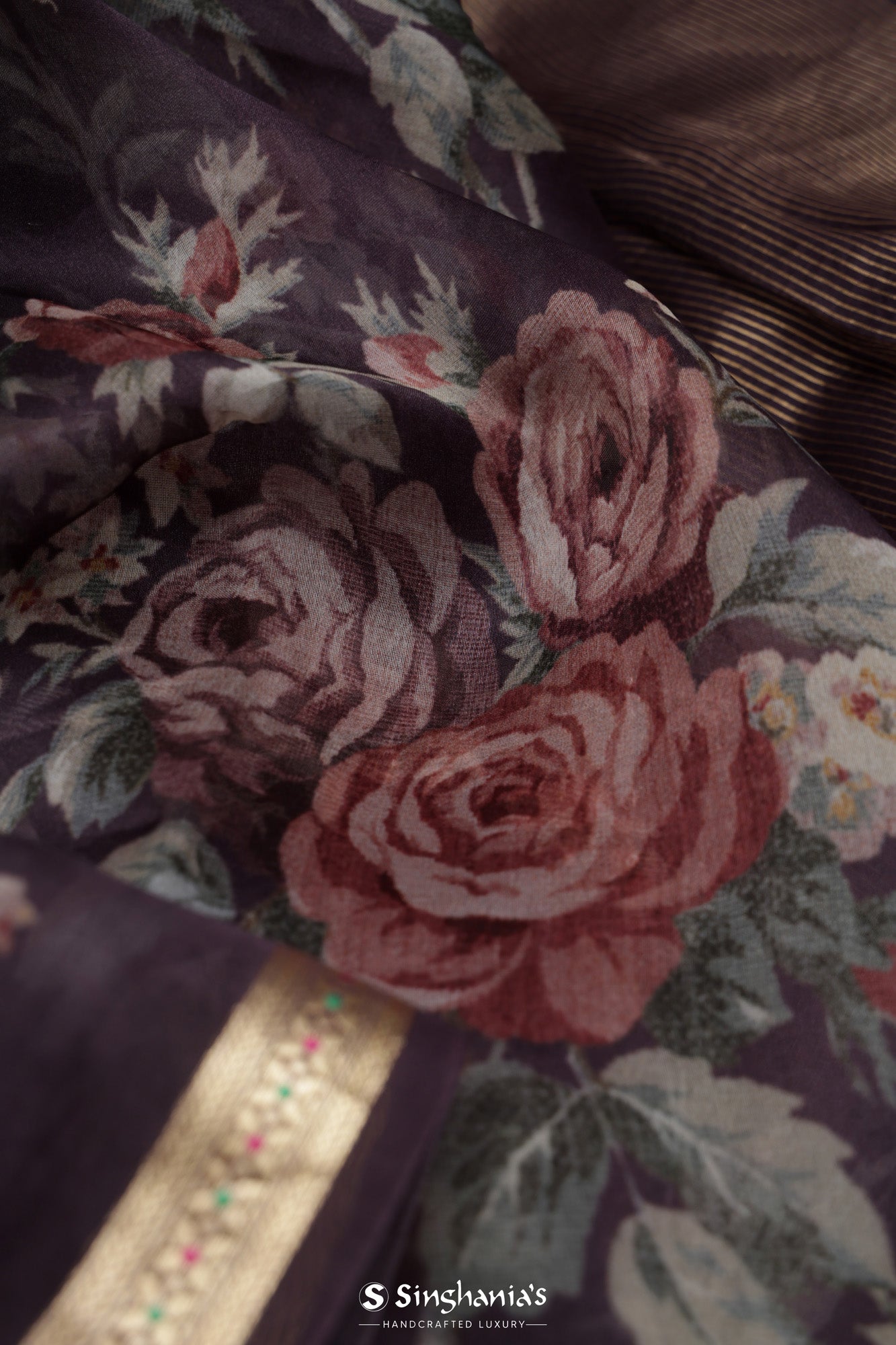 English Violet Printed Organza Designer Saree, ideal for festive, office, and wedding parties. Flaunts a floral jaal design, finished with a very small border edge- featuring gold and tilfi zari weaving.
