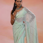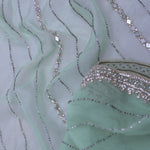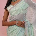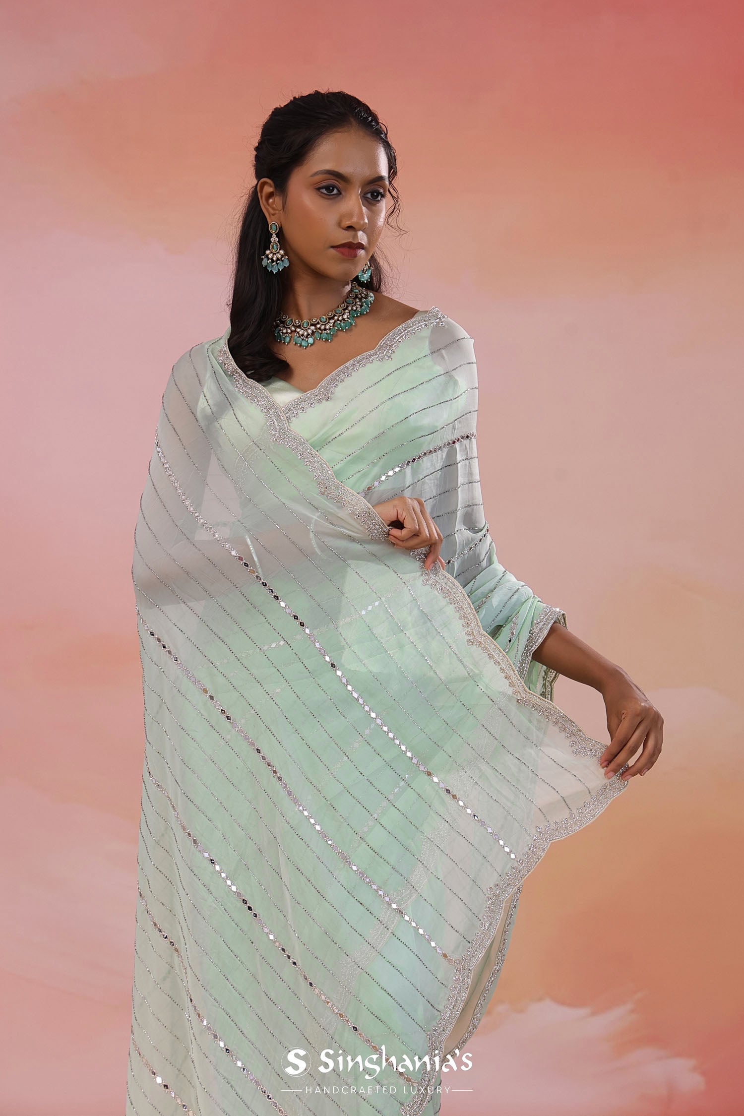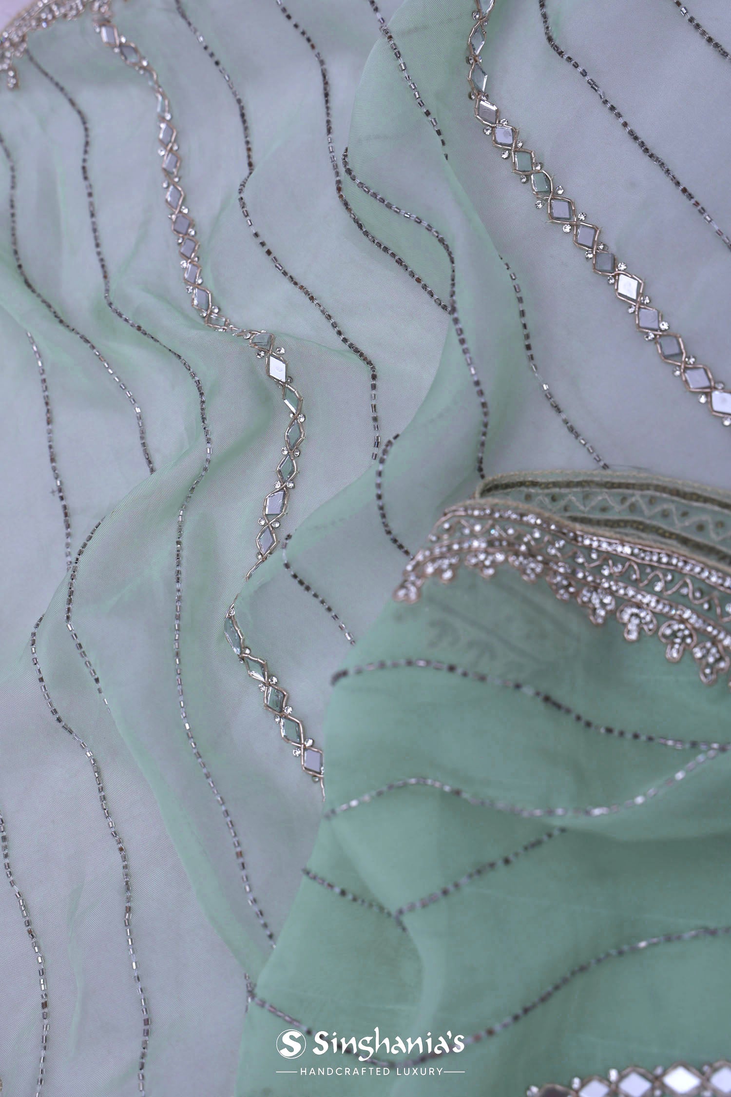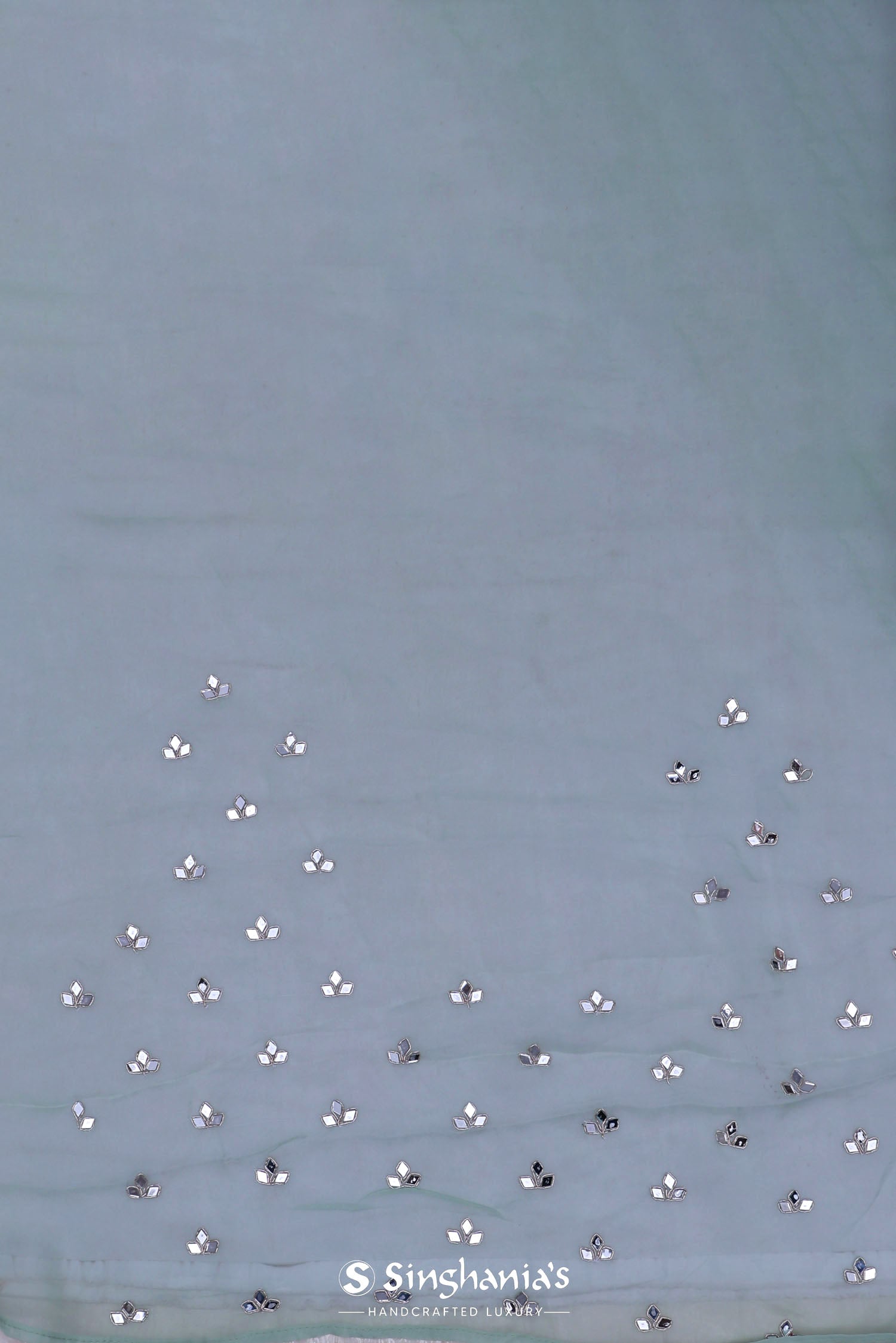 This Grayish teal organza saree features mirror, zardosi work forming a horizontal lines on the body along with scallop border making it ideal choice for traditional occasions