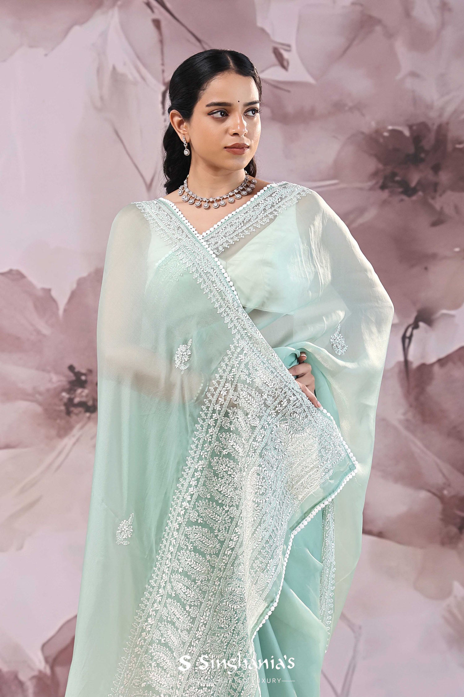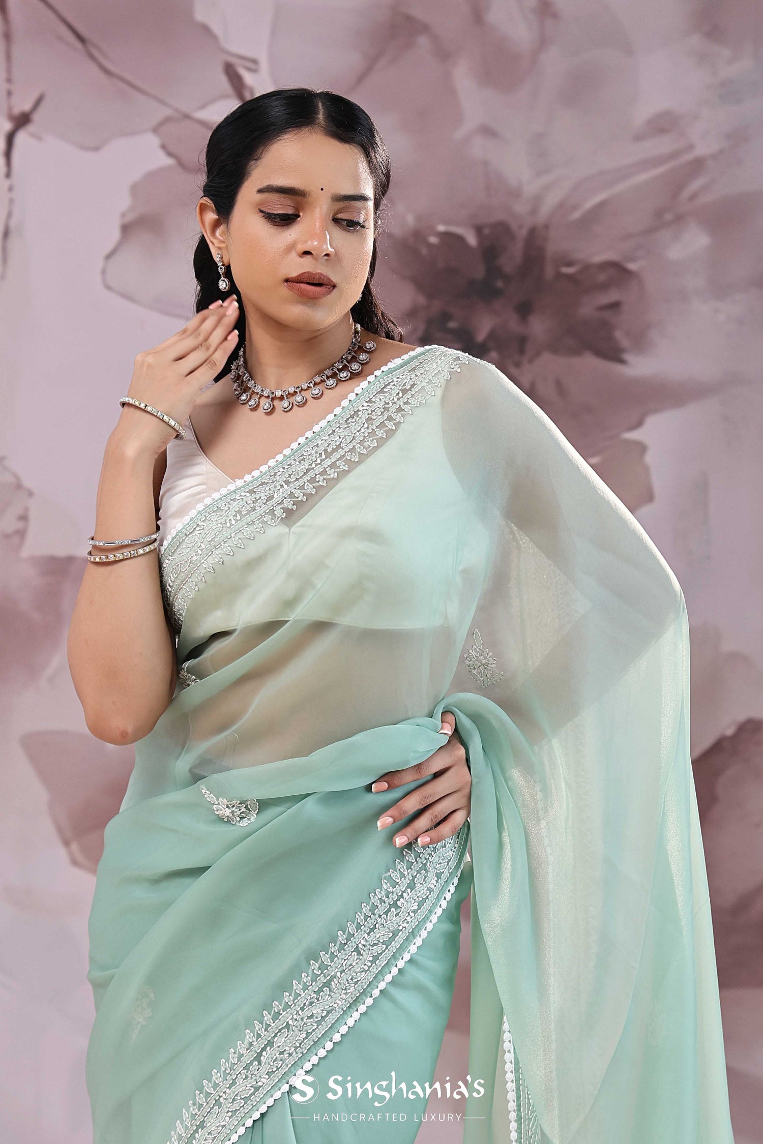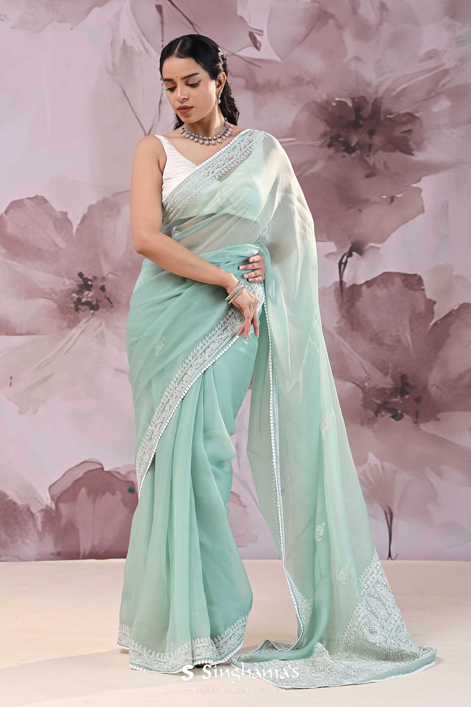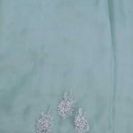 Greyish turquoise organza saree features embroidered floral design along with floral embroidered border making it look elegant and classy for formal and informal event