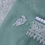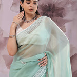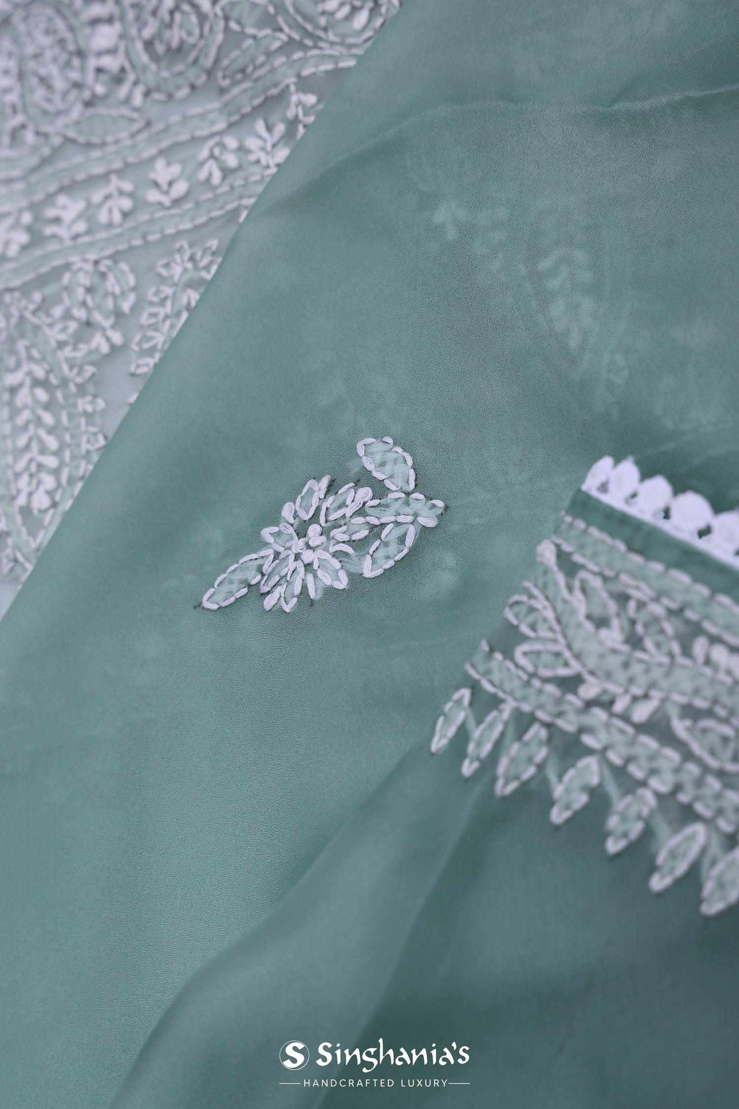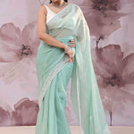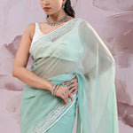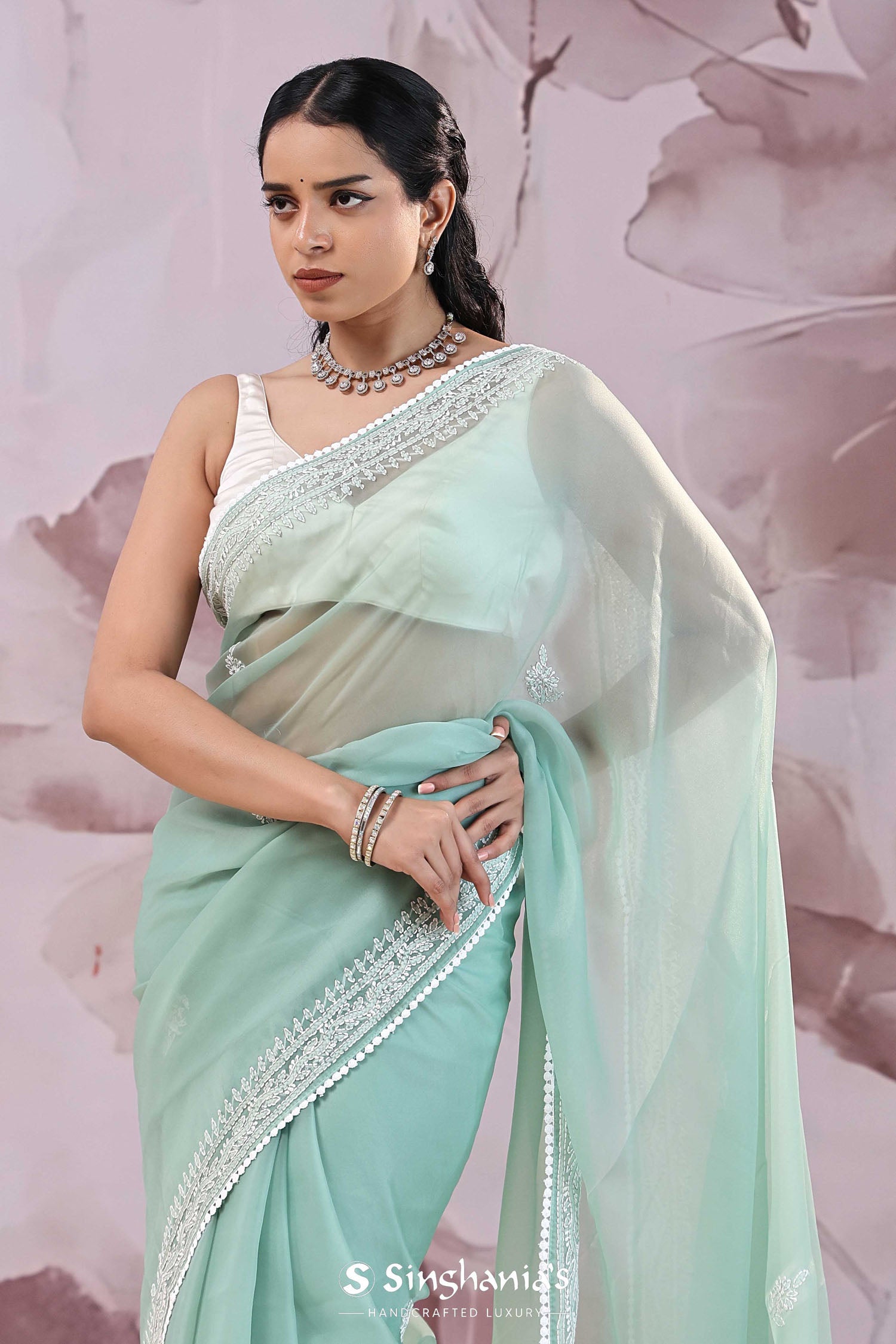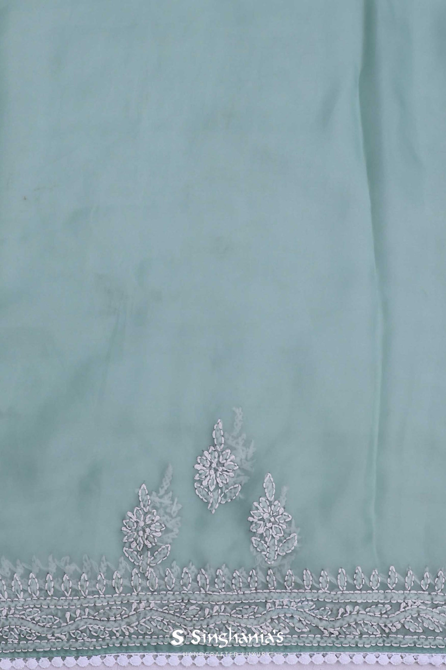 Greyish turquoise organza saree features embroidered floral design along with floral embroidered border making it look elegant and classy for formal and informal event