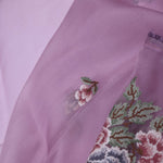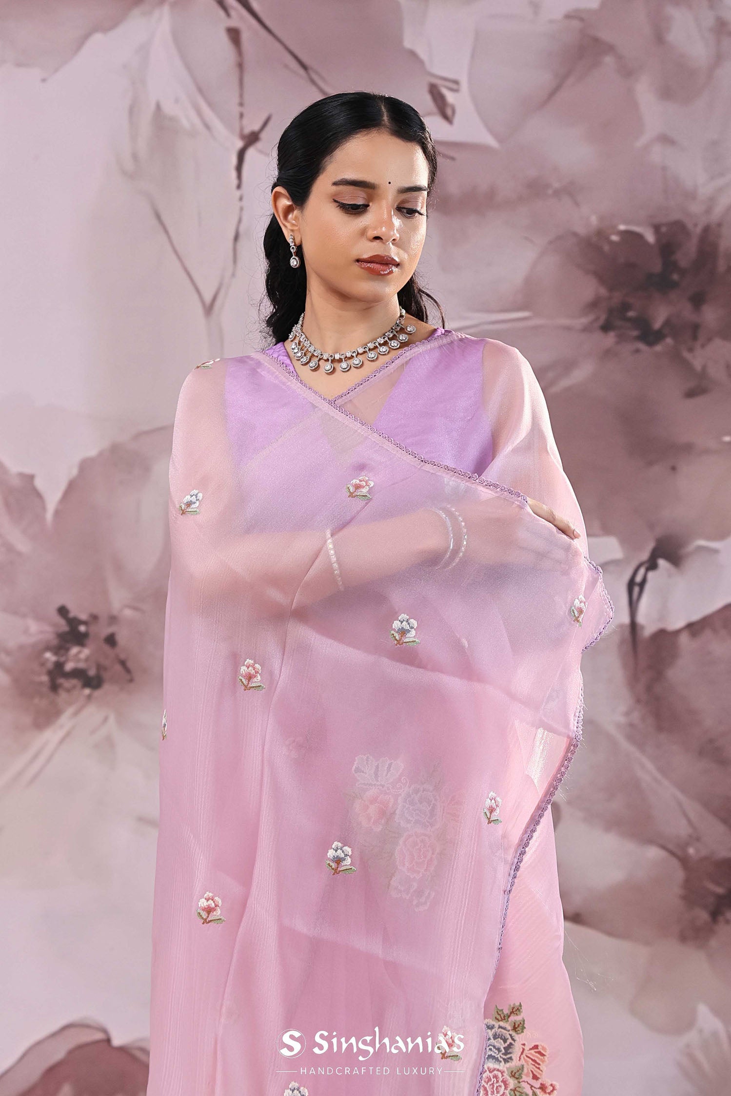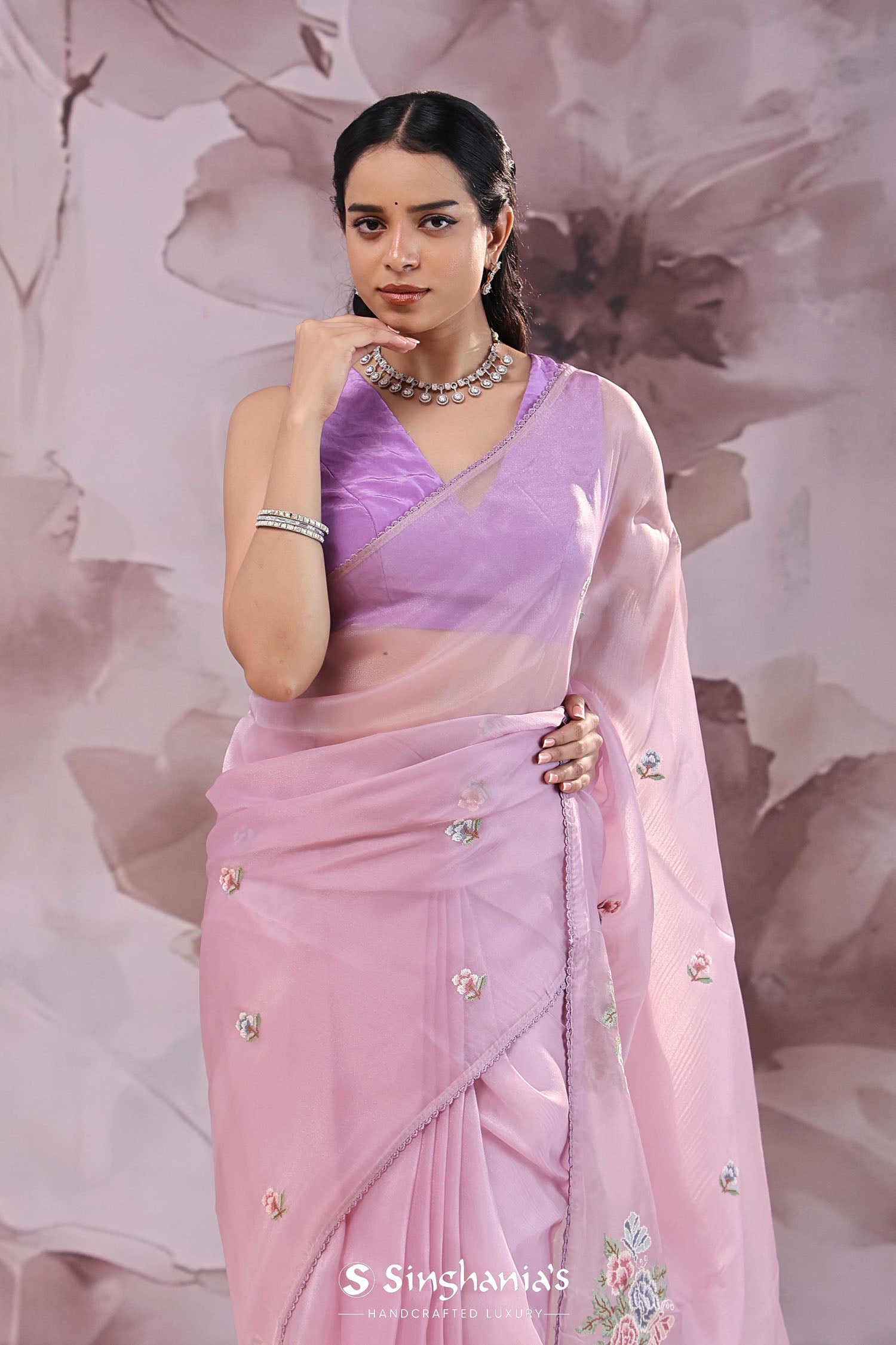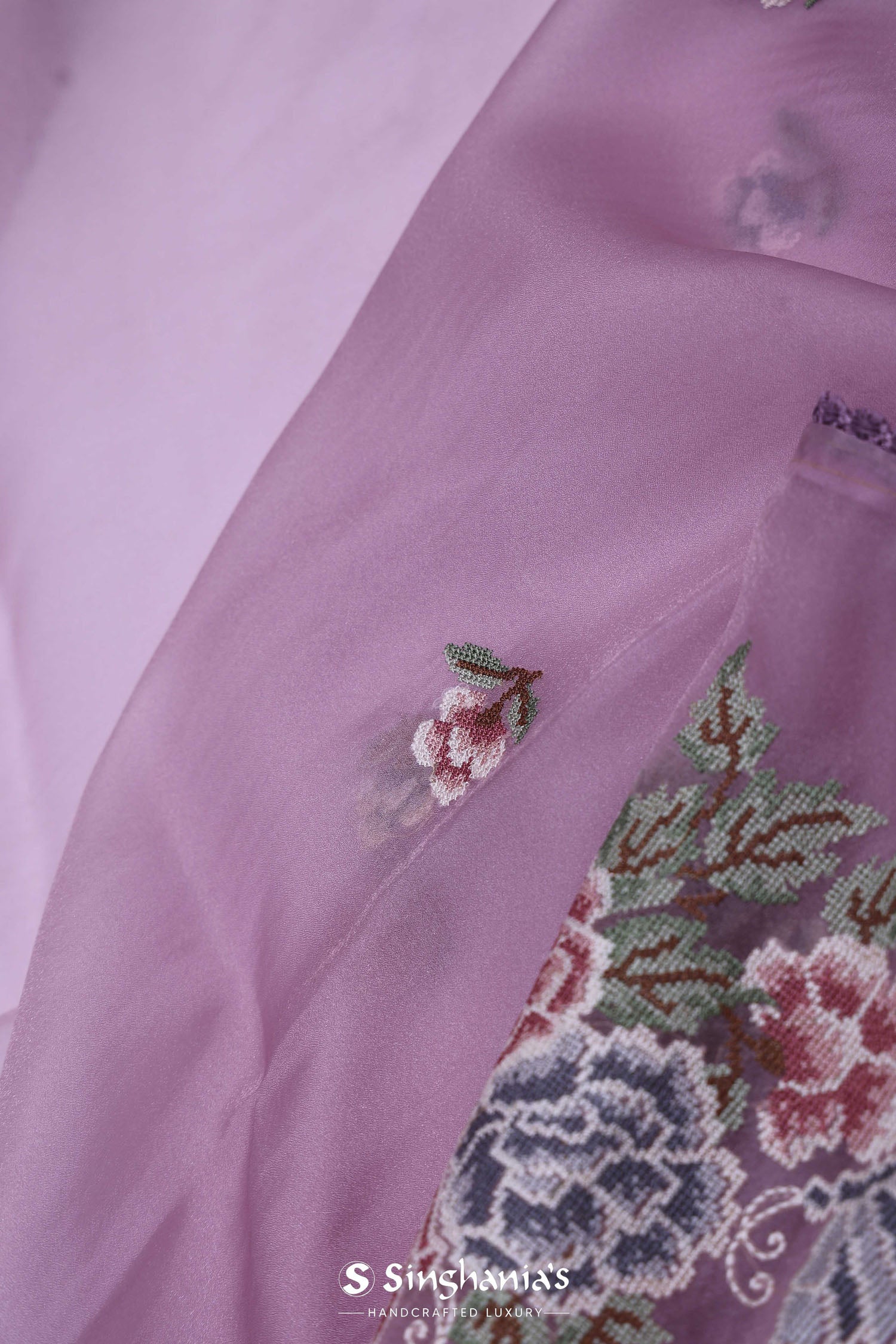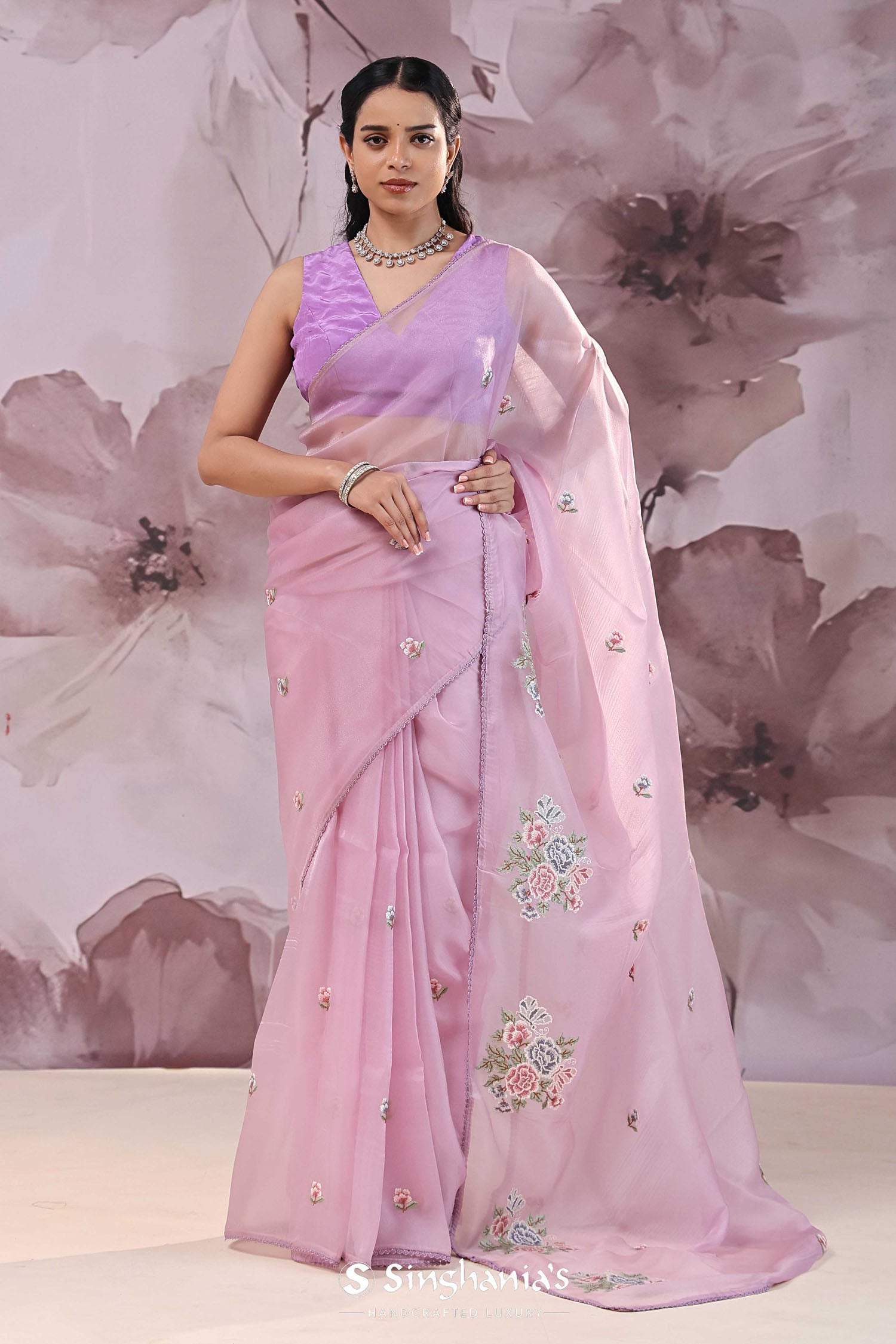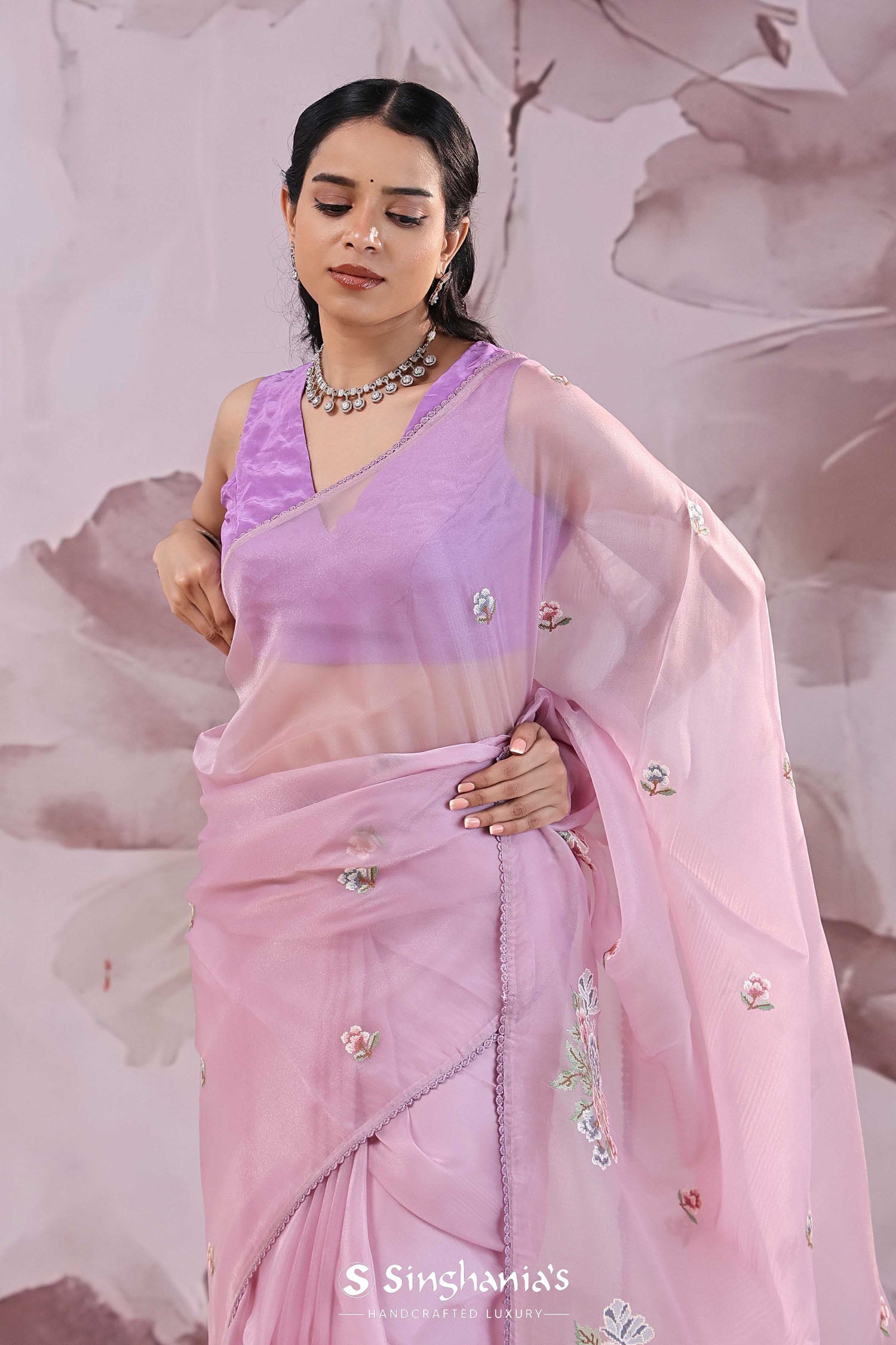 This Lavender pink organza saree features floral petit point embroidery scattered all across the body and pallu has huge floral design along with narrow border