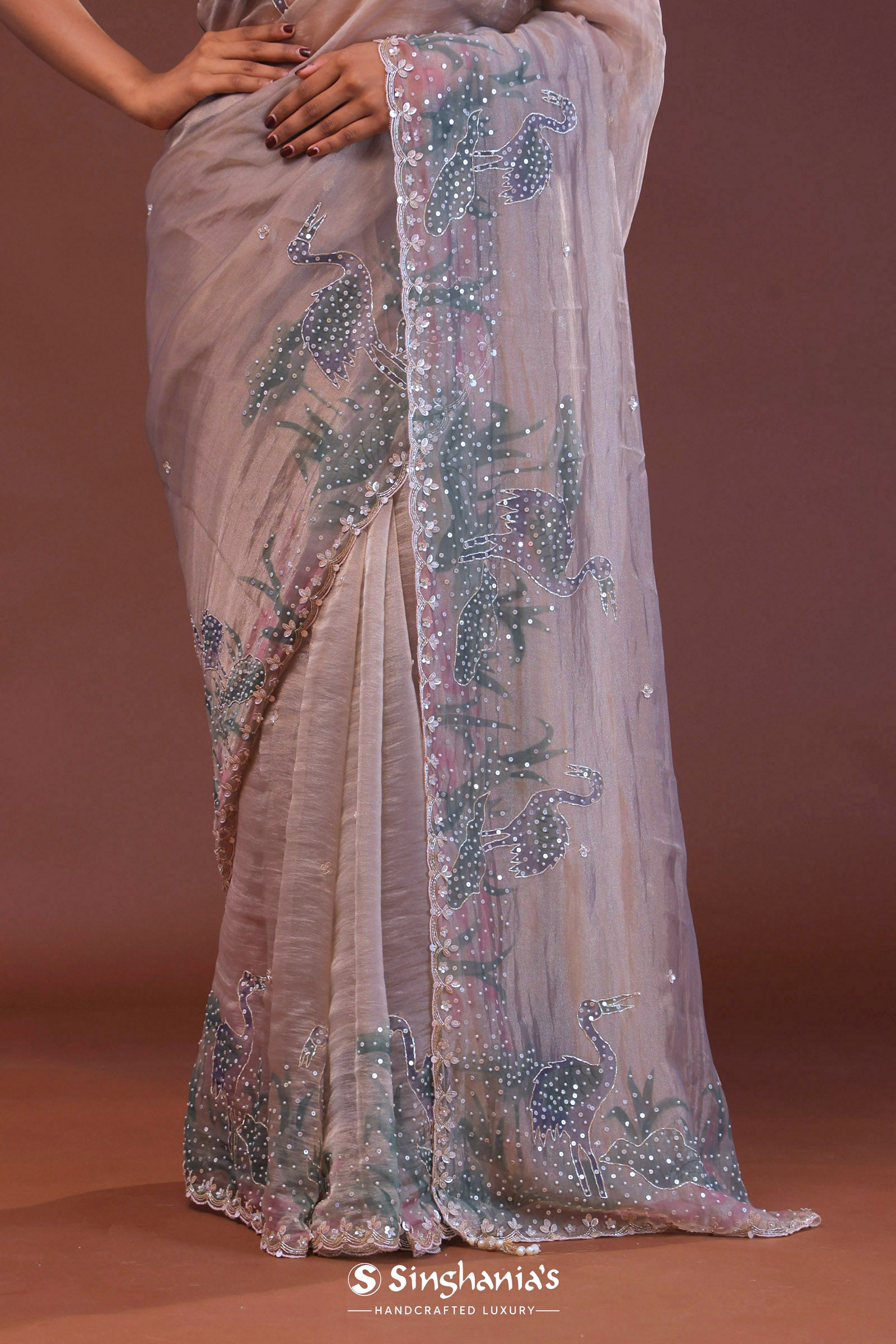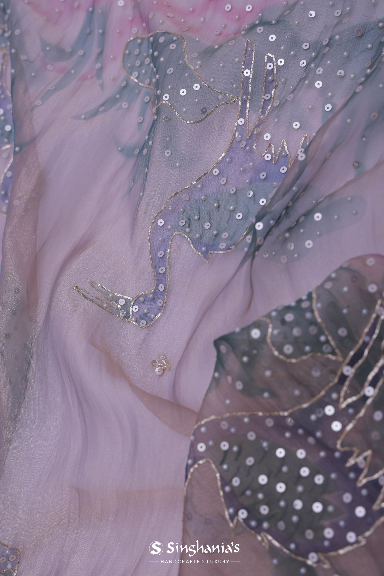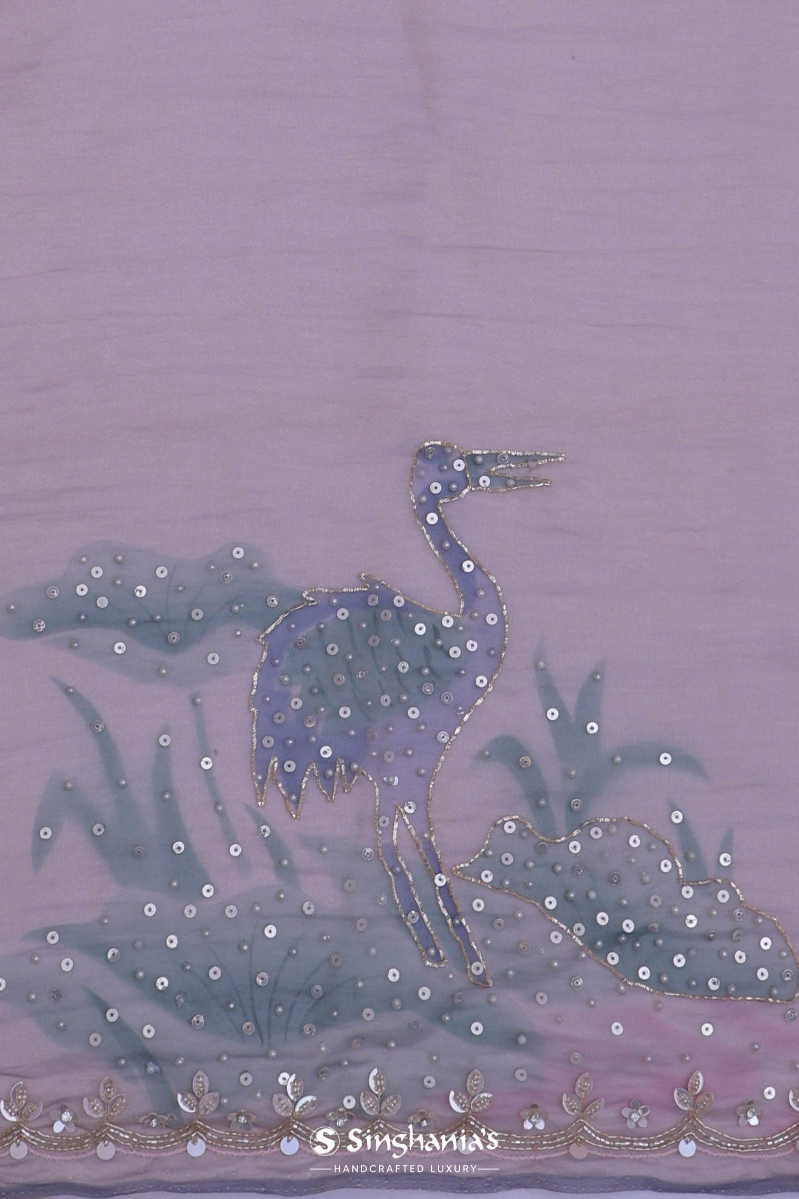 Beautifully embroidered scallop border with elaborate kardana work adorns this gorgeous lilac organza saree. The delicate hand painting of purple bird on the saree's body highlights it, while sequins and pearls strewn throughout provide a hint of subtle shine.