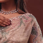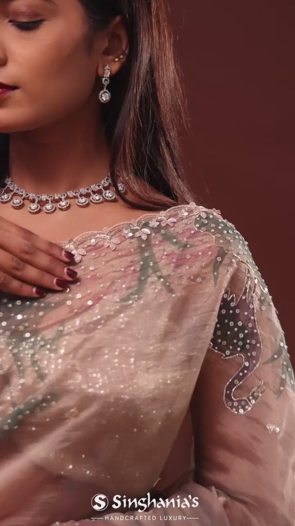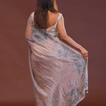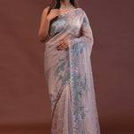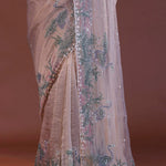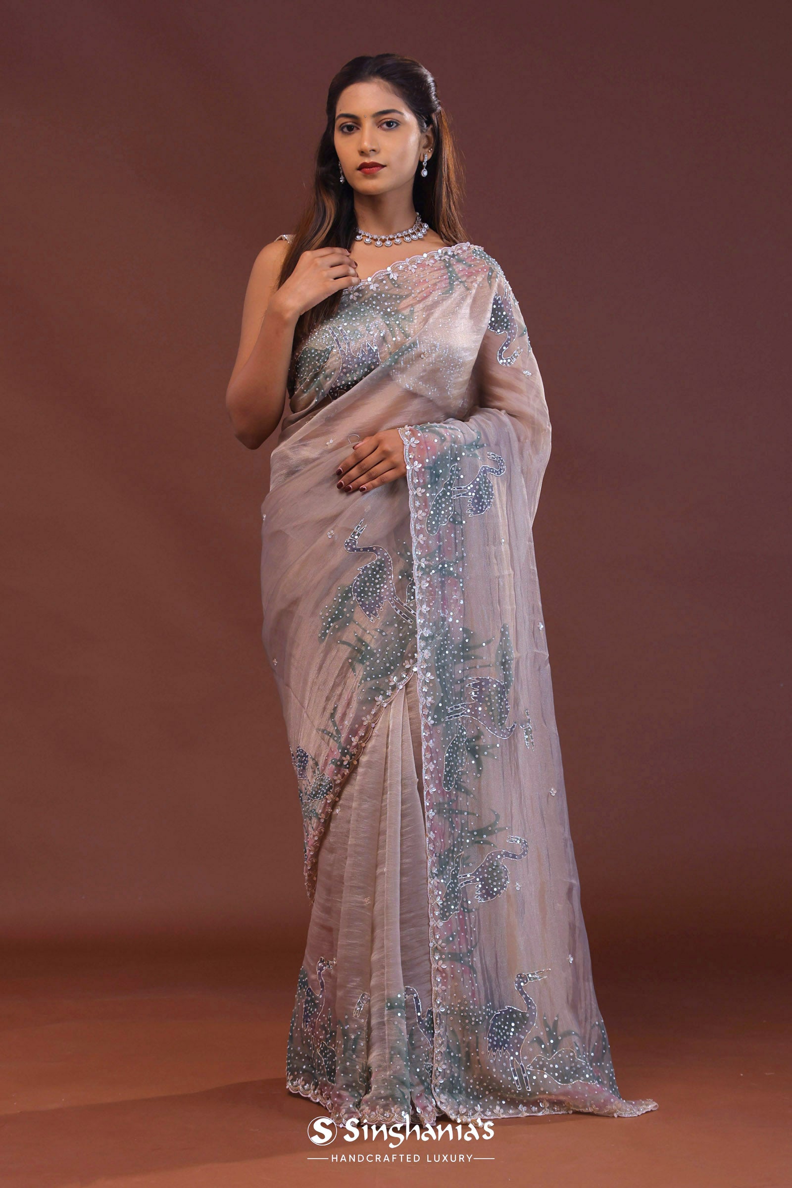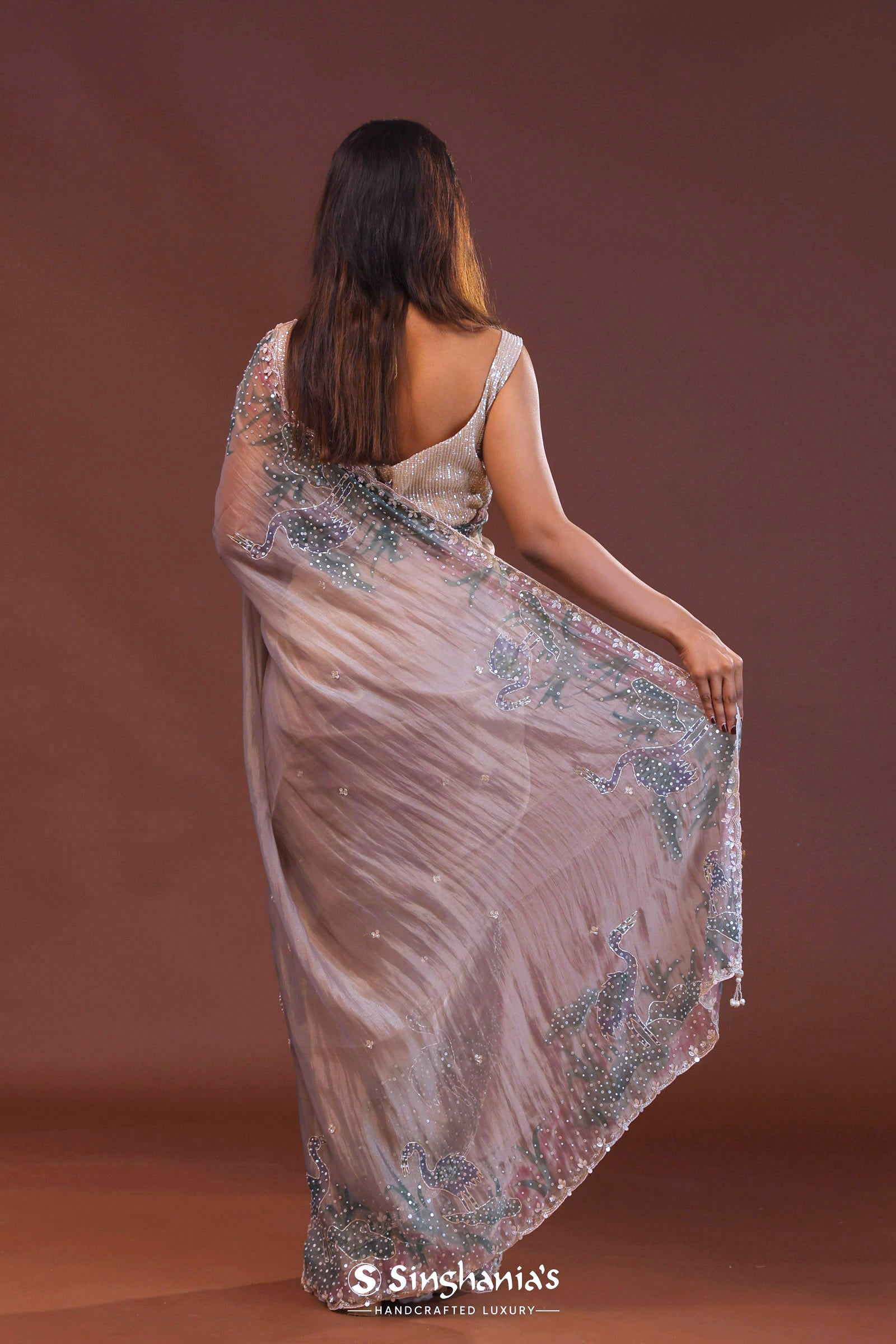 Beautifully embroidered scallop border with elaborate kardana work adorns this gorgeous lilac organza saree. The delicate hand painting of purple bird on the saree's body highlights it, while sequins and pearls strewn throughout provide a hint of subtle shine.