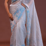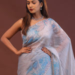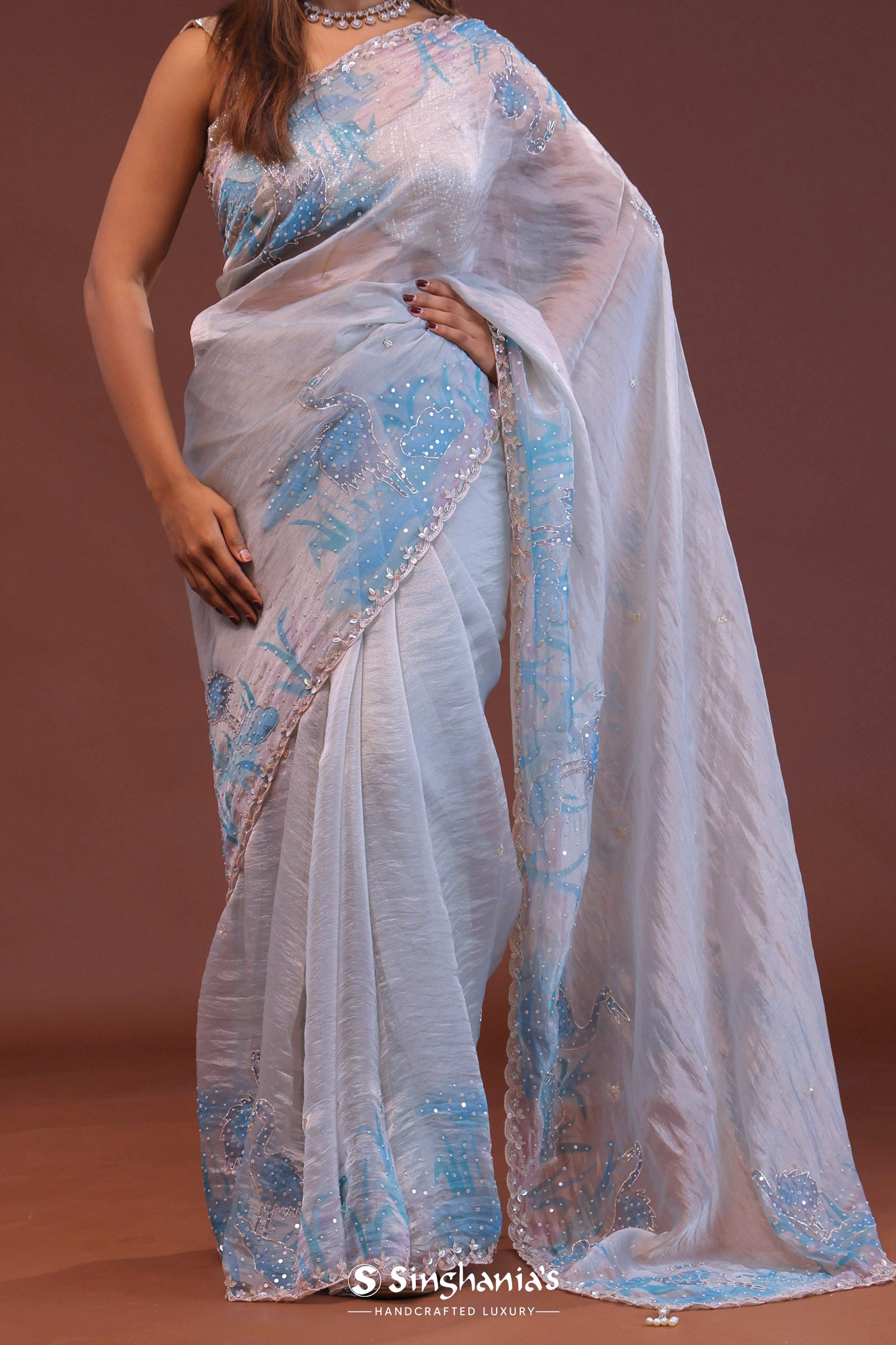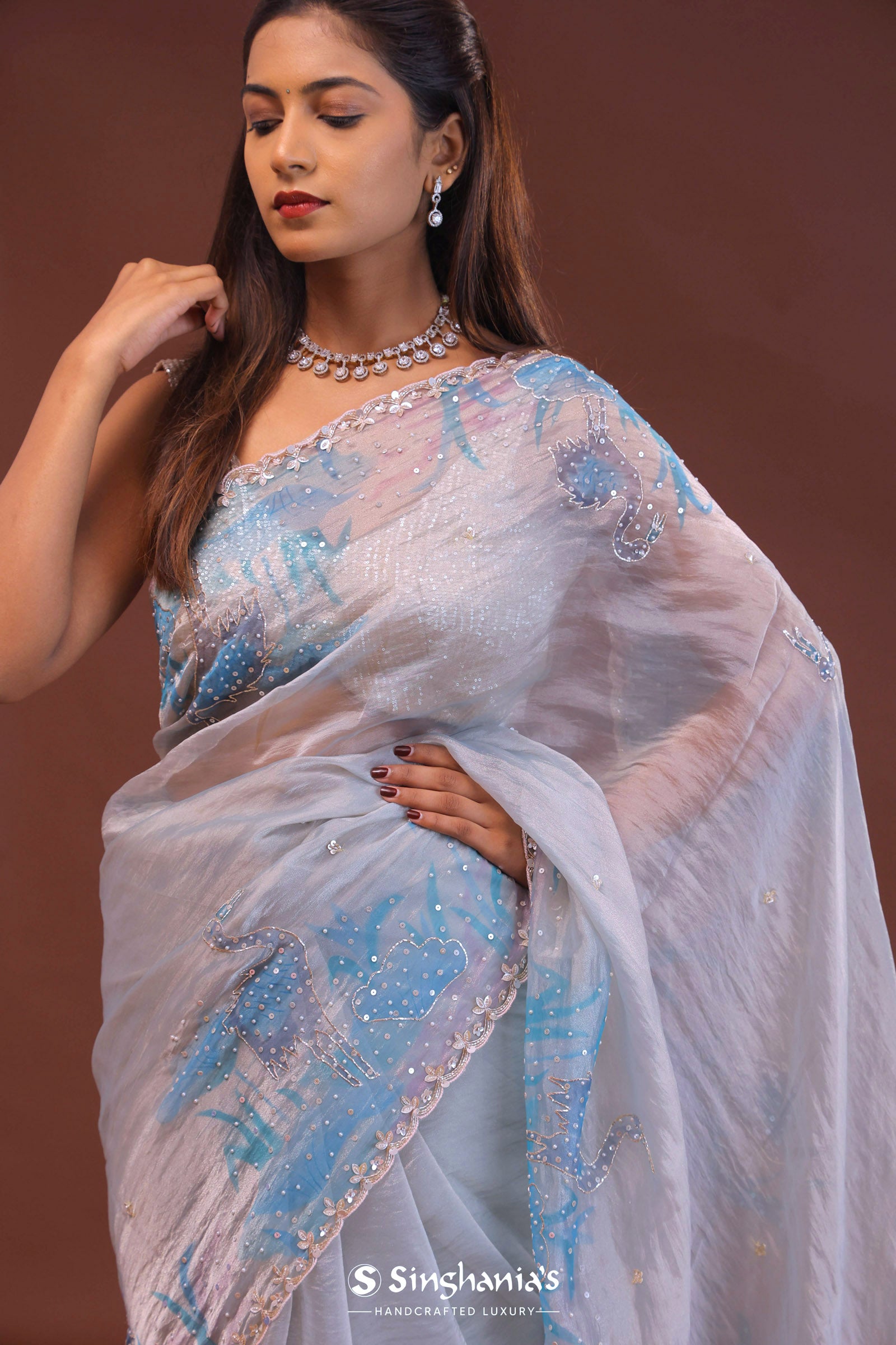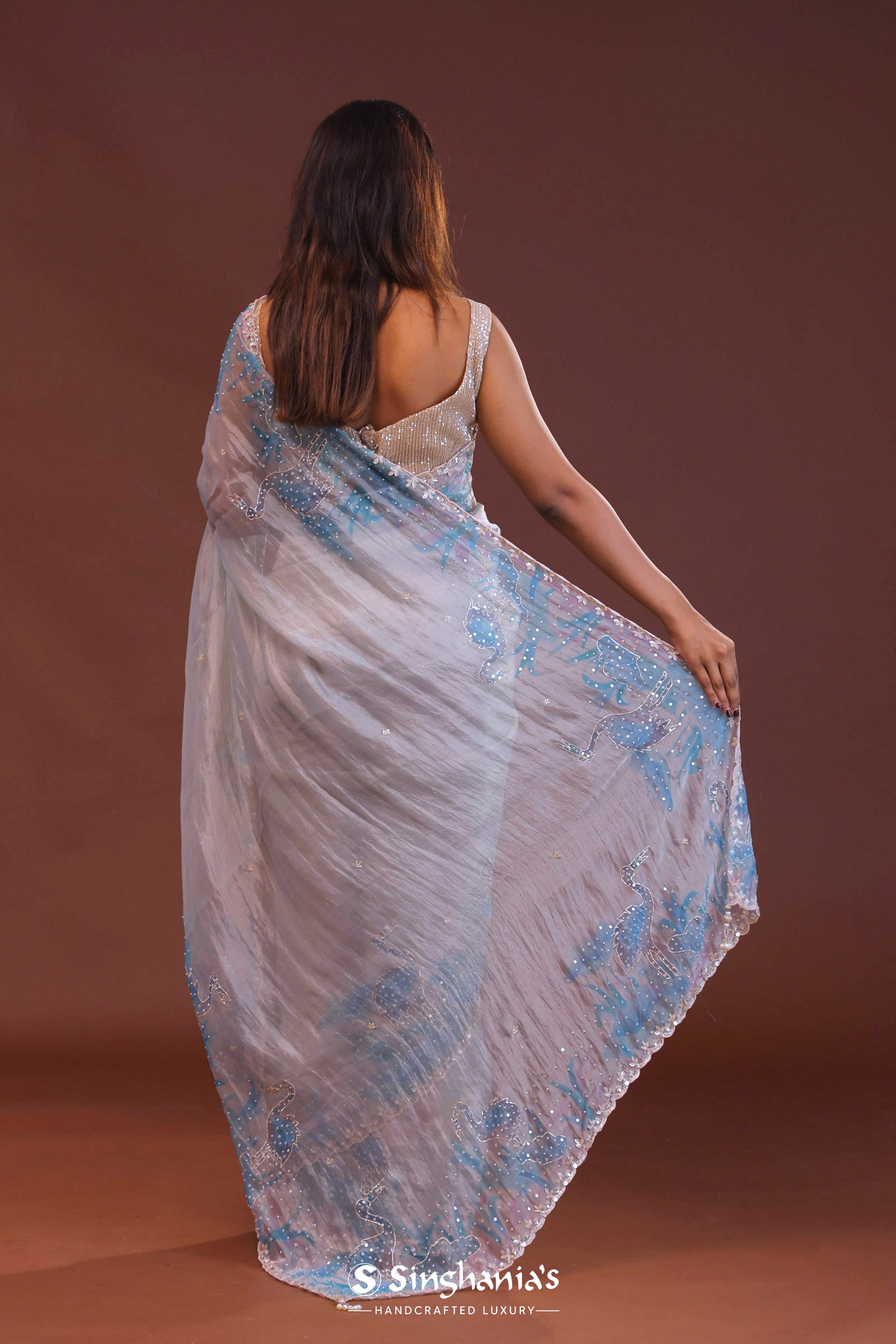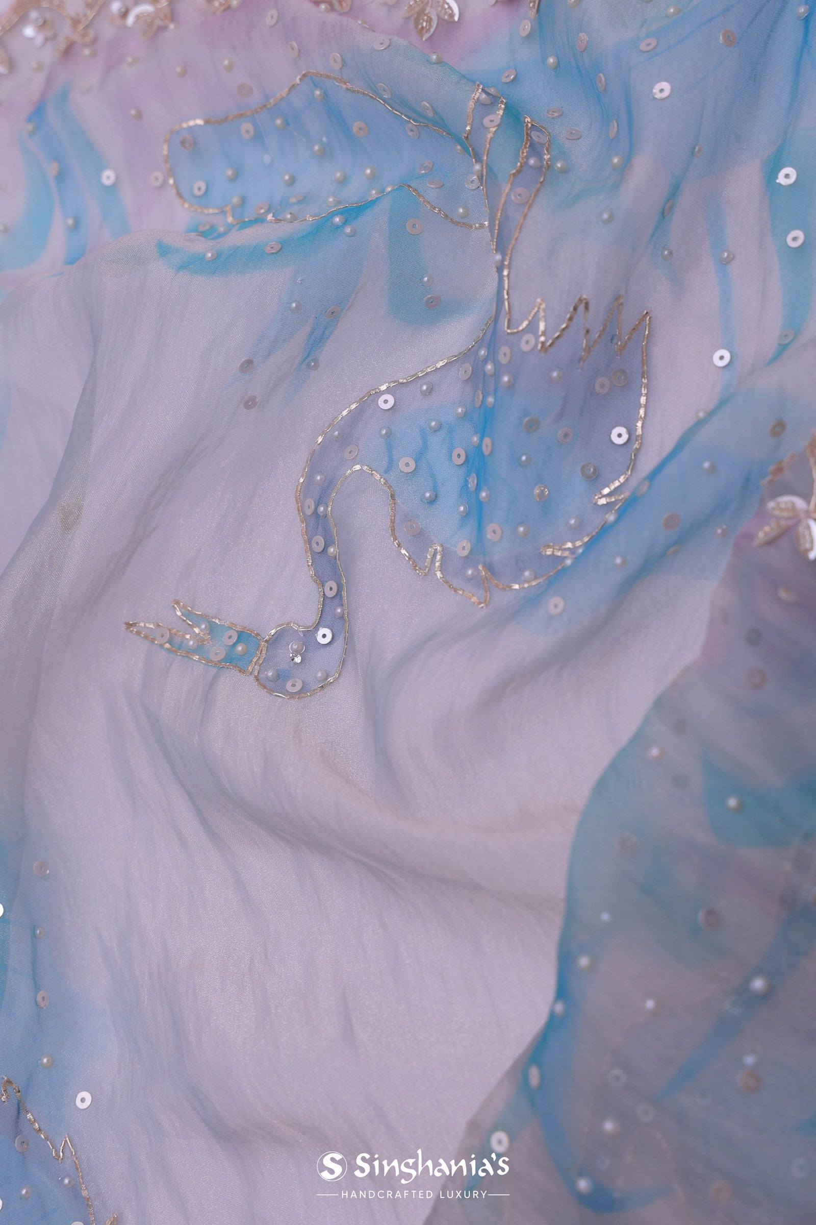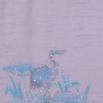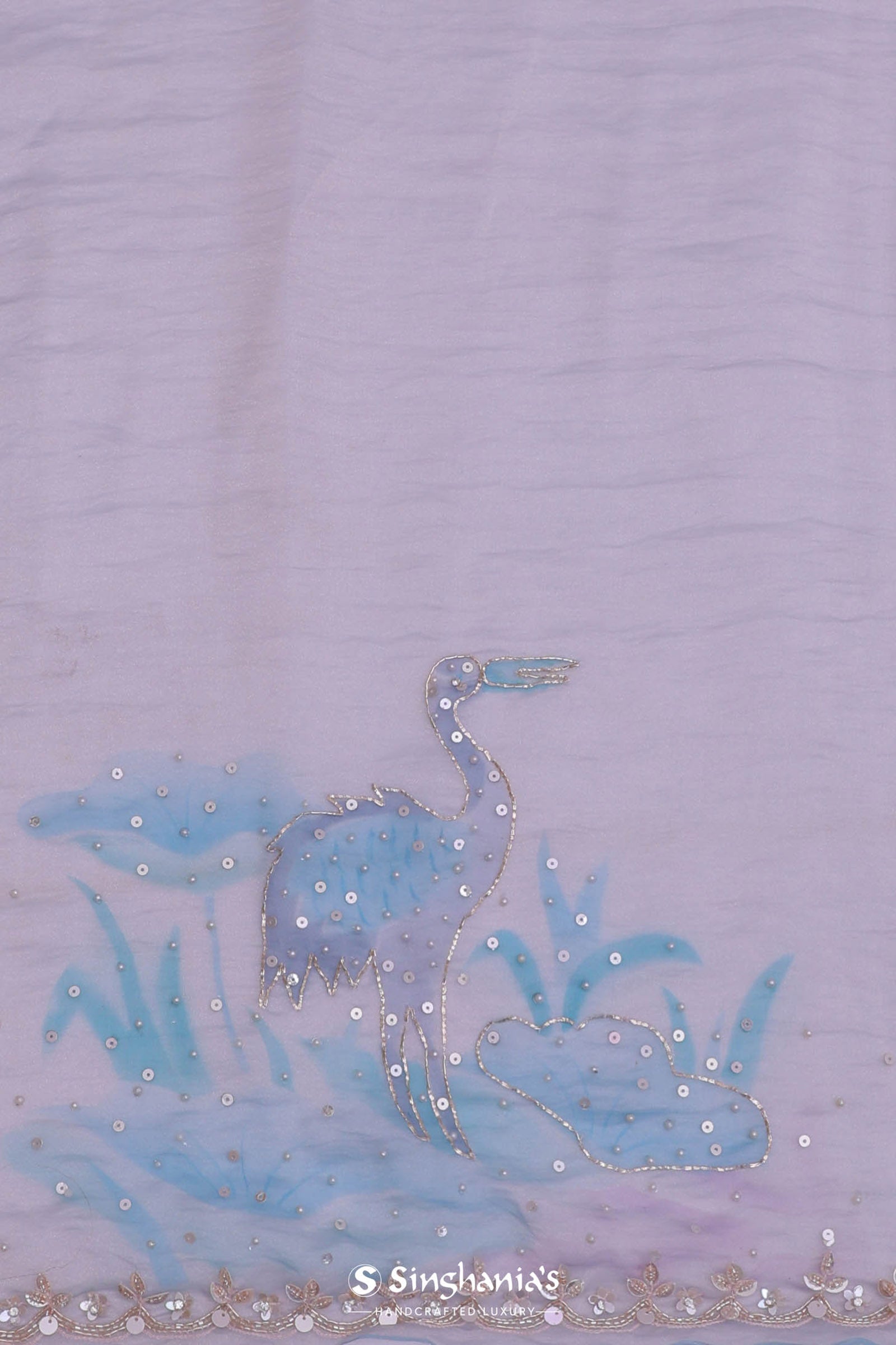 Beautifully embroidered scallop border with elaborate kardana work adorns this gorgeous lilac organza saree. The delicate hand painting of blue bird on the saree's body highlights it, while sequins and pearls strewn throughout provide a hint of subtle shine.