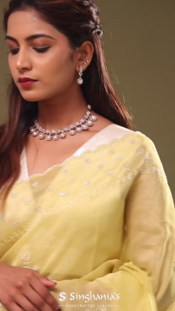 A beautiful buttas, scallop border, and beautiful embroidery decorate this soft macaroon yellow organza saree which gives elegent look .
