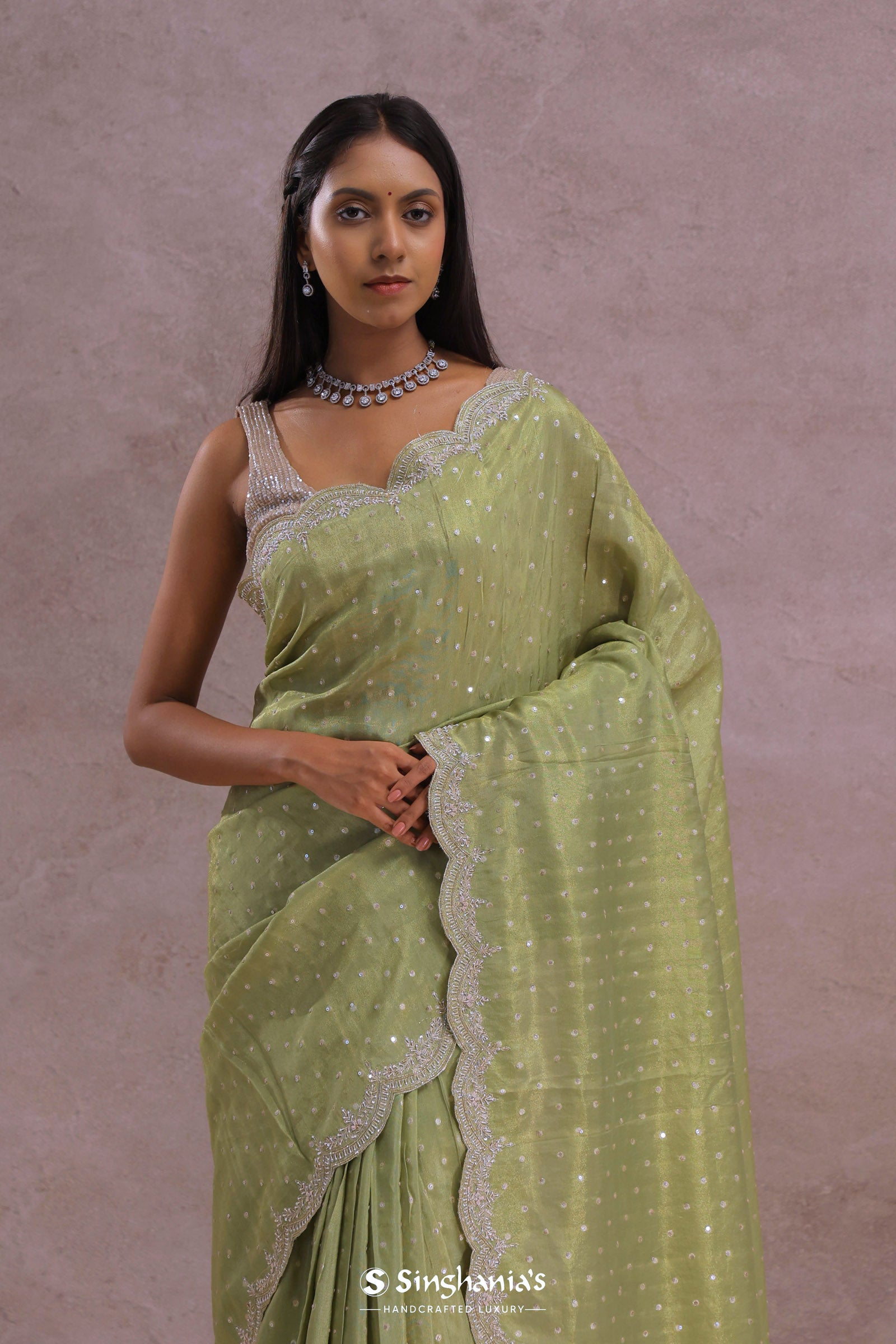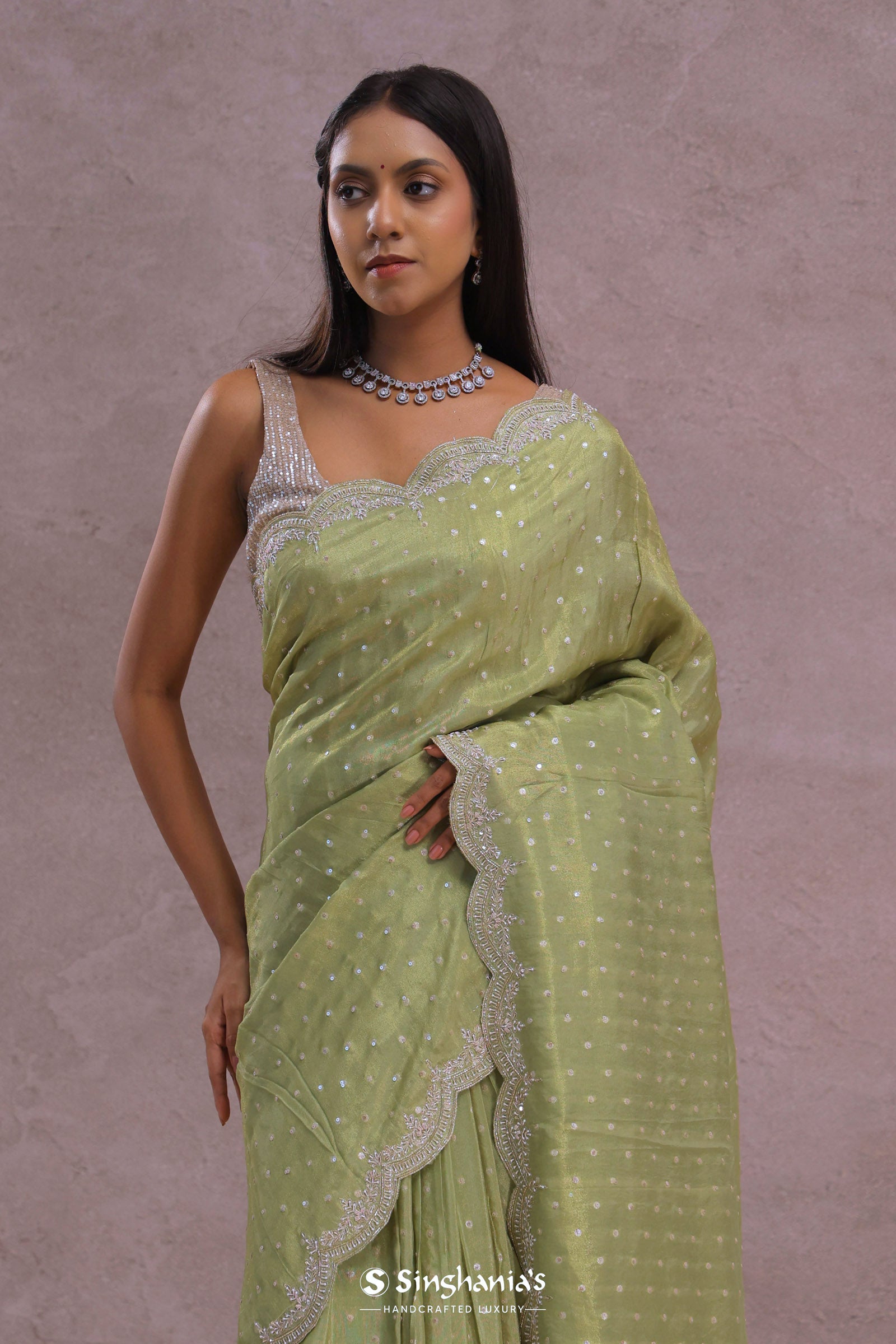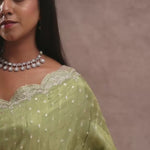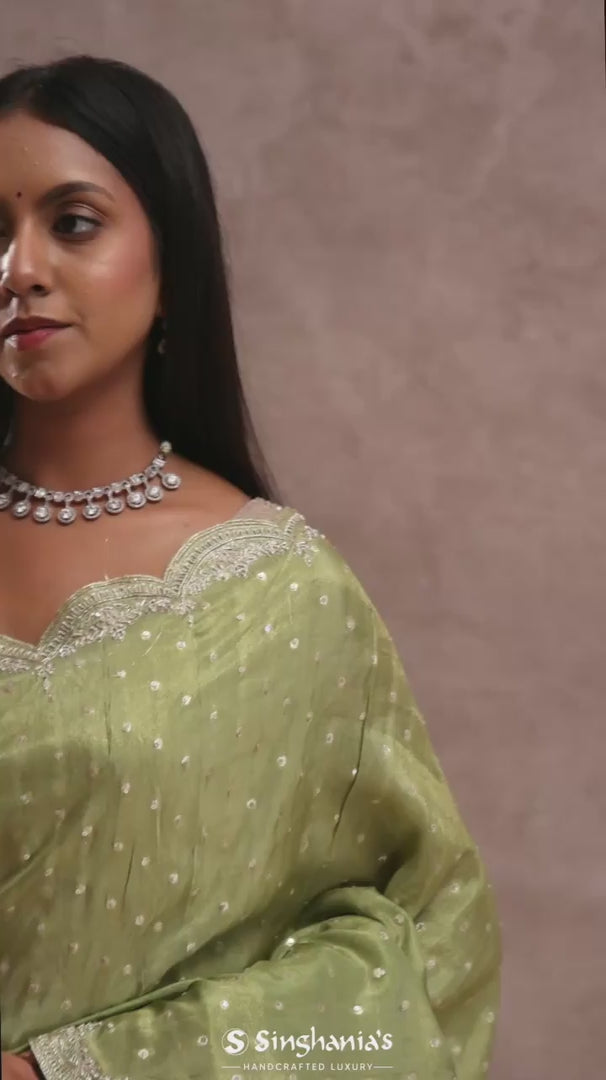 This oilve green soft organza saree is a delicate beauty, presenting a graceful scallop border decorated with amazing kardana work. The body is embellished with subtle sequins work, adding a soft sparkle and making it perfect for elegant occasions and celebrations
