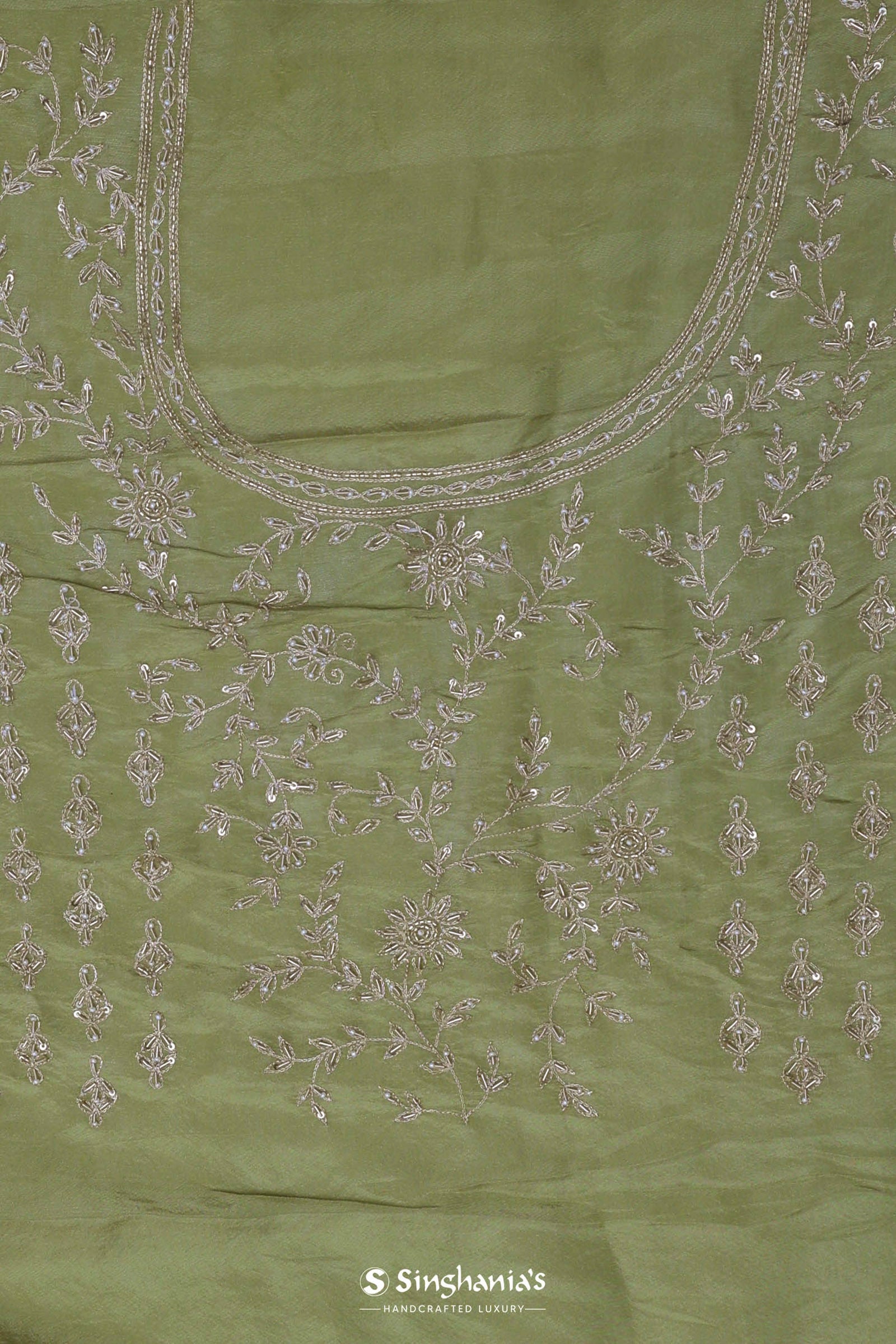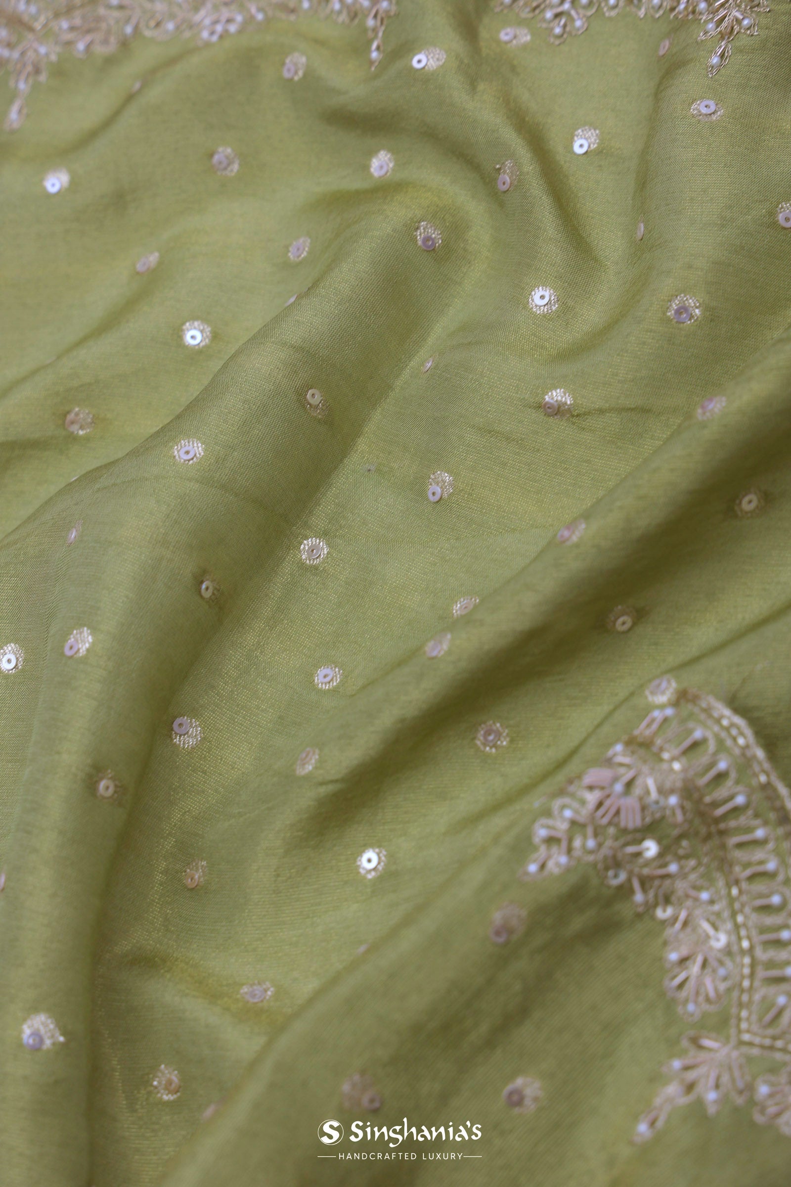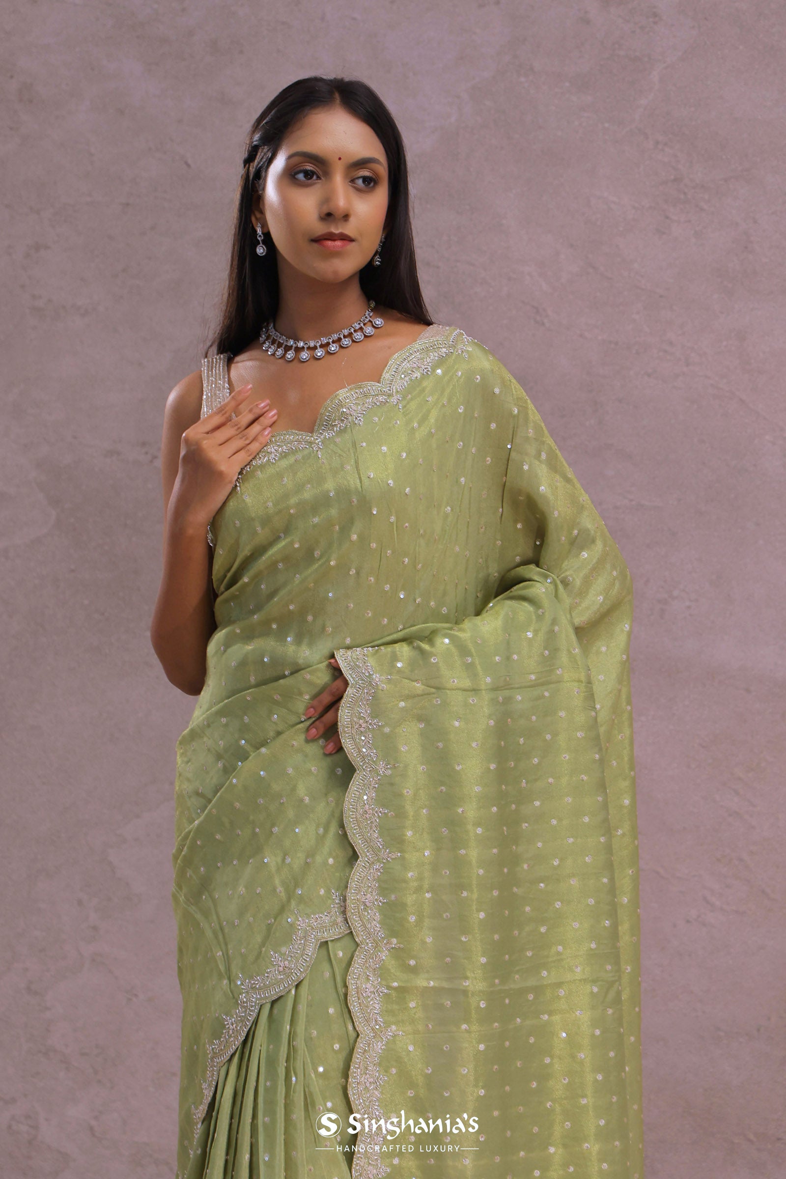 This oilve green soft organza saree is a delicate beauty, presenting a graceful scallop border decorated with amazing kardana work. The body is embellished with subtle sequins work, adding a soft sparkle and making it perfect for elegant occasions and celebrations