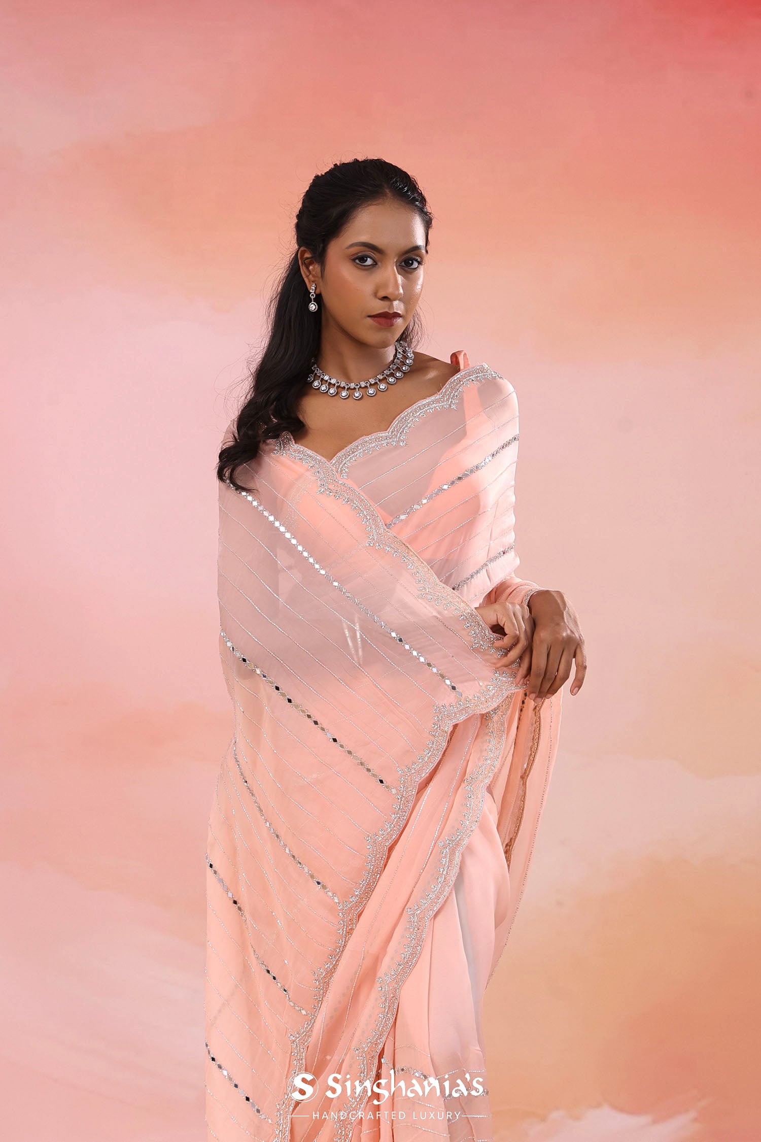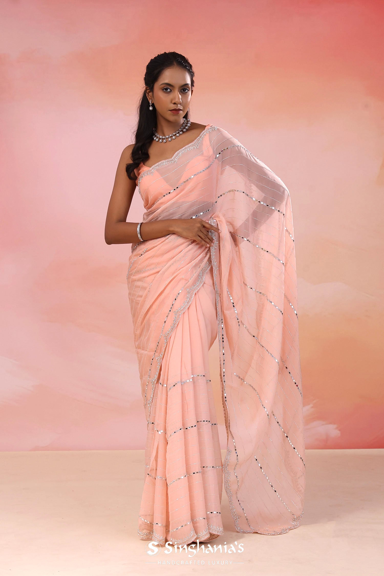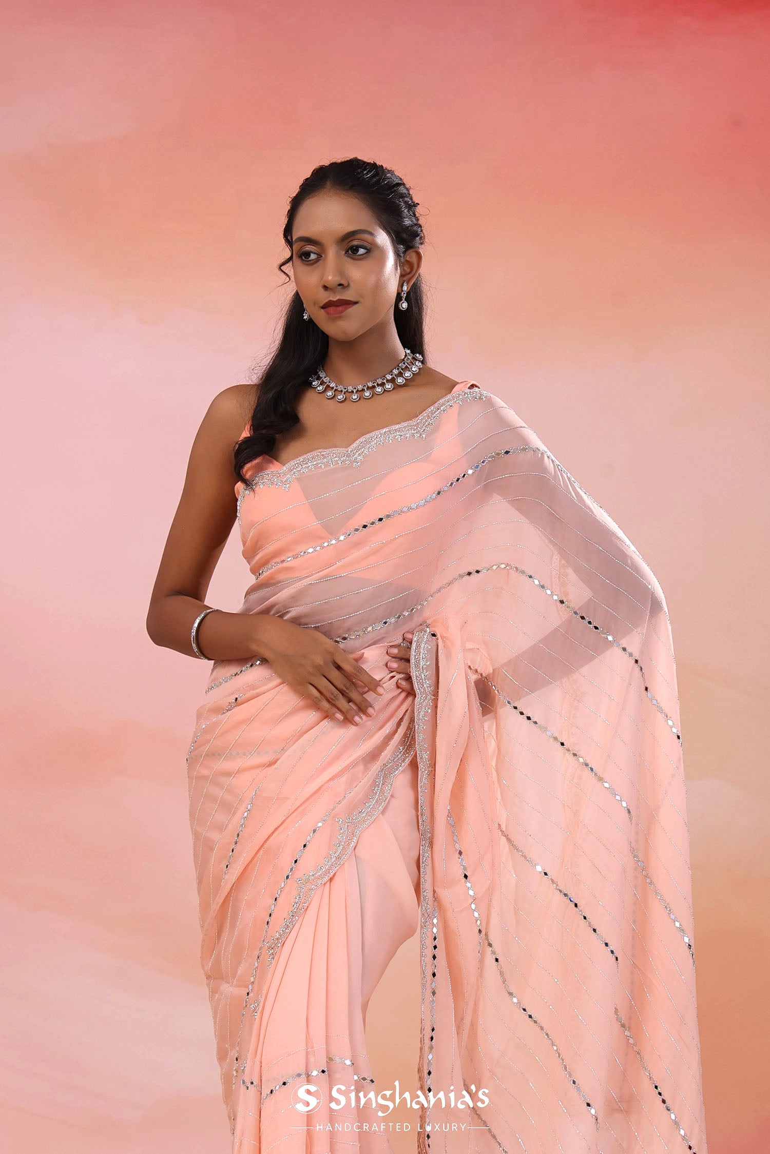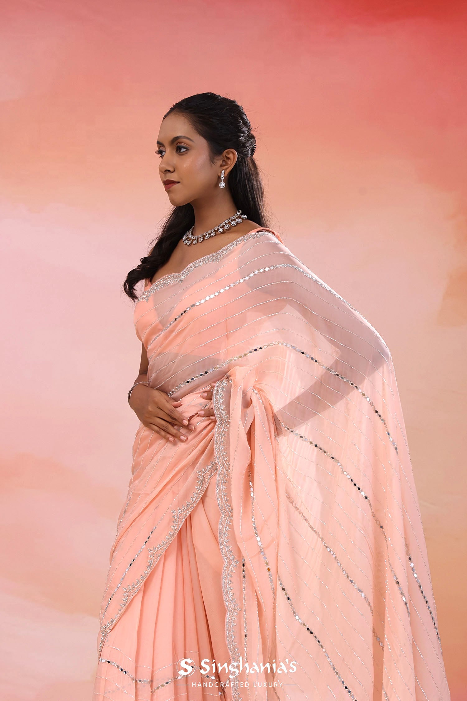 Pair with minimal jewellery and soft makeup to highlight the timeless elegance Singhania’s is known for.