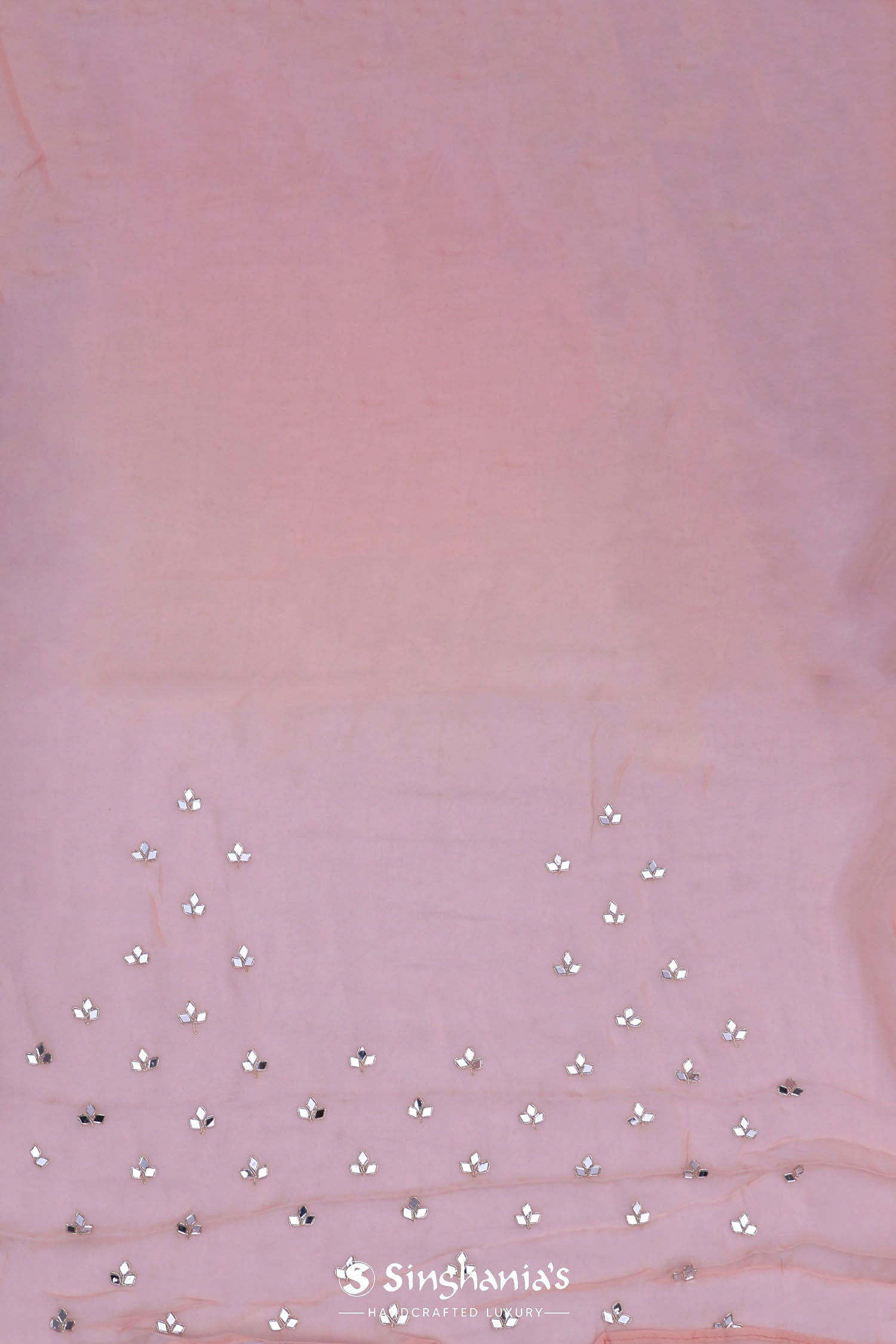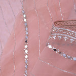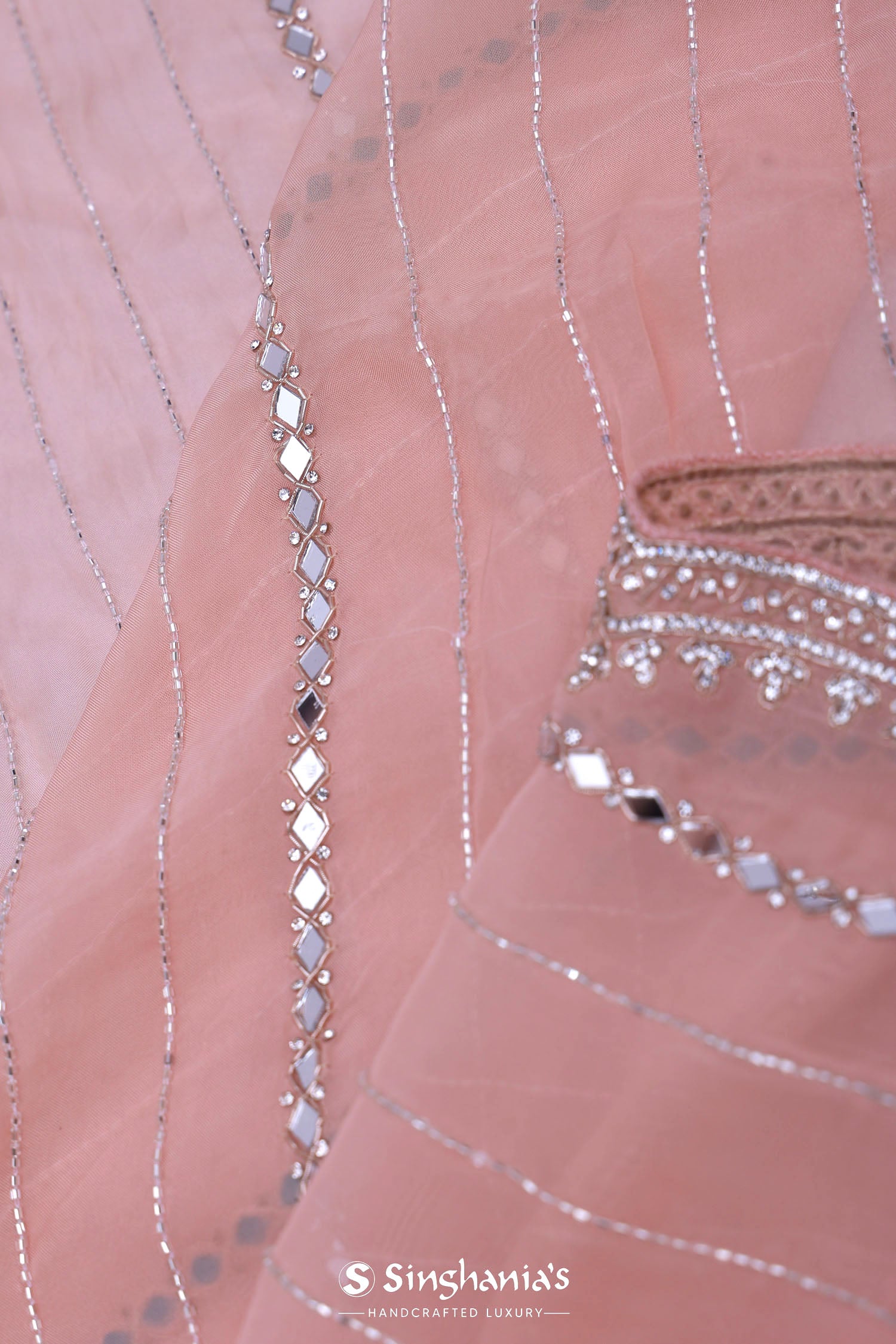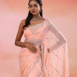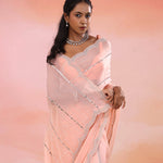 This Oriental pink organza saree features mirror, zardosi and beads work forming a horizontal lines on the body along with scallop border making it ideal choice for traditional occasions