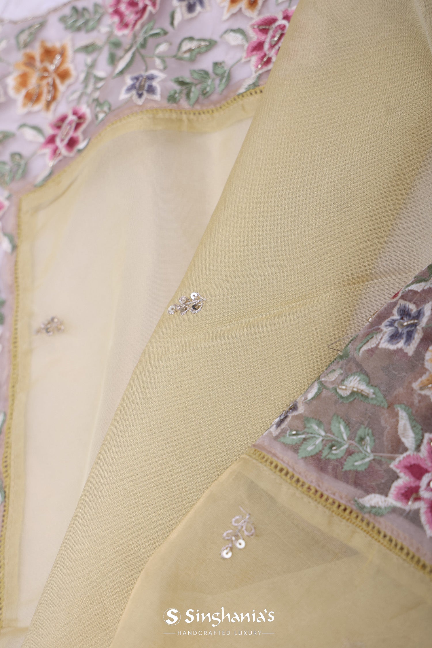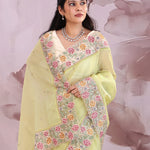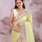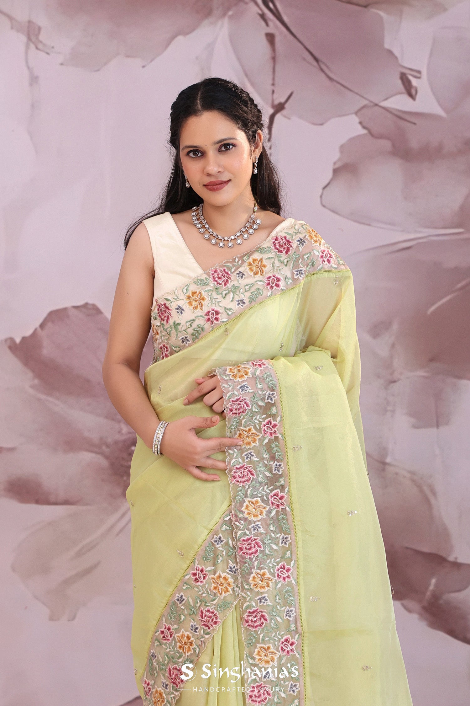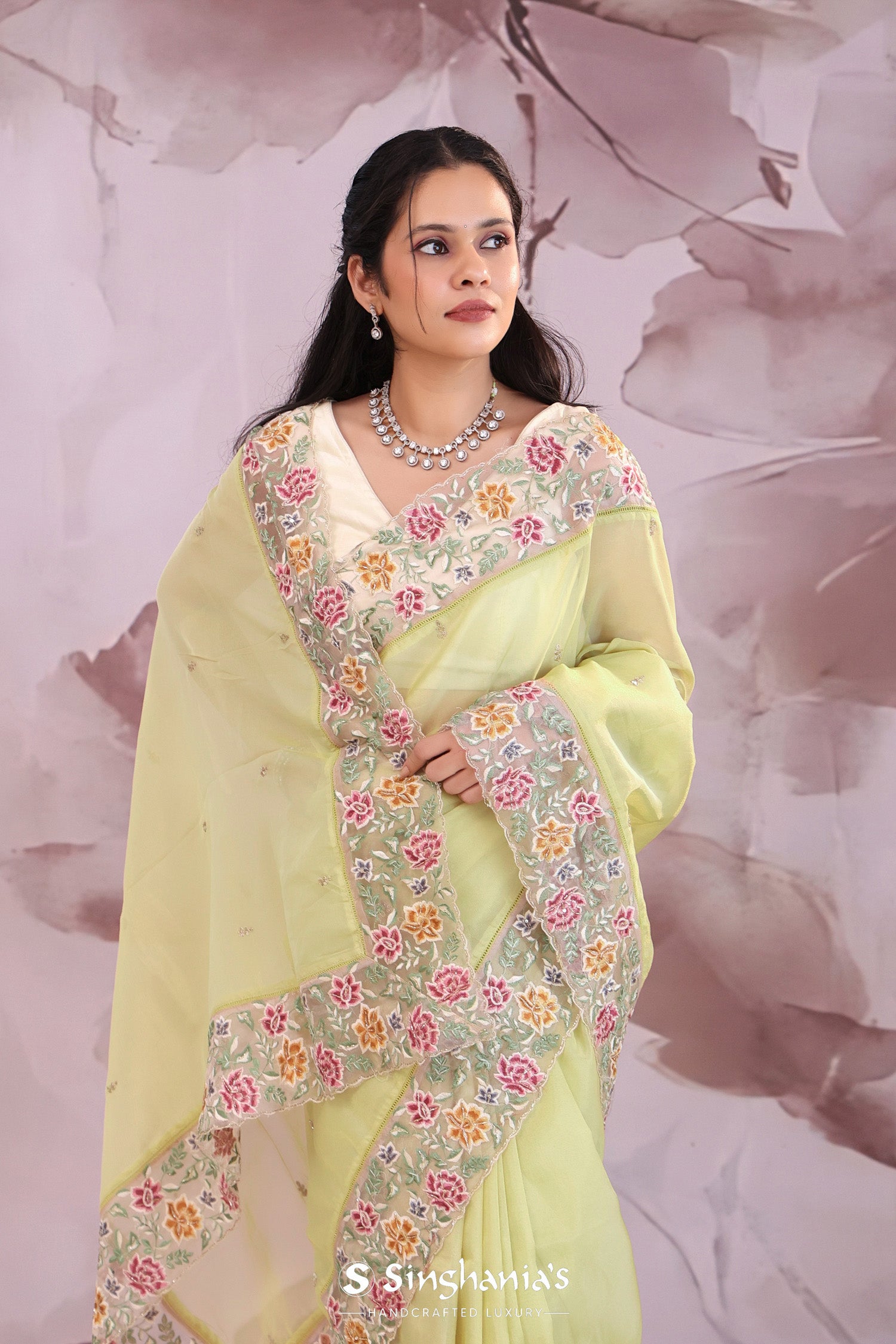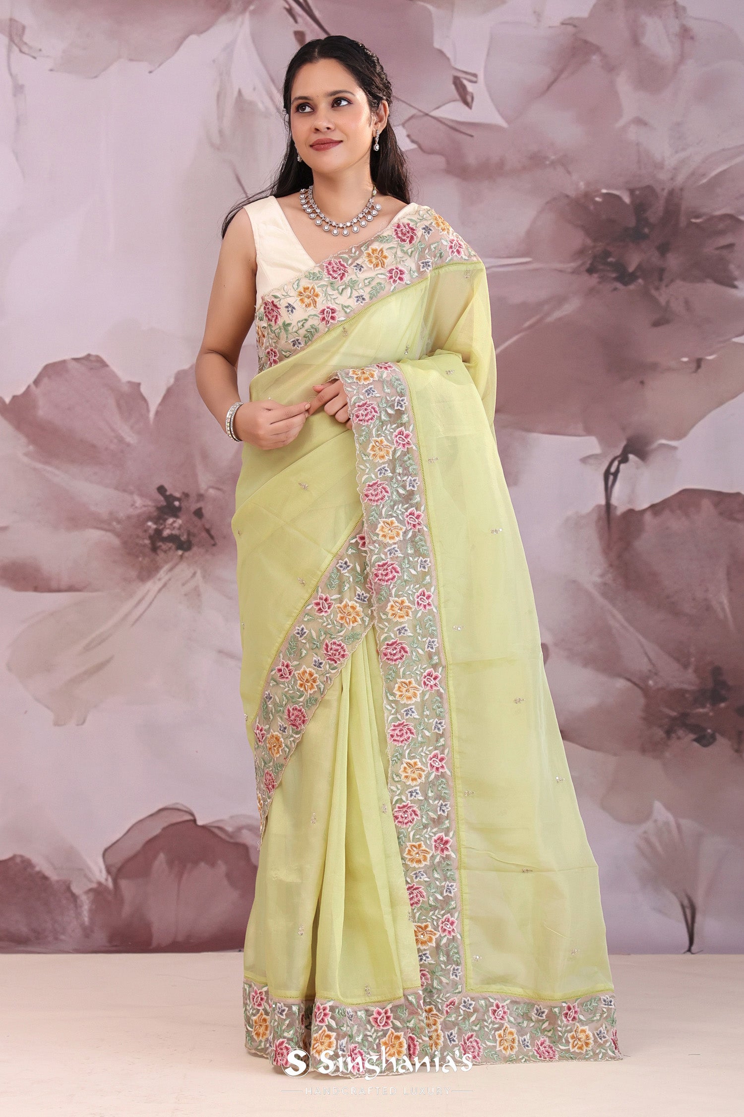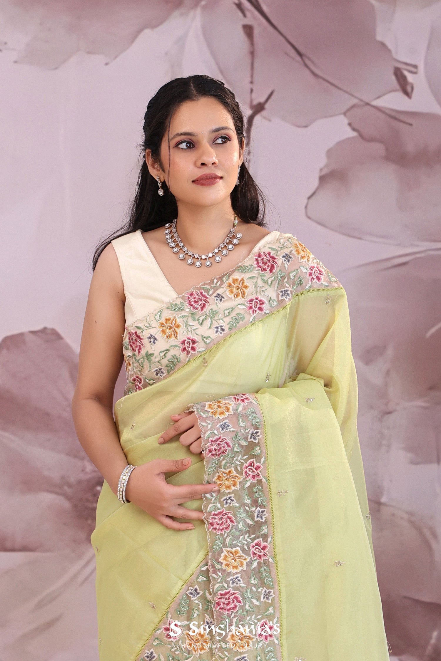 Pale Lime Yellow Organza Saree With Parsi Embroidery