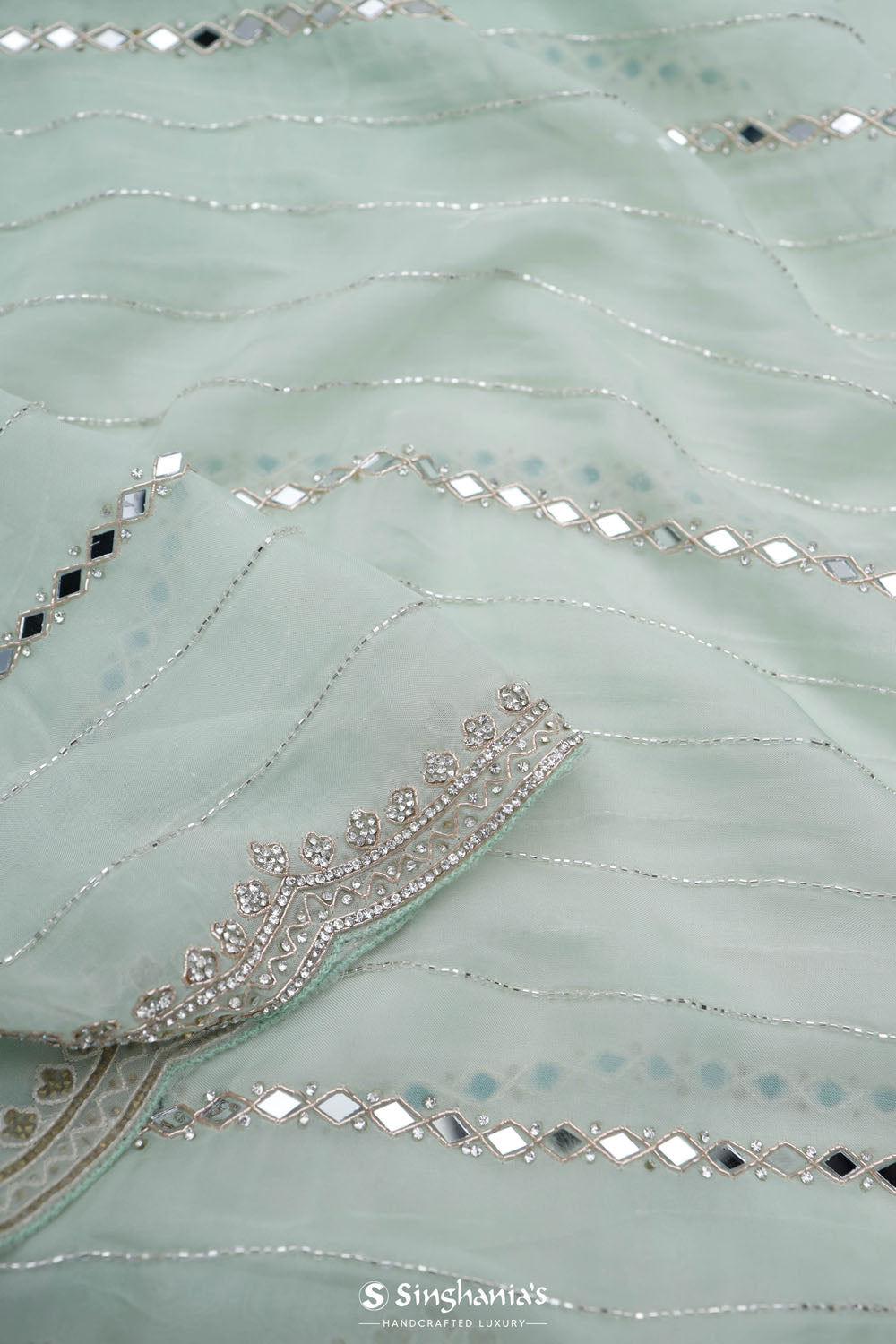 Light, airy and full of grace, this pale mint organza saree brings a shimmer that makes you shine effortlessly. Accentuated with mirror, glass beads and zardosi striped embroidery that creates a luxurious feel, perfect for festivals and grand celebrations.