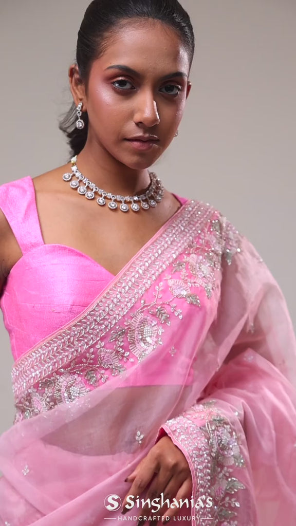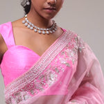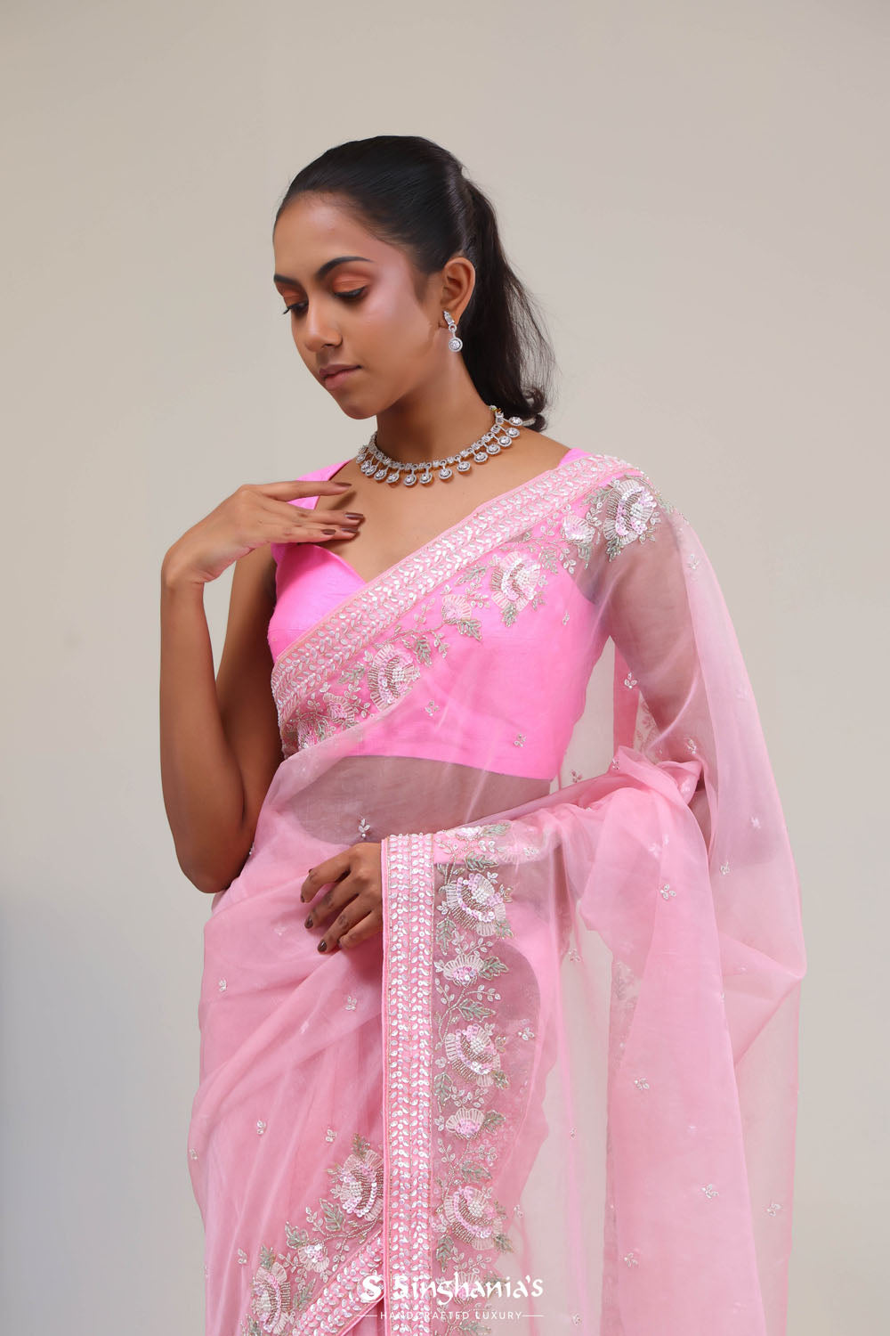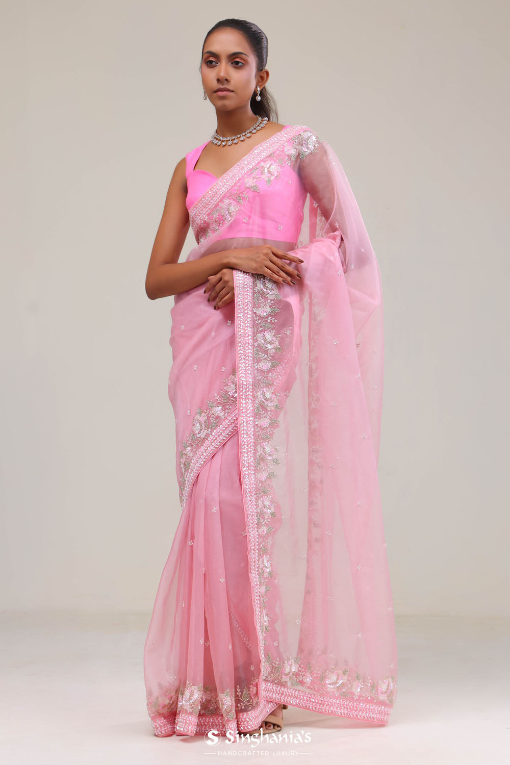 A beautifu pastel pink organza designer saree with floral butti design embroidery all over the body. Accentuated in sequins and glass beads, with small floral embroidery border edge, that adds to the whole look - this saree is suitable for festive and wedding occasions.