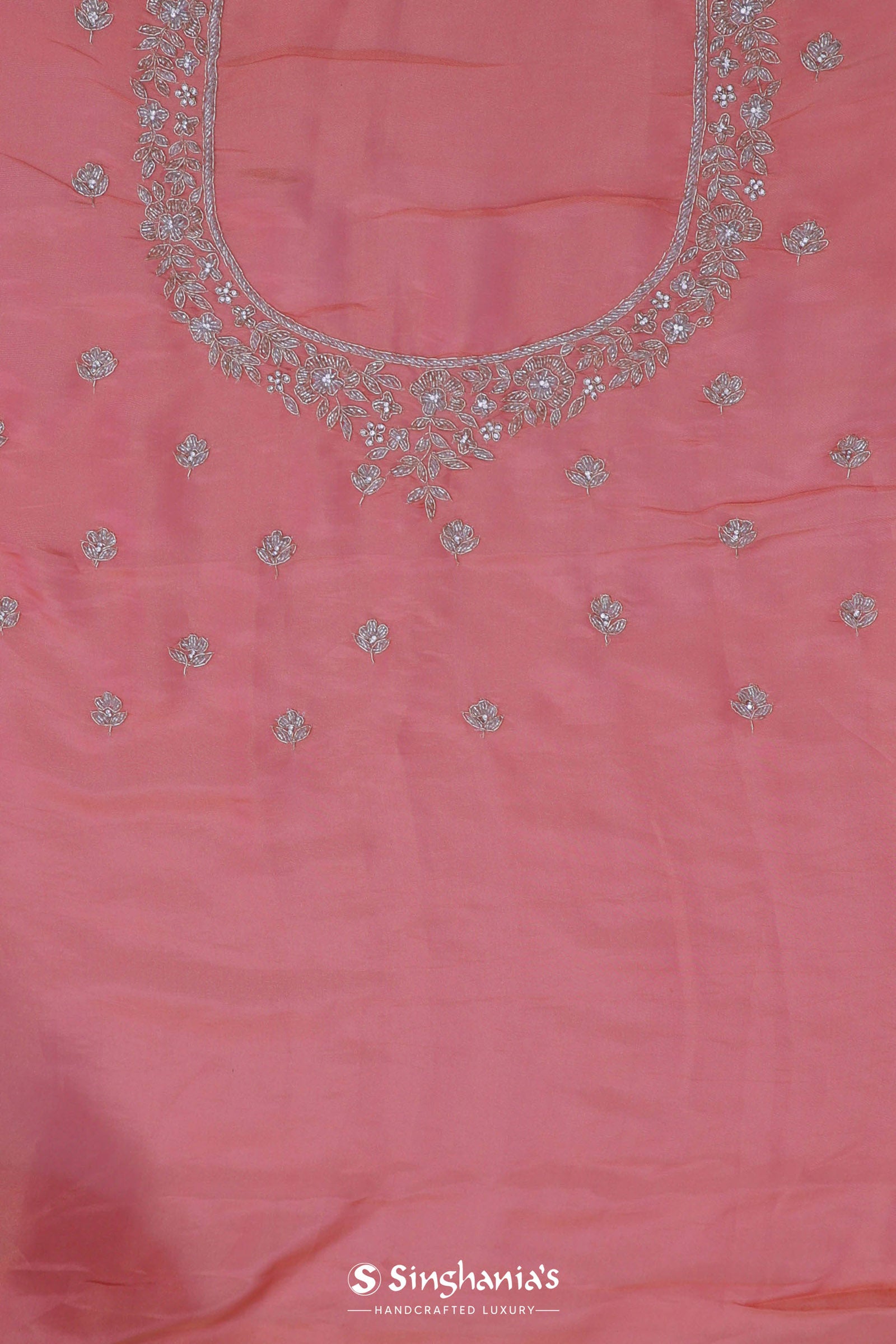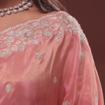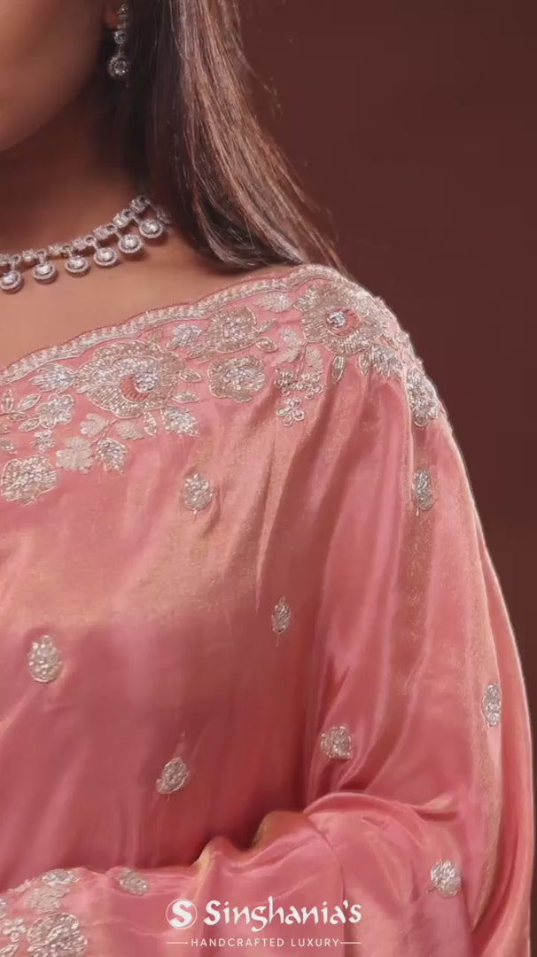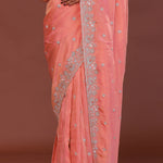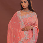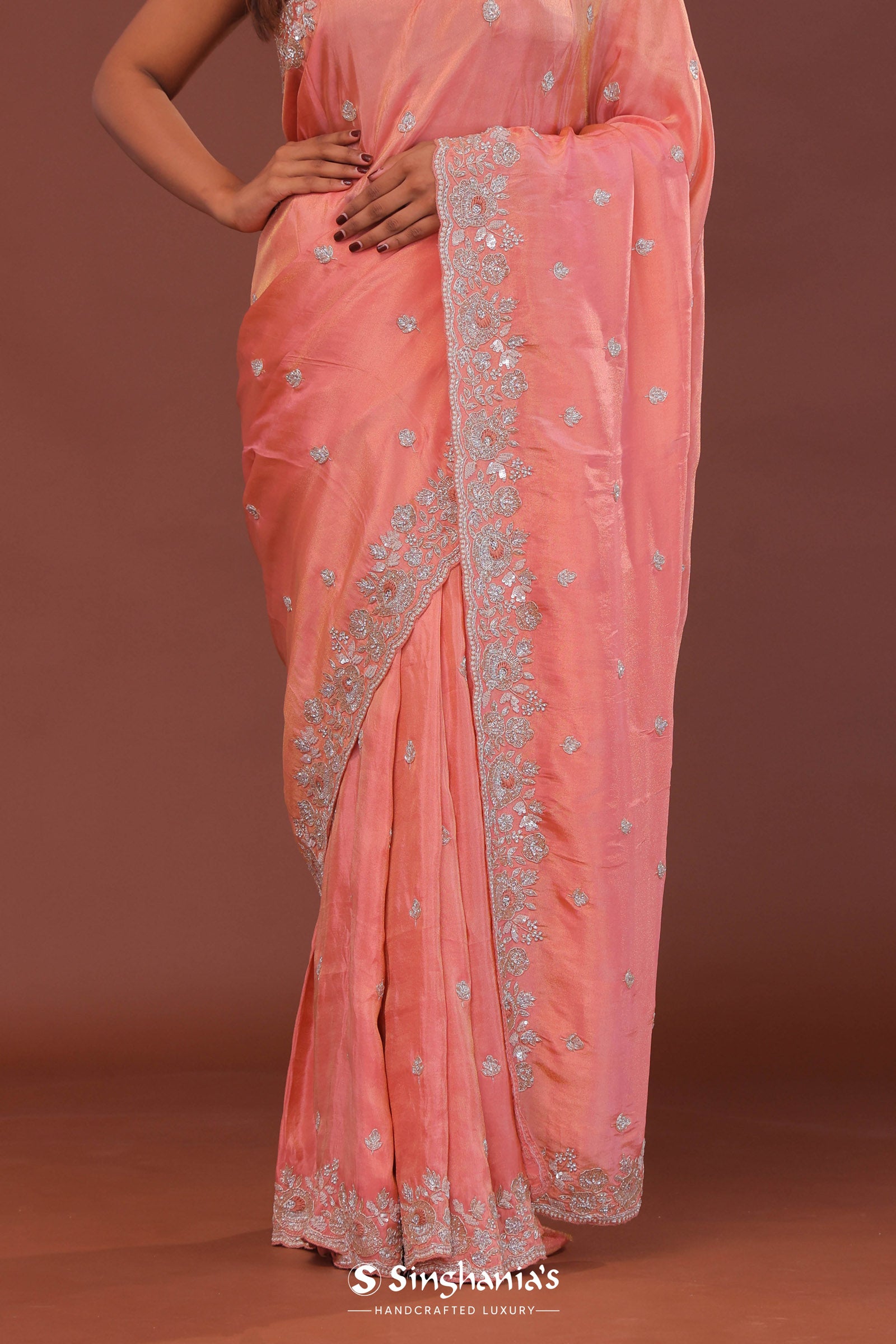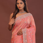 A amazing embroidered peach organza saree with delicate buttis and scalloped borders. Sequins and floral zardosi work embellish the buttis and border, lending a touch of refinement and glitz.