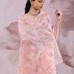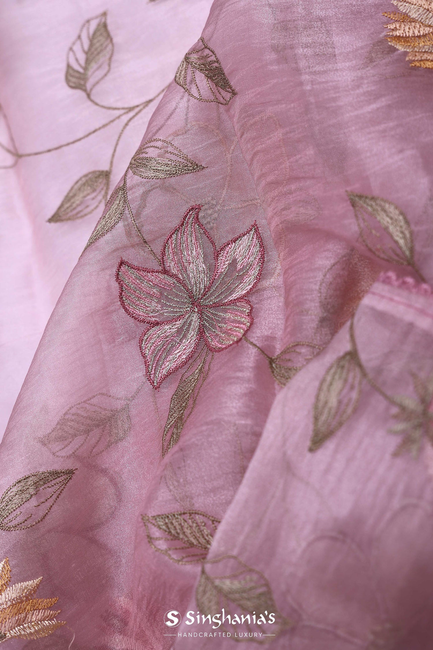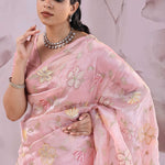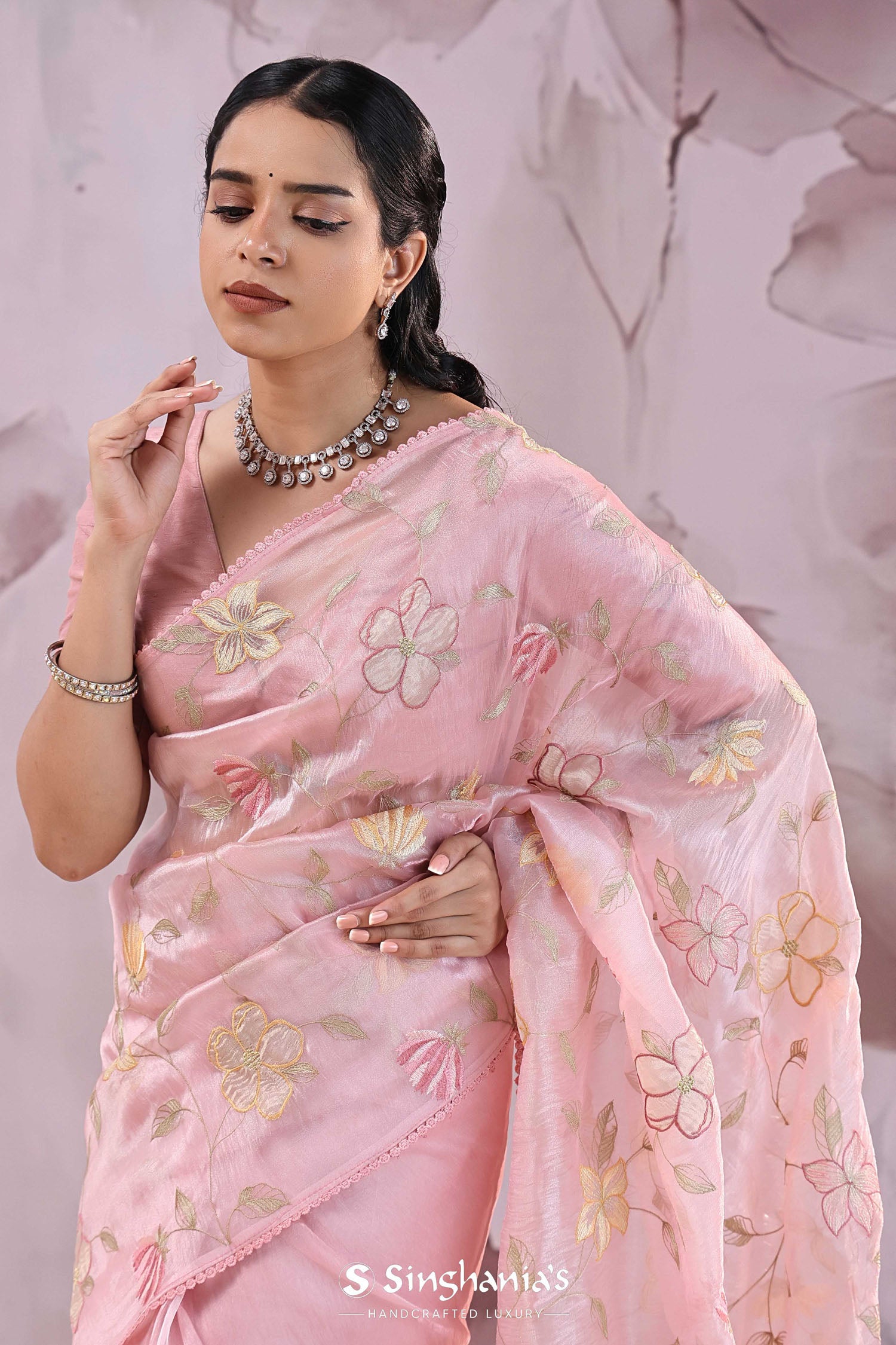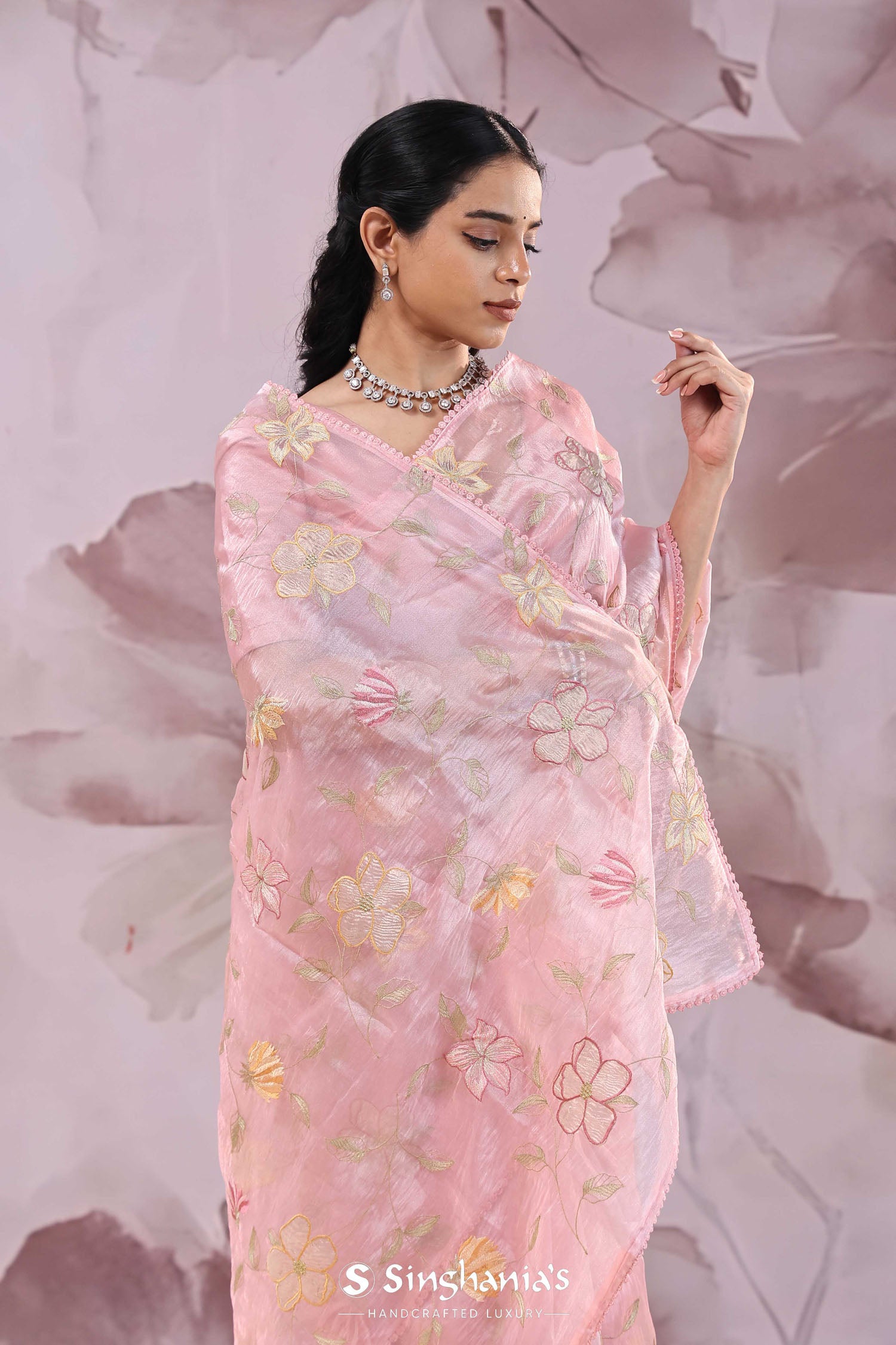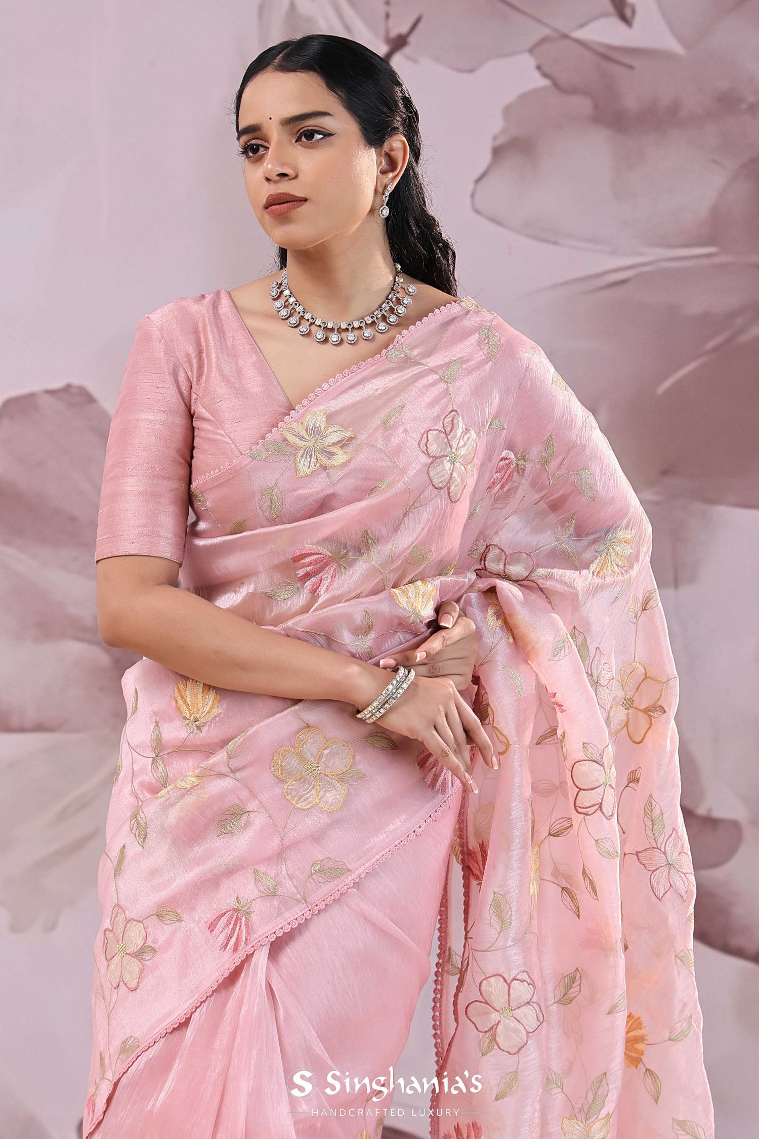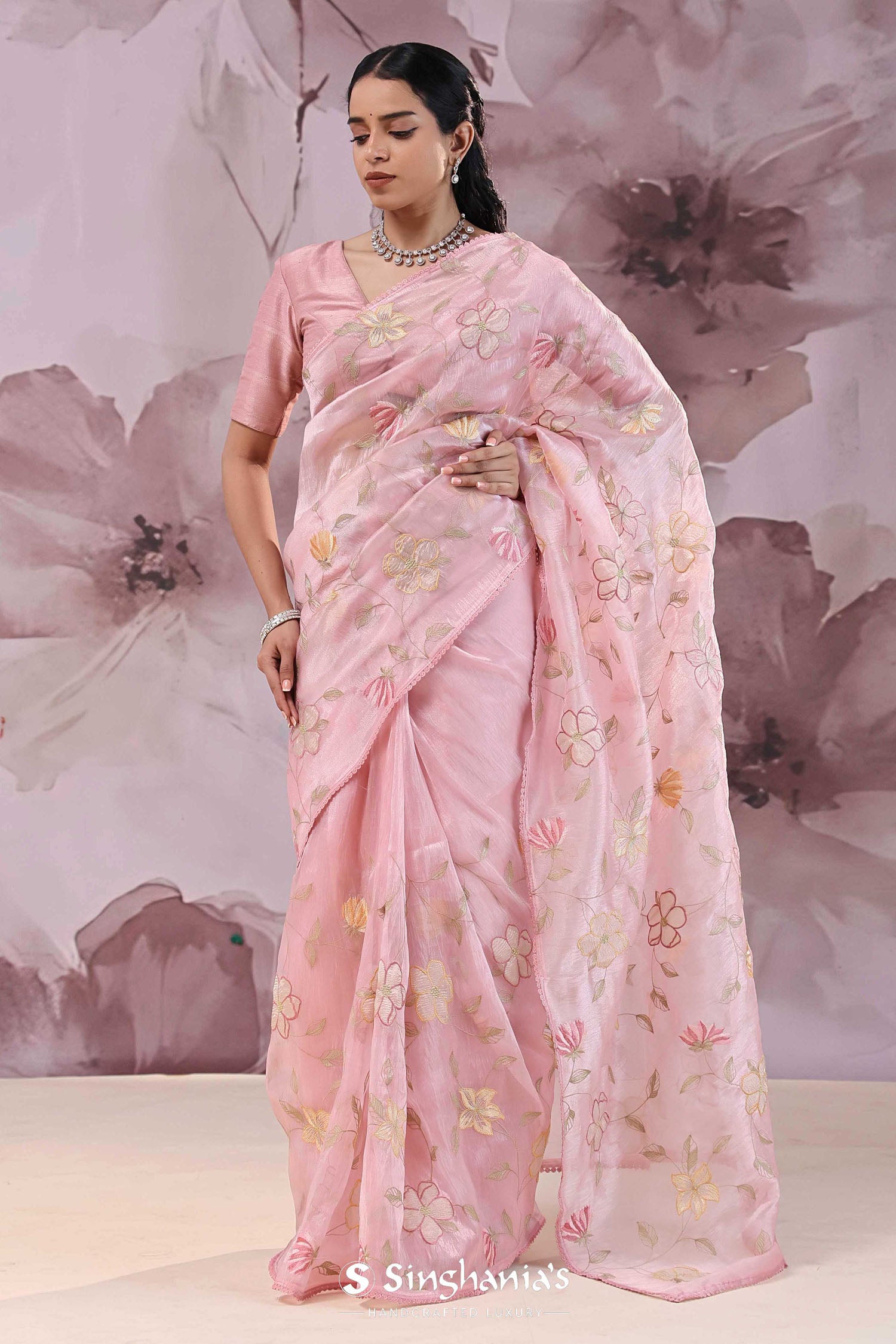 Pearl pink organza saree presents embroidered floral design along with floral embroidered border making it look elegant and classy for formal and informal event