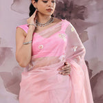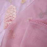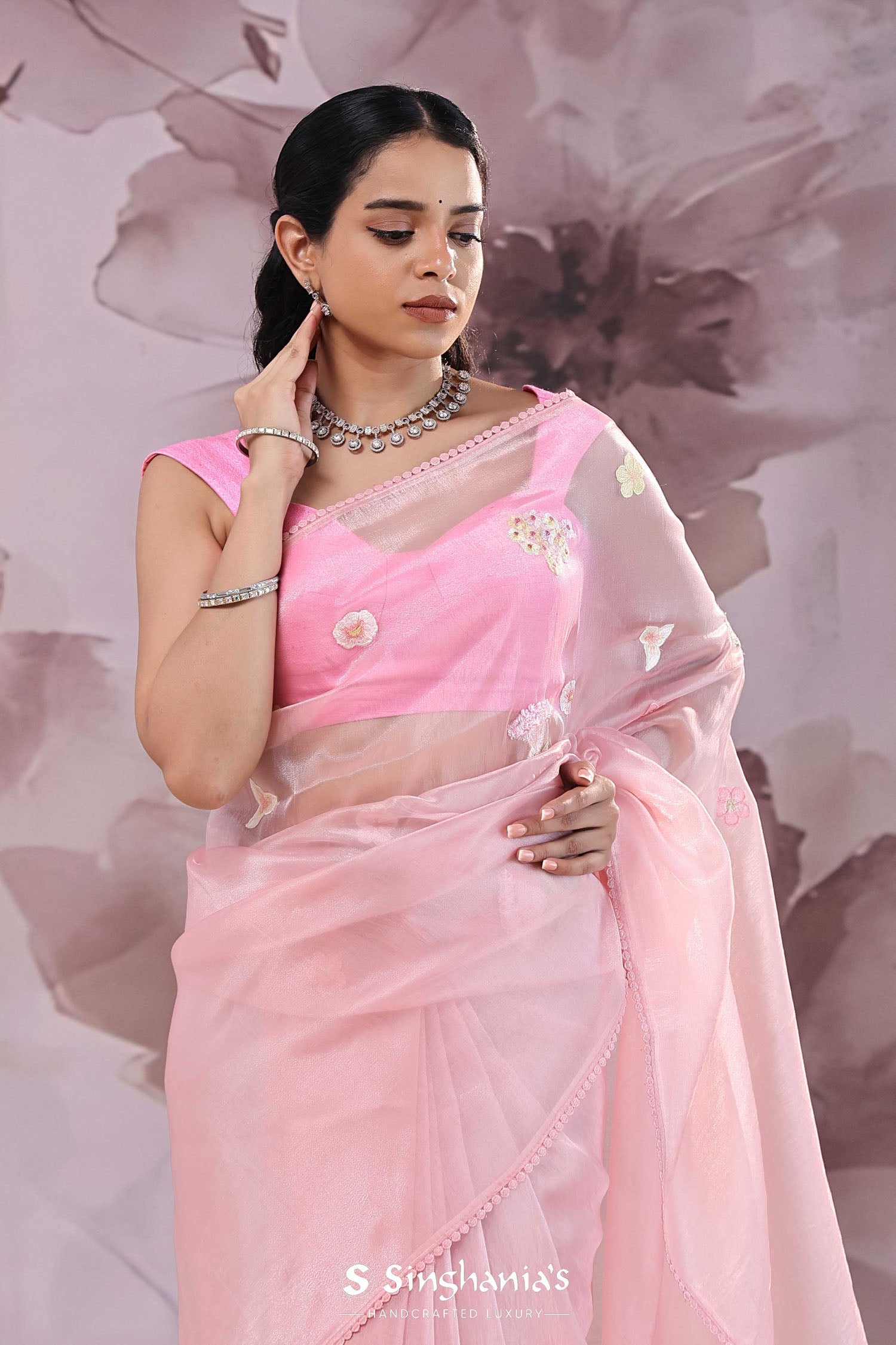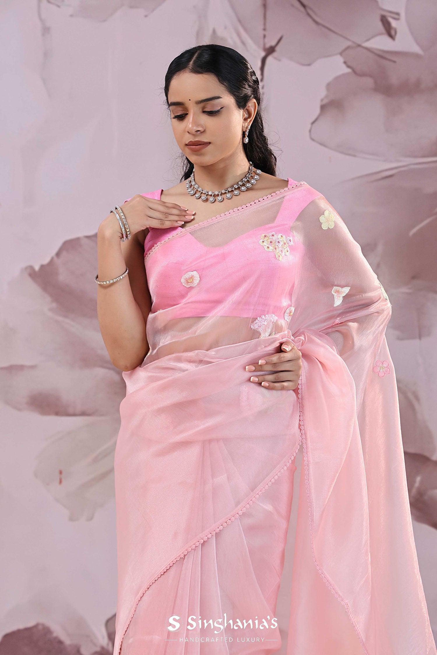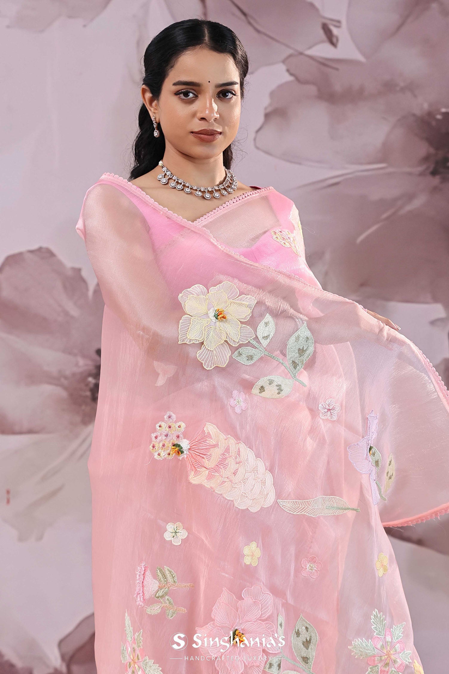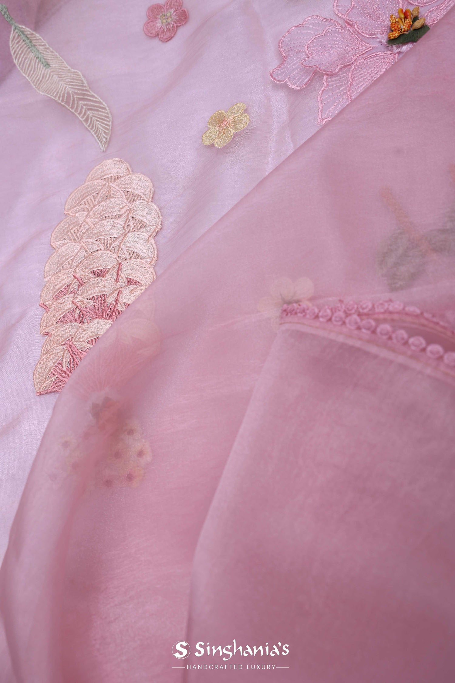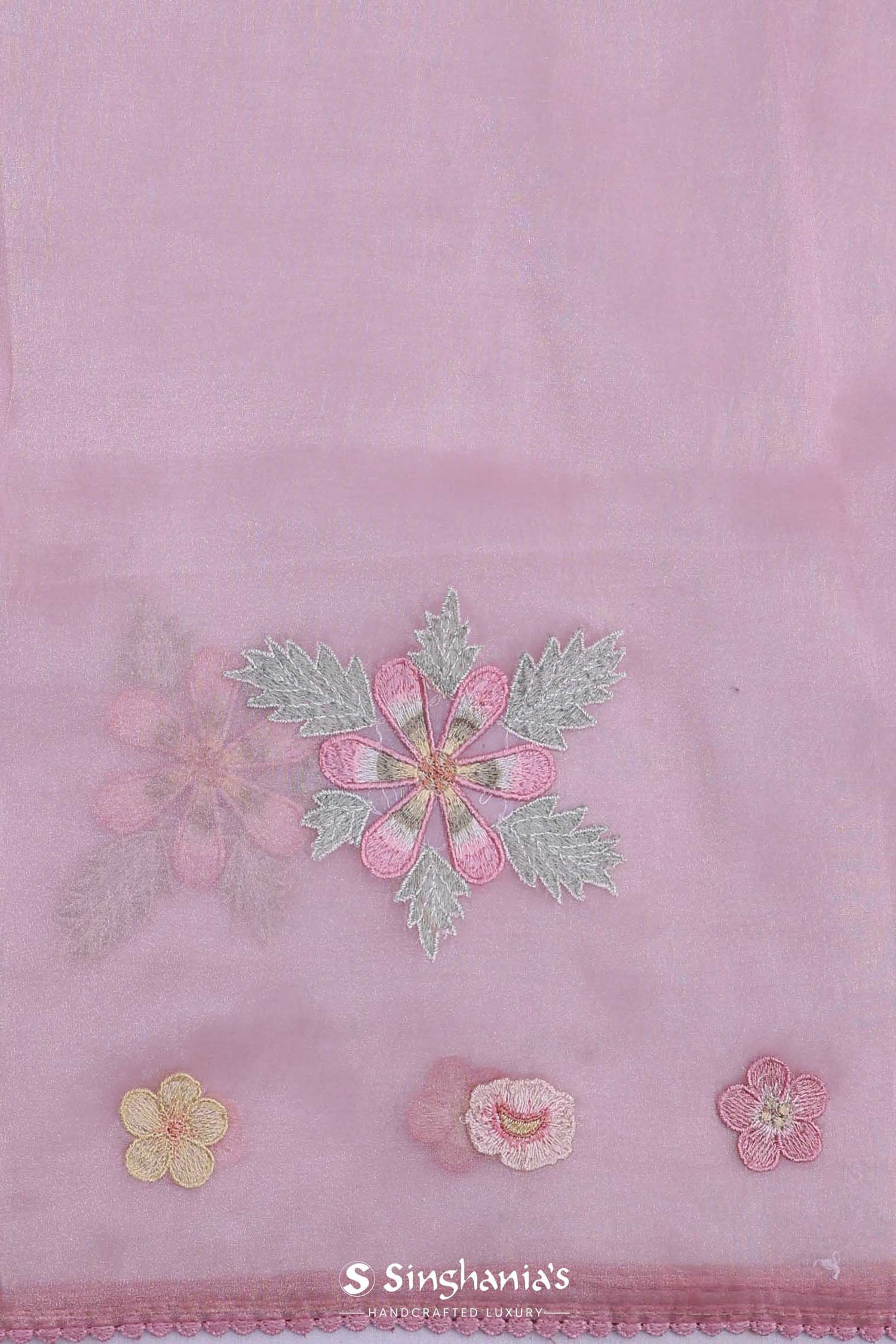 Pink lavender organza saree presents embroidered floral design along with floral embroidered border making it look elegant and classy for formal and informal event