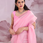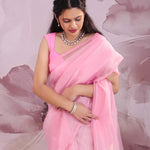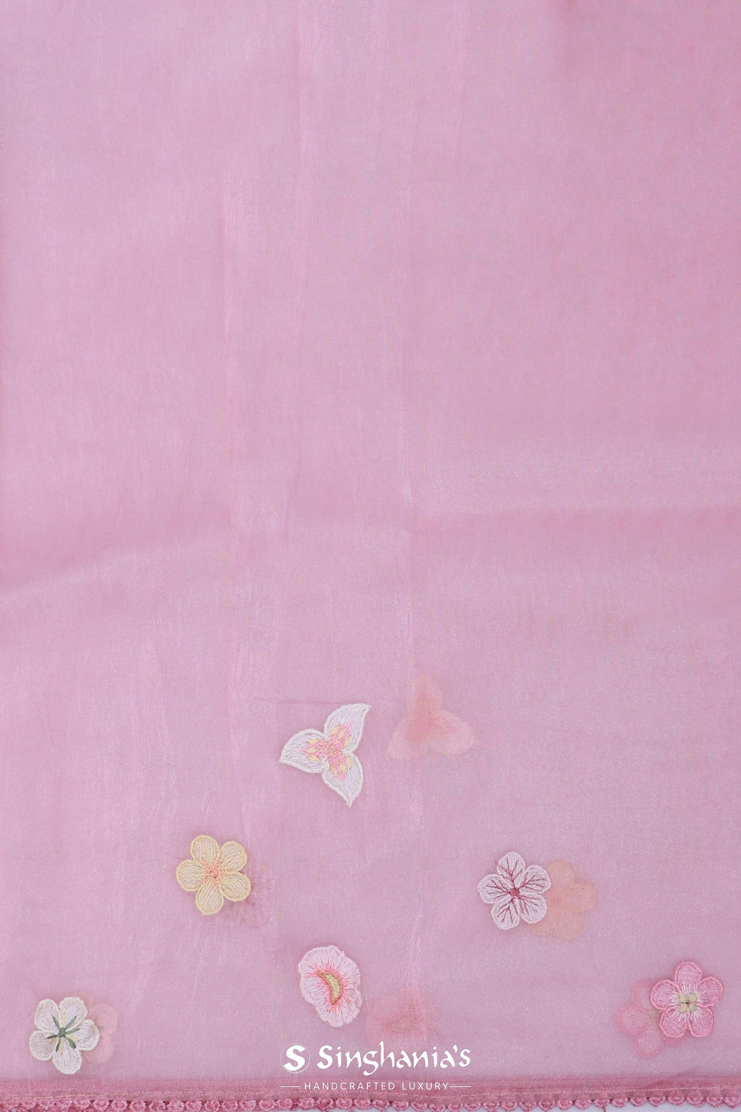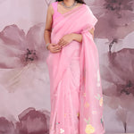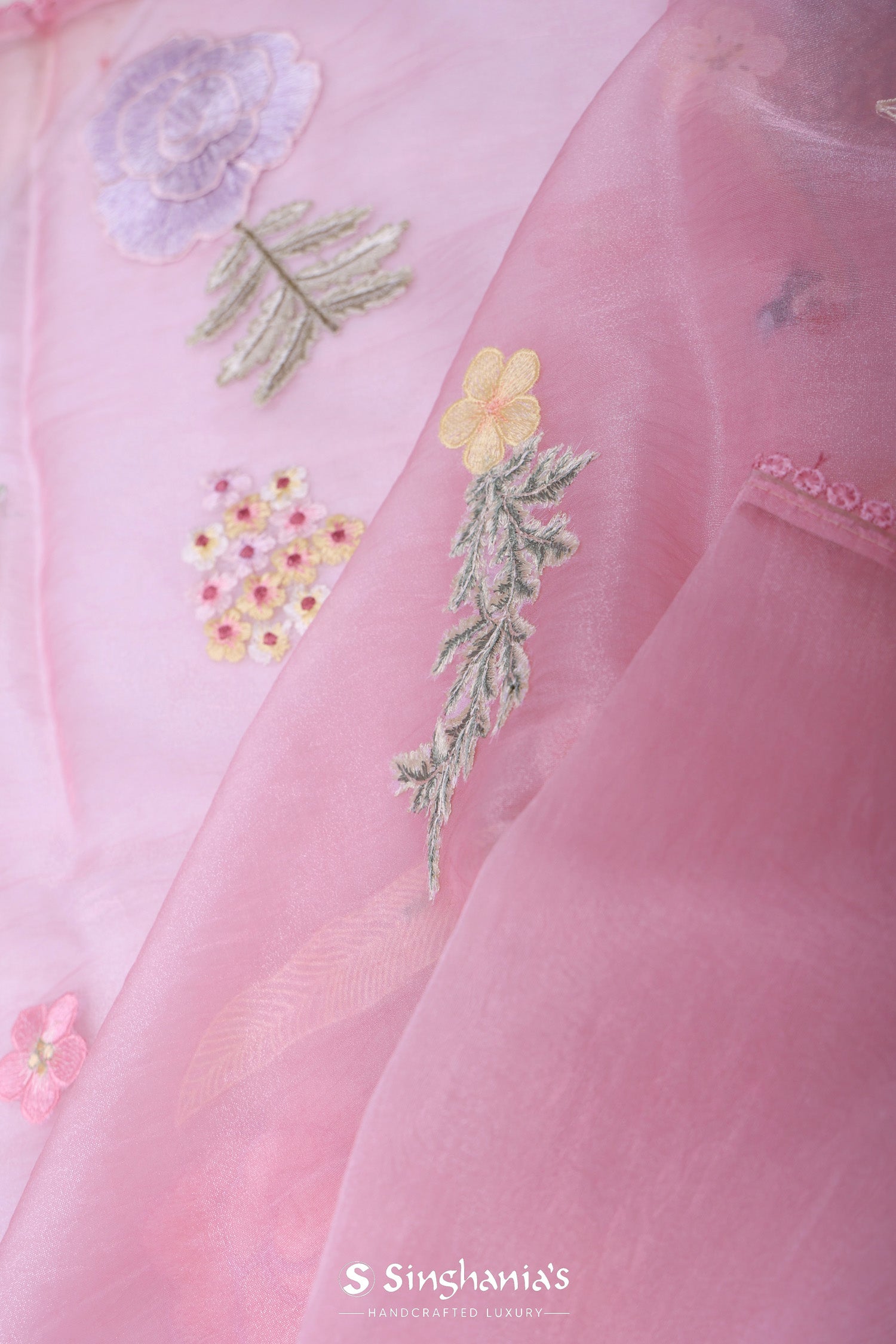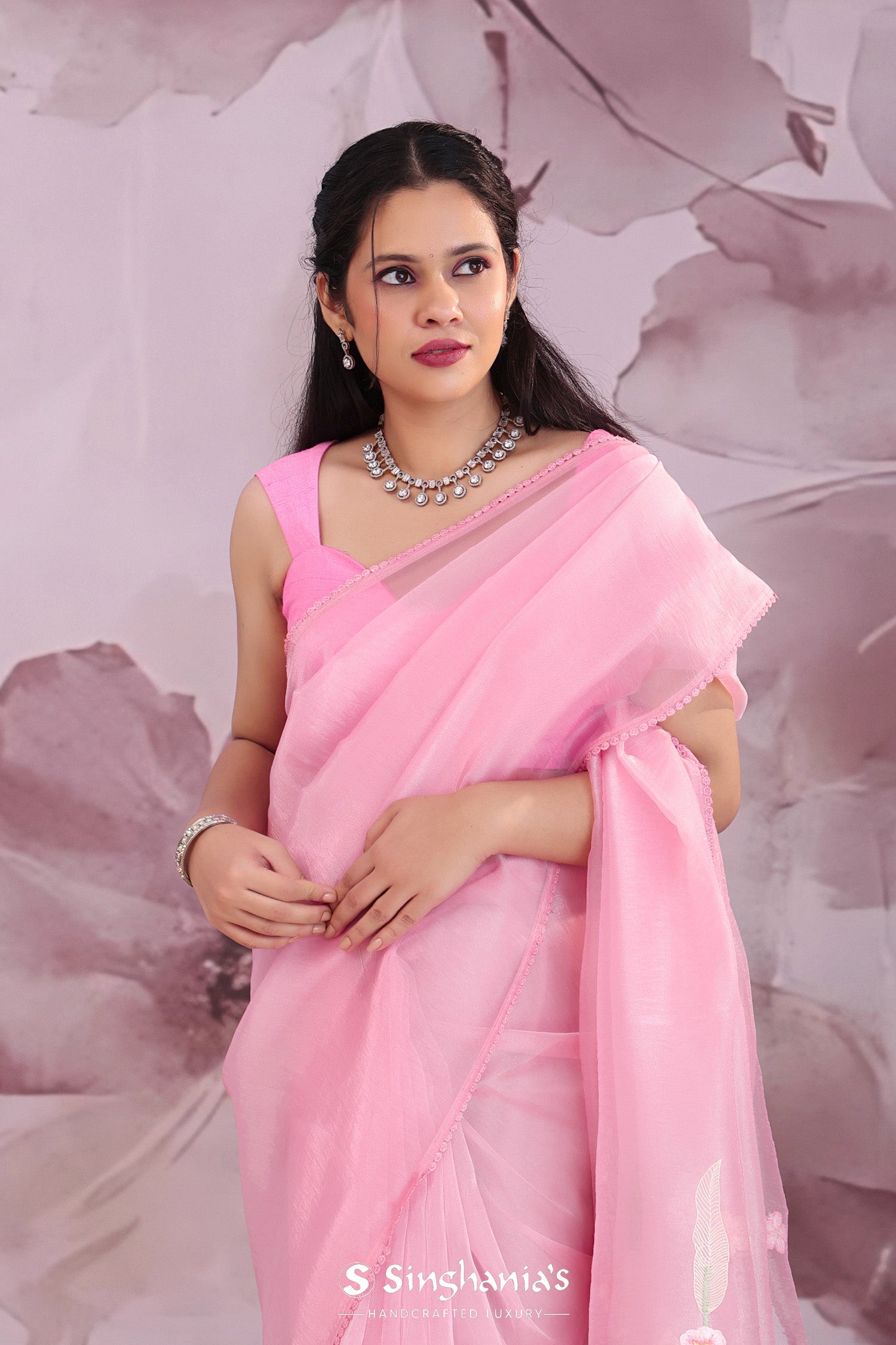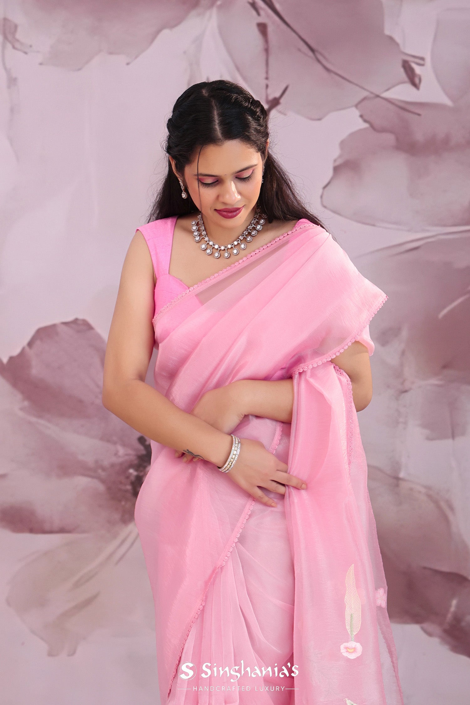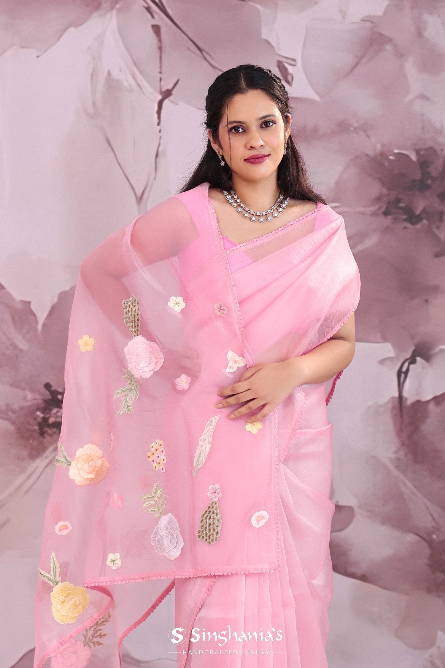 Pink organza saree features embroidery work forming various floral pattern which is adding the charm to overall look.