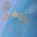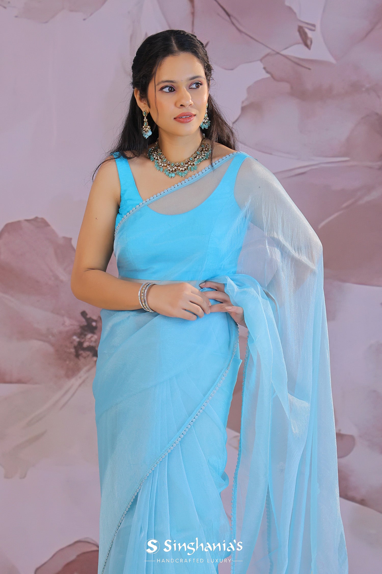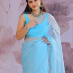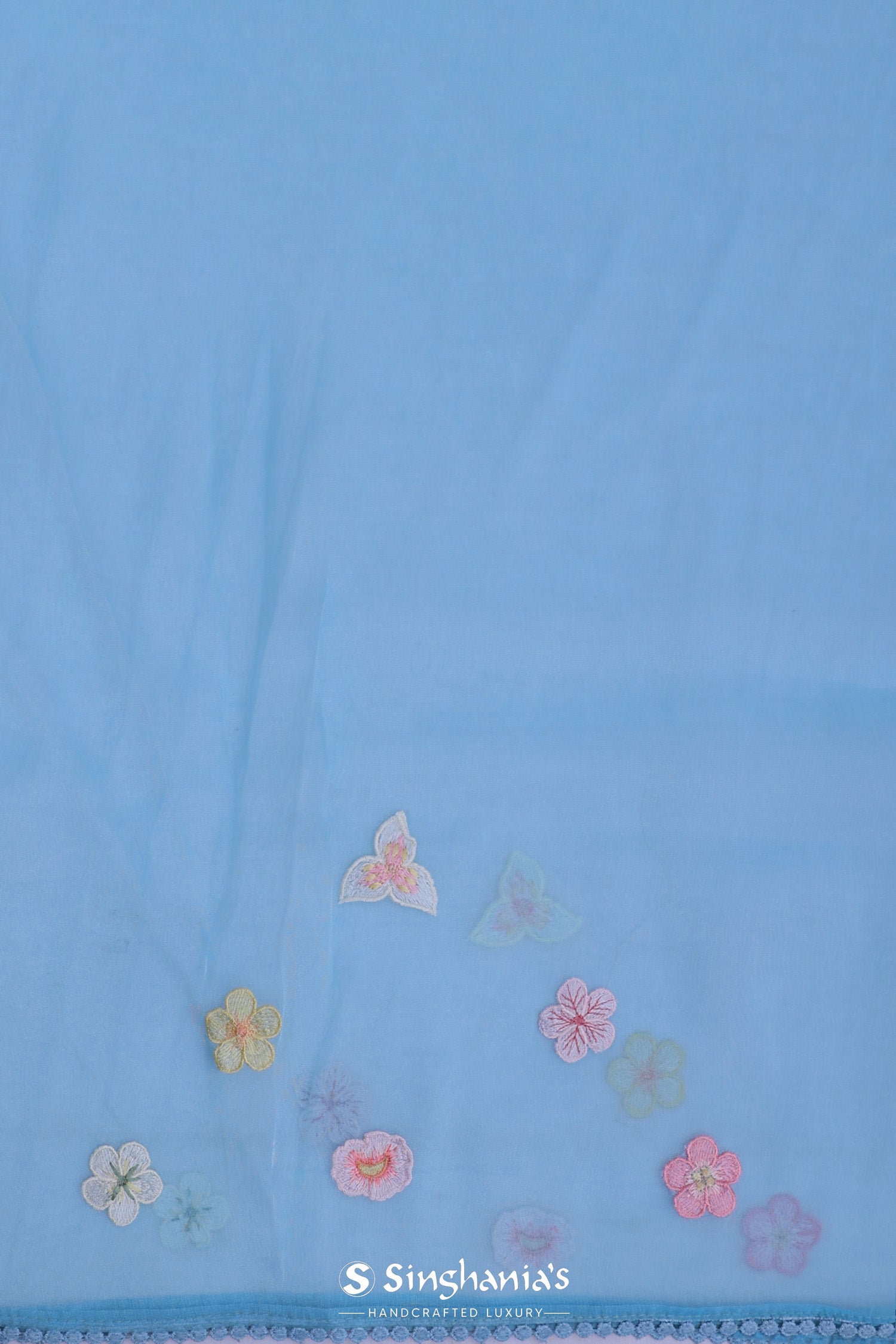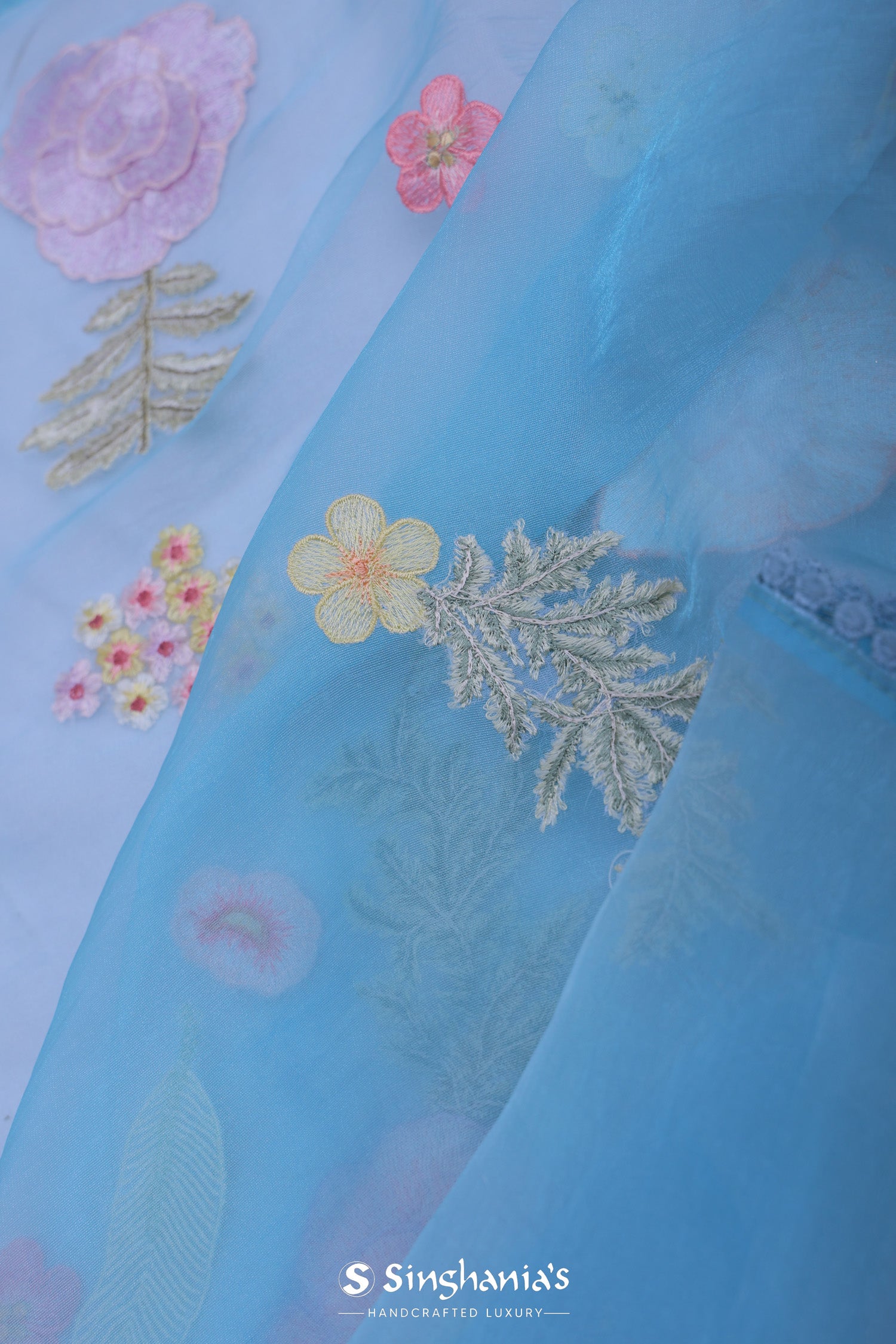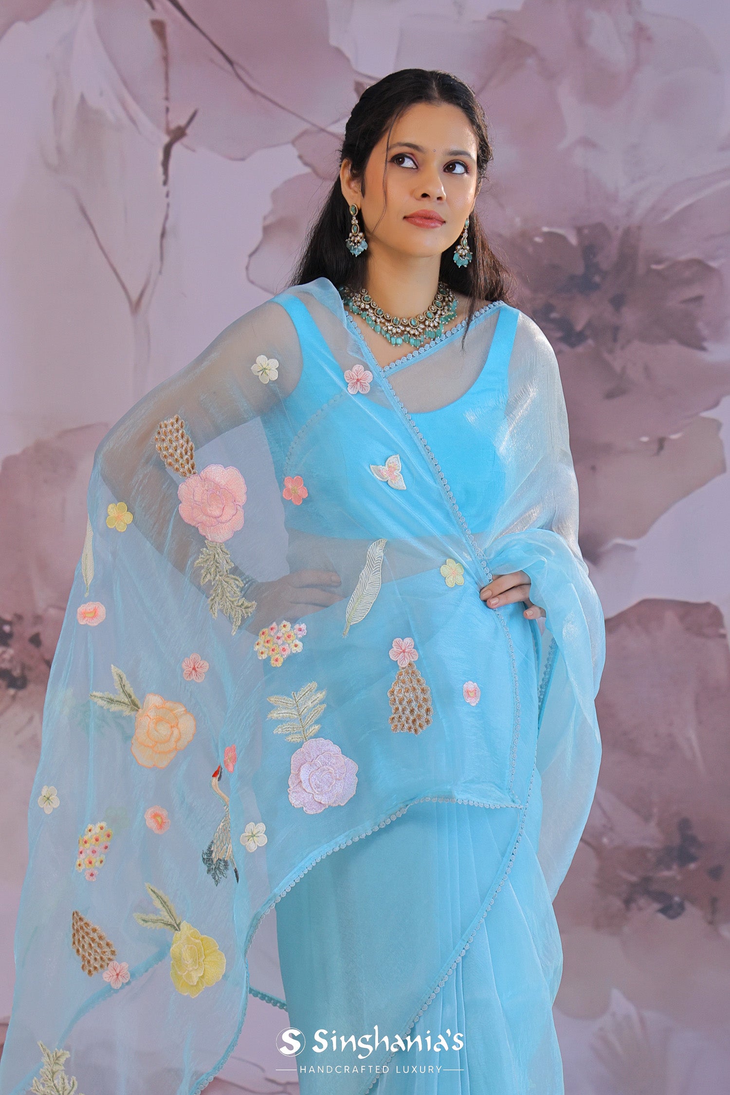 Sky blue organza saree features embroidery work forming various floral pattern which is adding the charm to overall look.