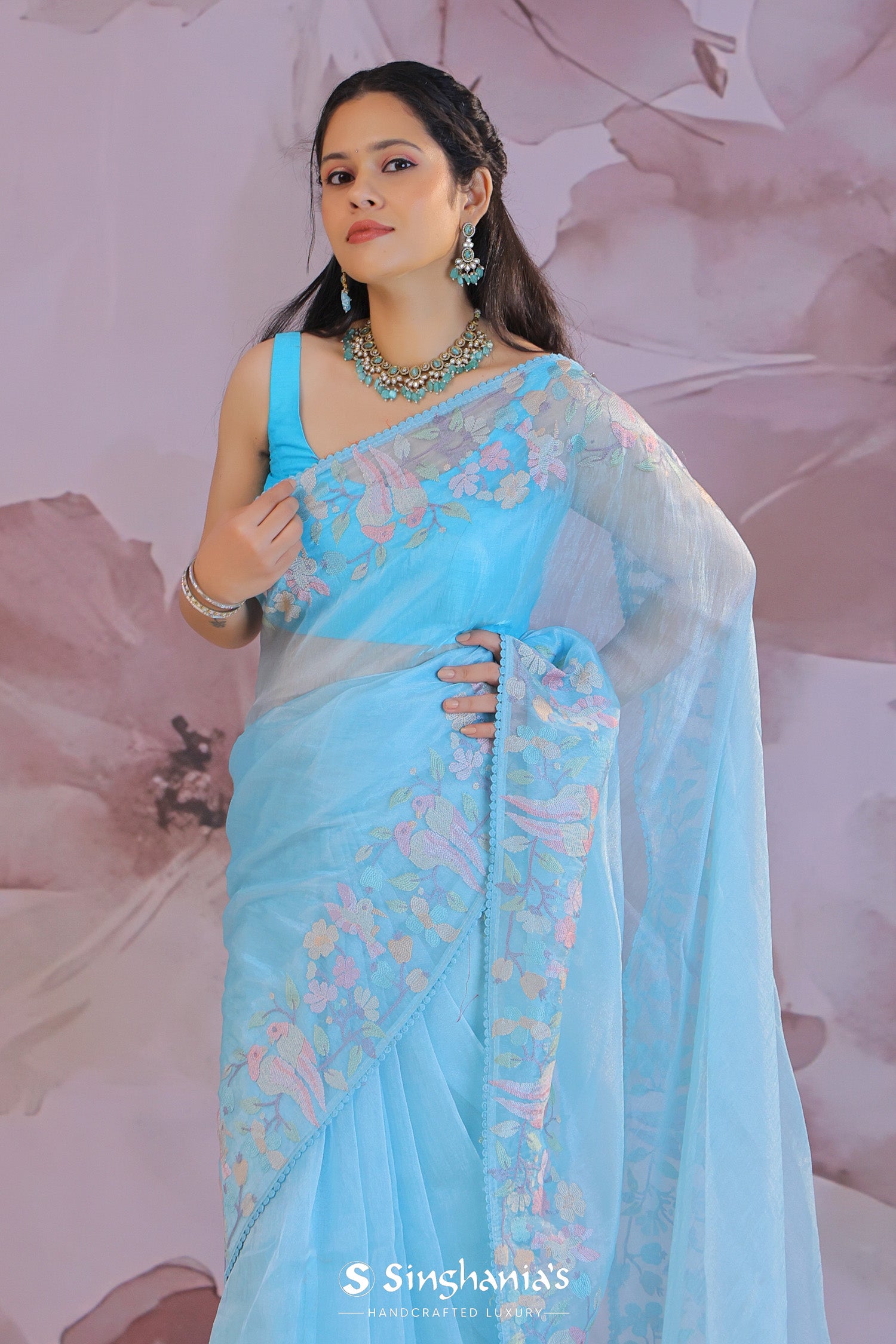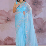 Sky Blue Organza Tissue Saree With Embroidery Work