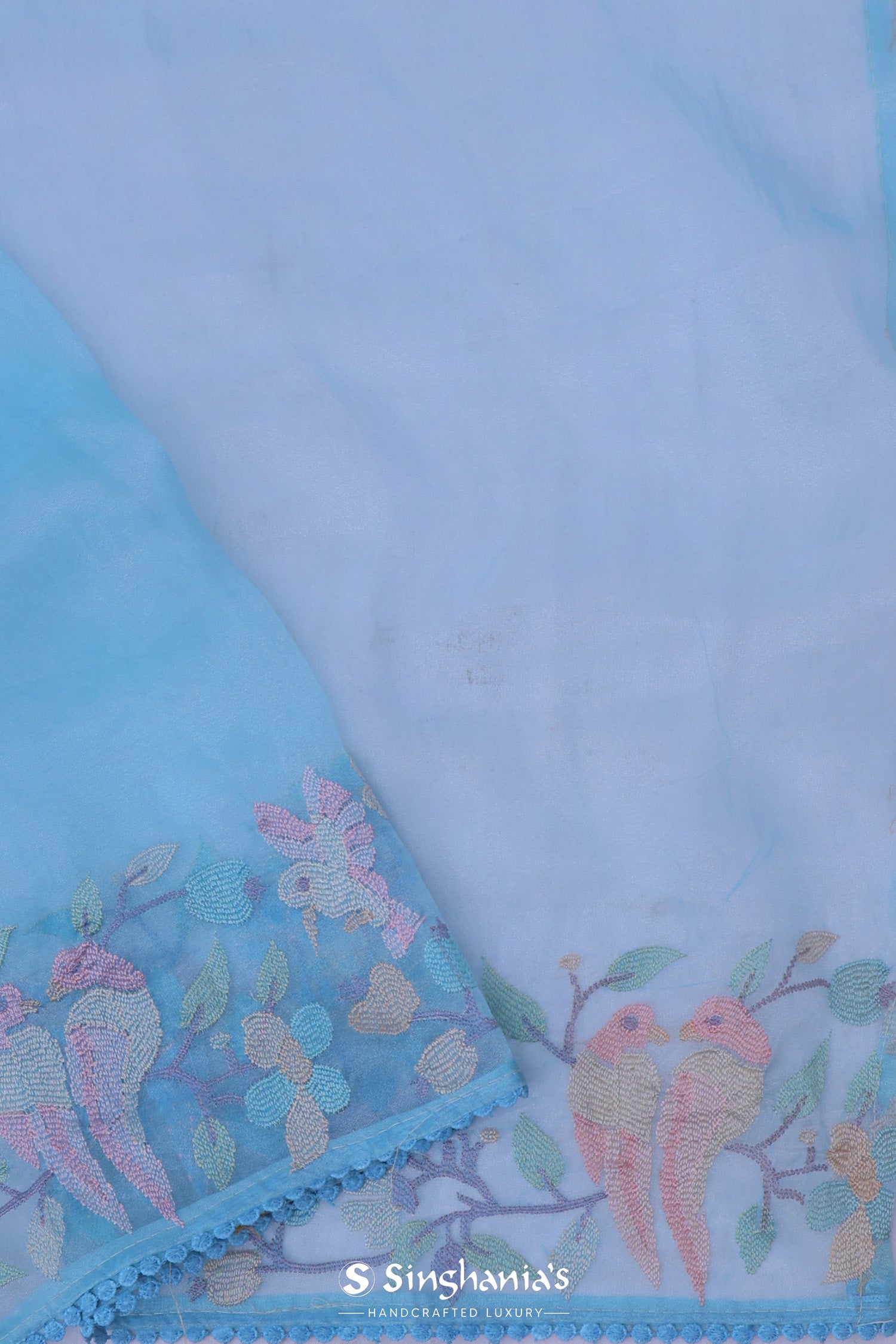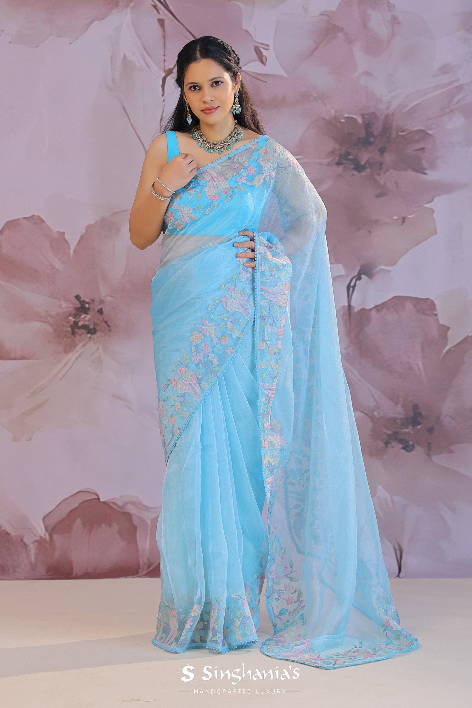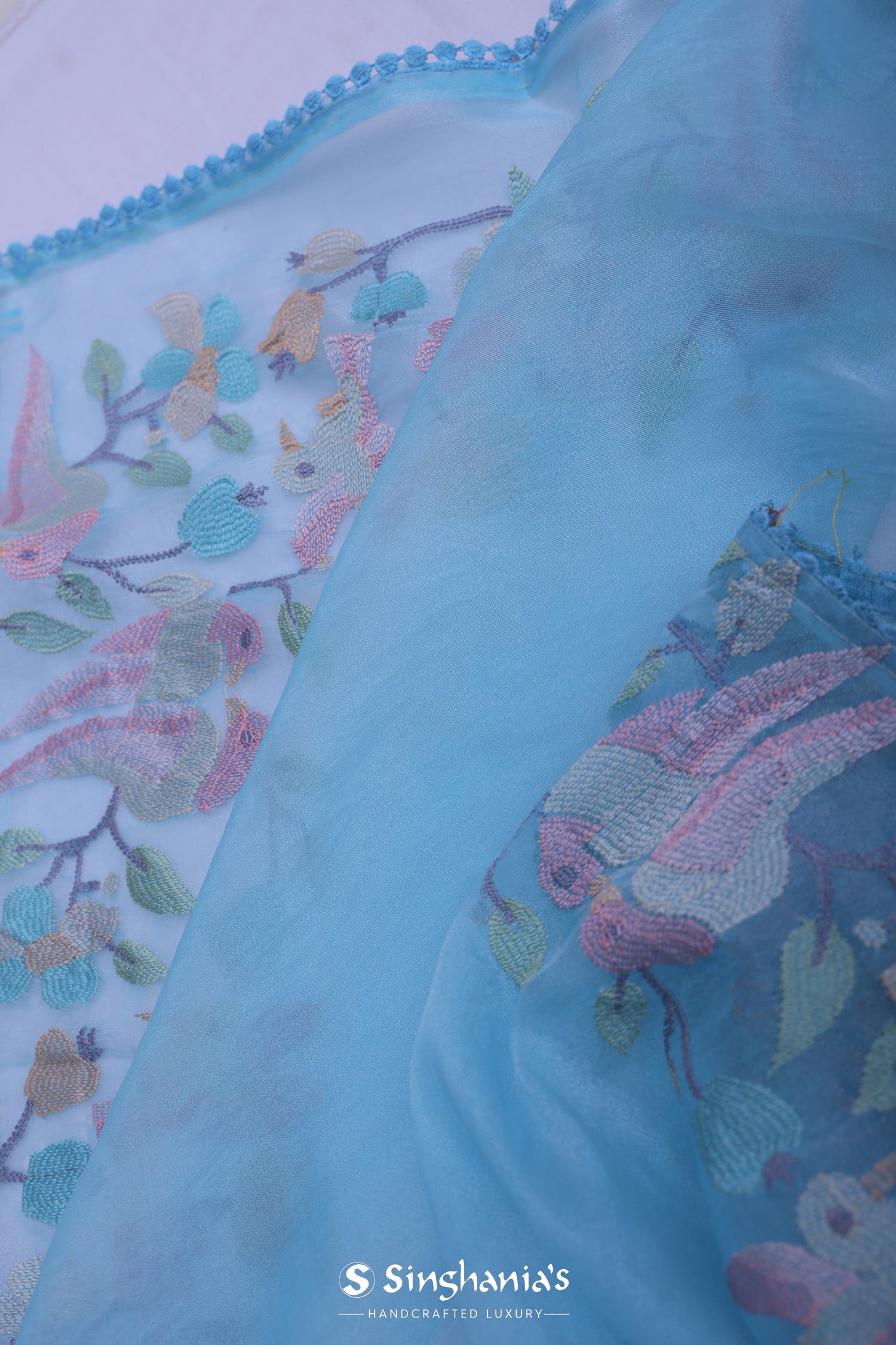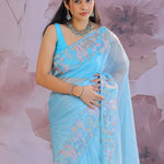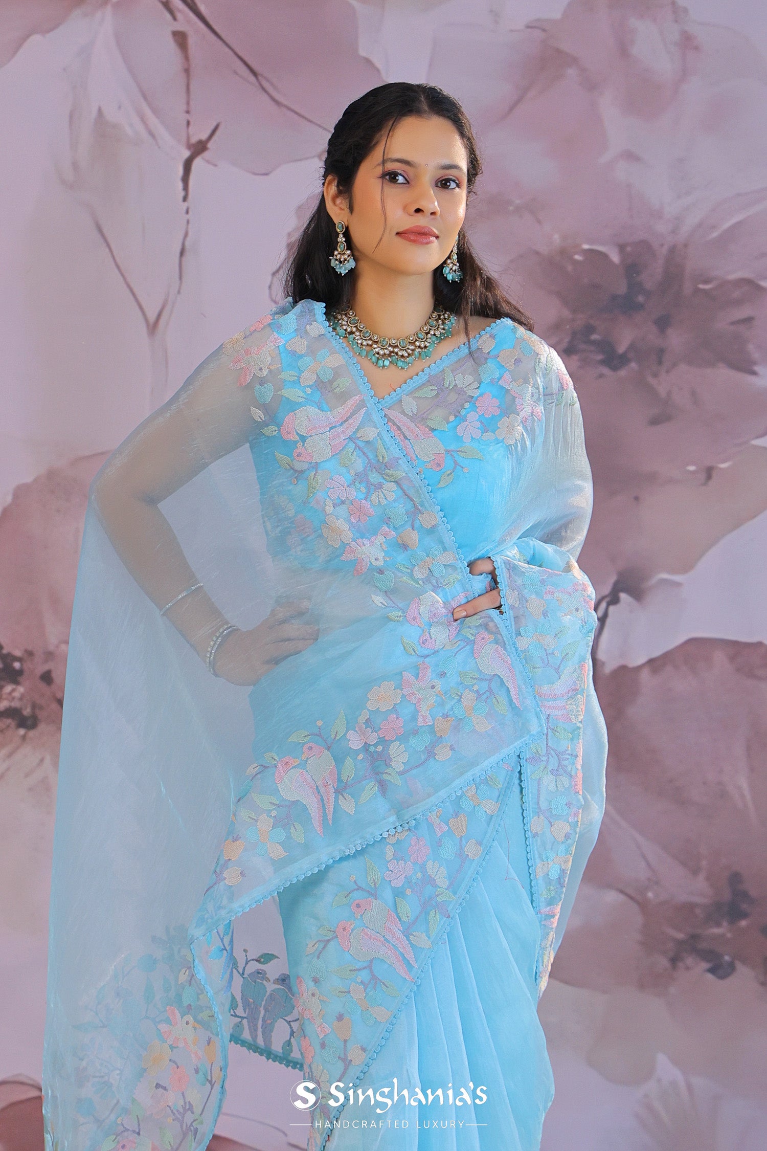 It is embellished with avian and floral figures all along the border of this stunning Sky blue organza tissue saree.Which would light up every moment when you drape yourself with this .