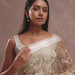 This soft beige organza embroidery saree blends grace with sophistication which is decorated with a delicate floral jaal across the body, the saree presents a scalloped border embellished with pearls and astronishing embroidery, adding a subtle shimmer.
