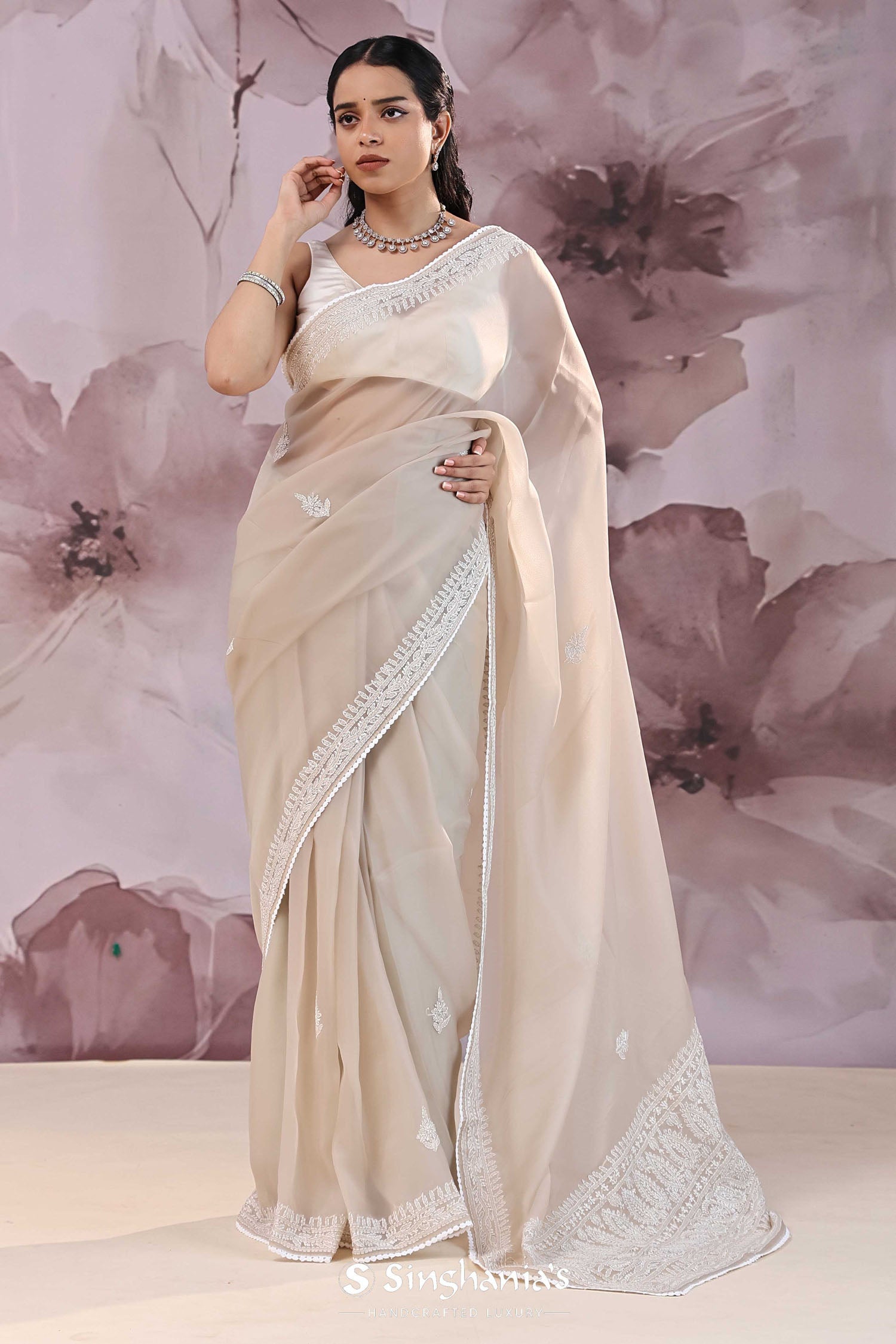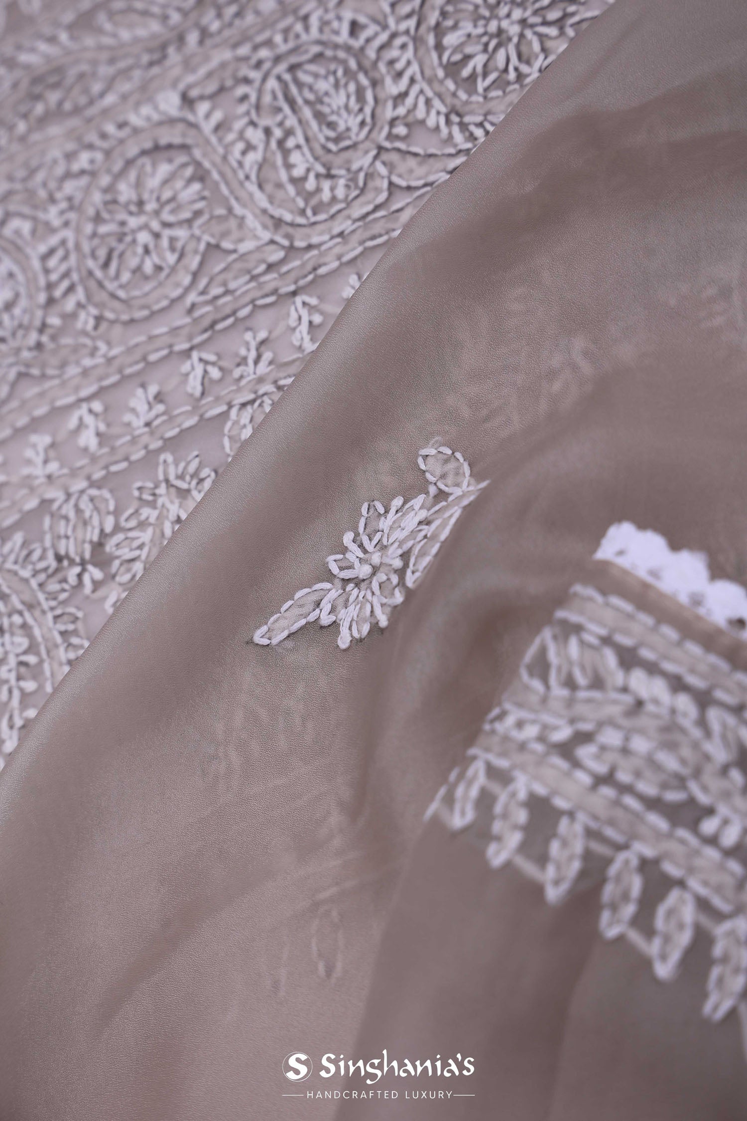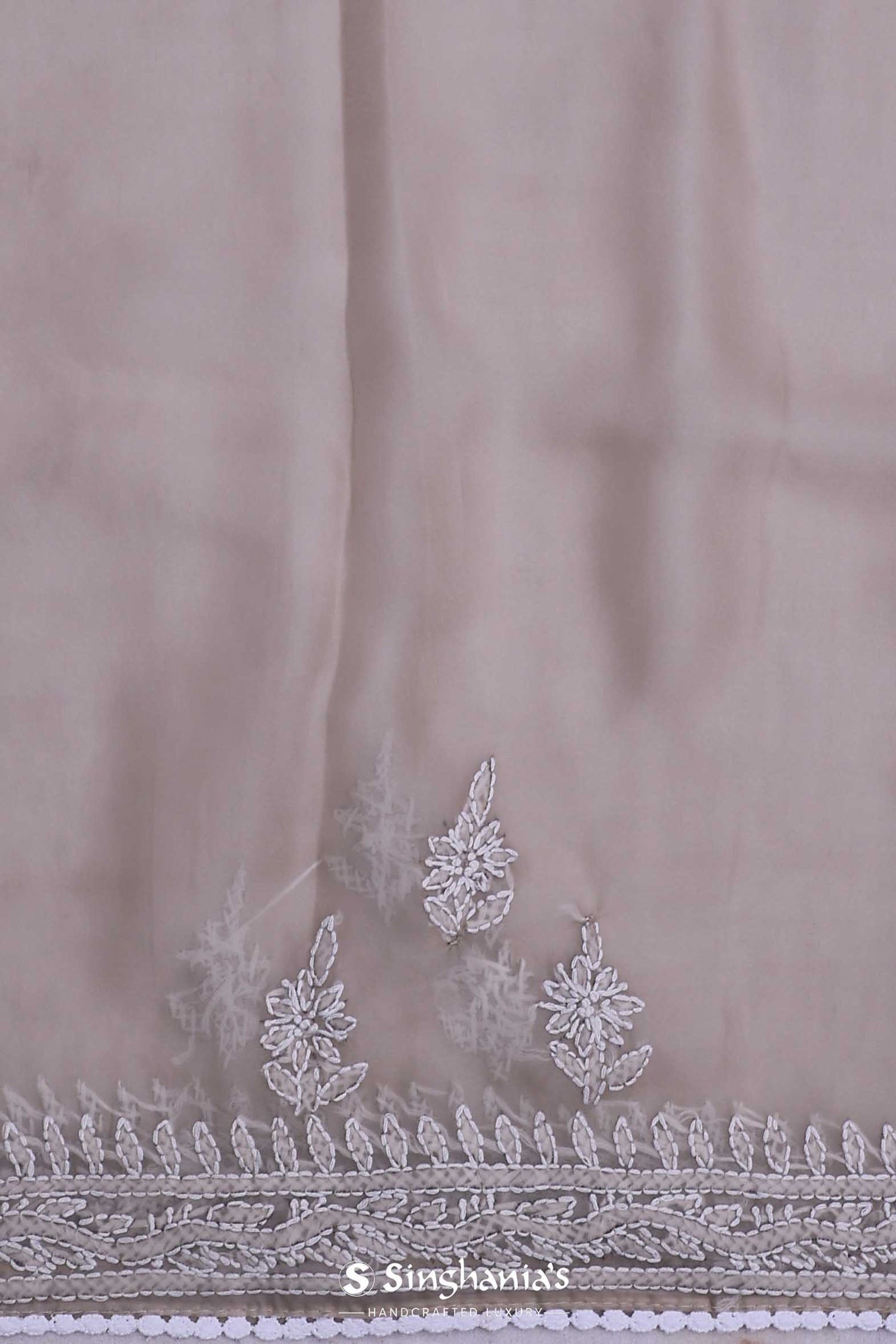 Warm grey organza saree presents embroidered floral design along with floral embroidered scallop border making it look elegant and classy for formal and informal event