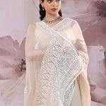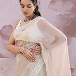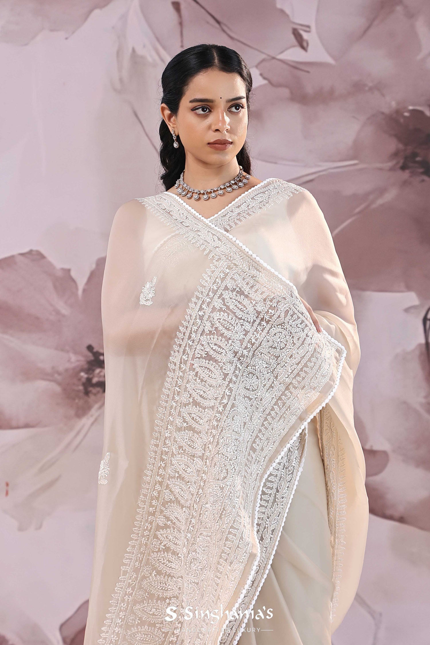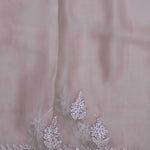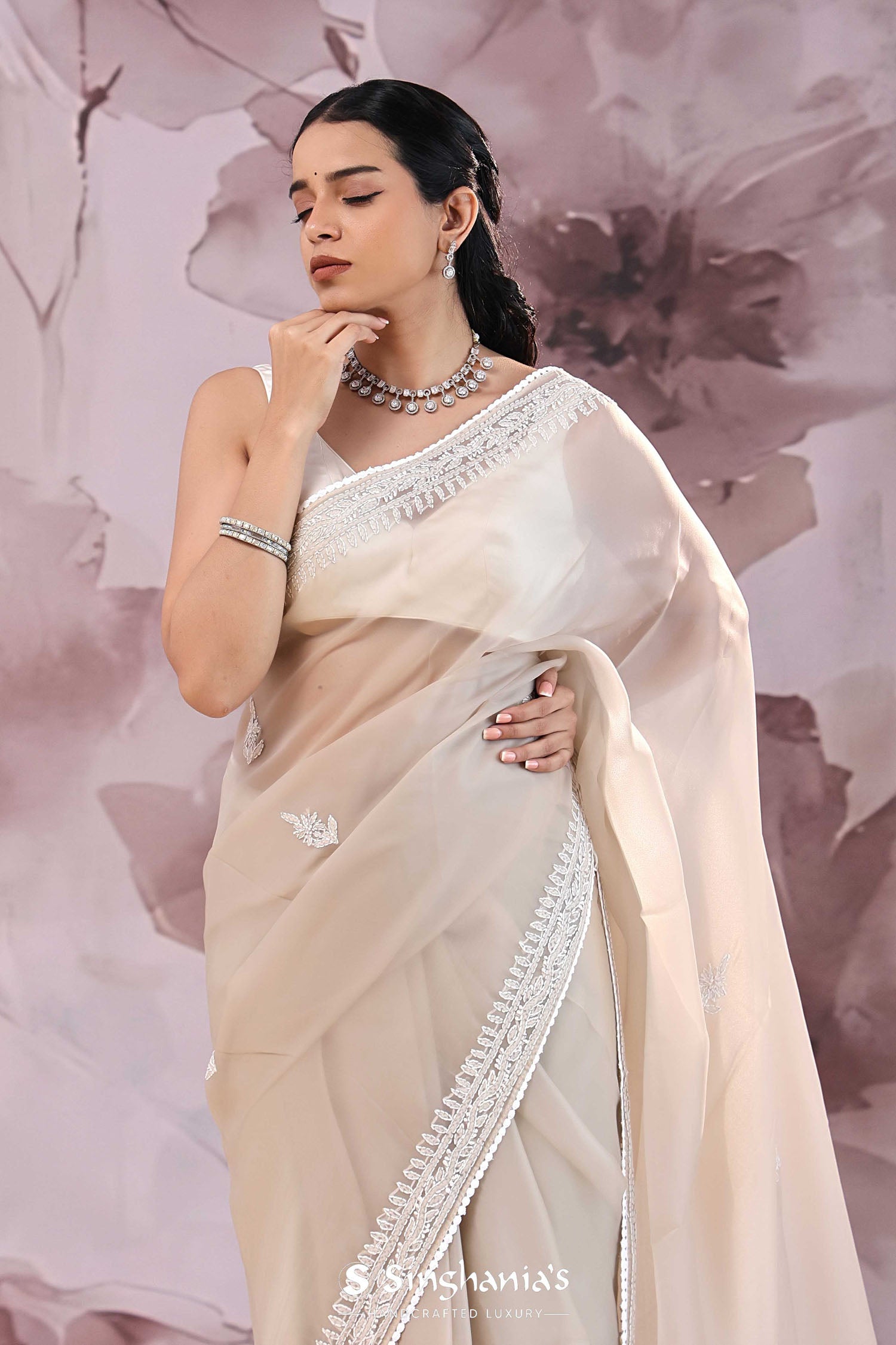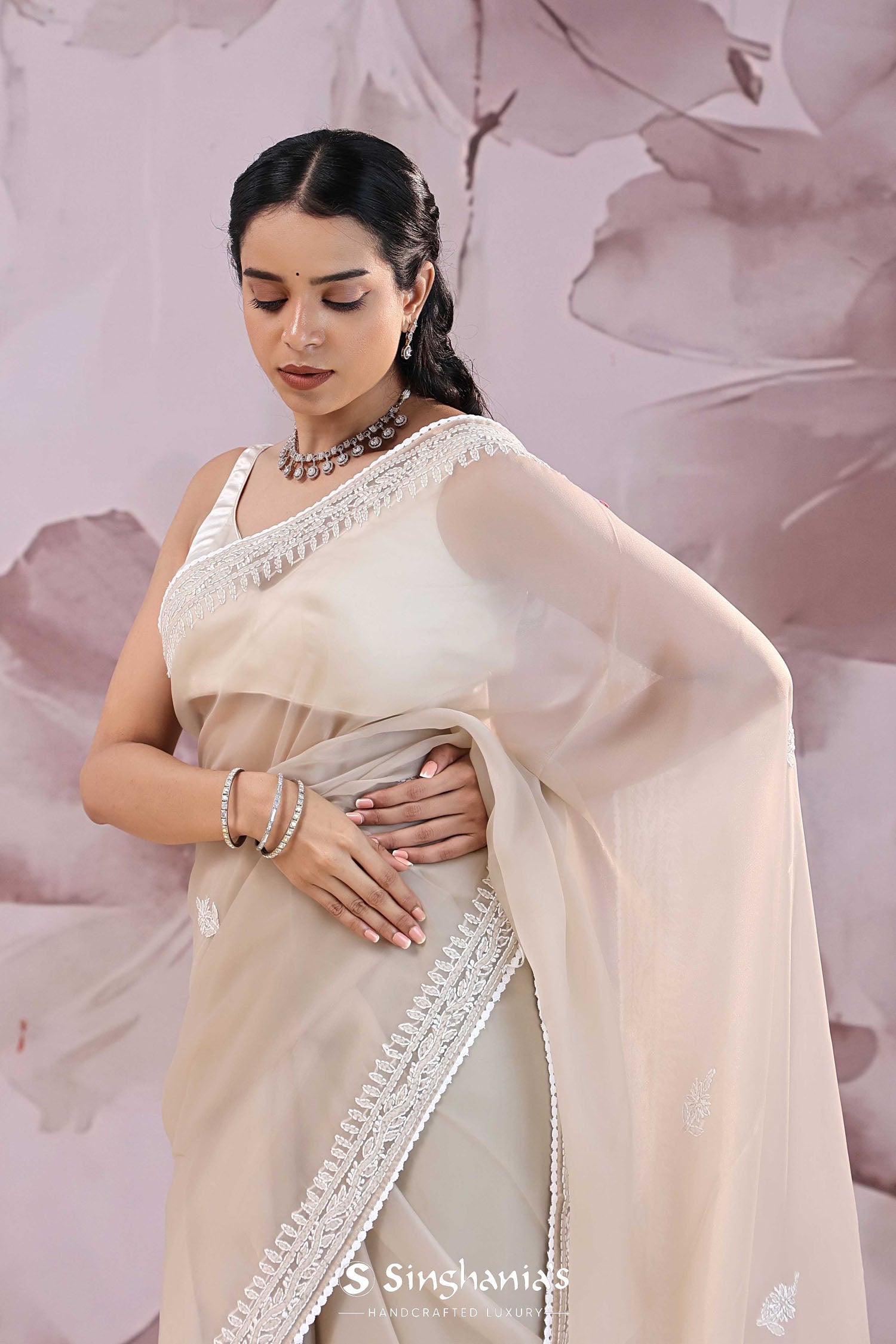 Warm grey organza saree presents embroidered floral design along with floral embroidered scallop border making it look elegant and classy for formal and informal event