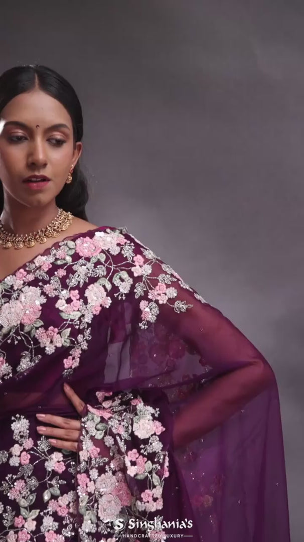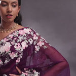 Wine Tissue Organza Embroidery Saree With Floral Border