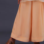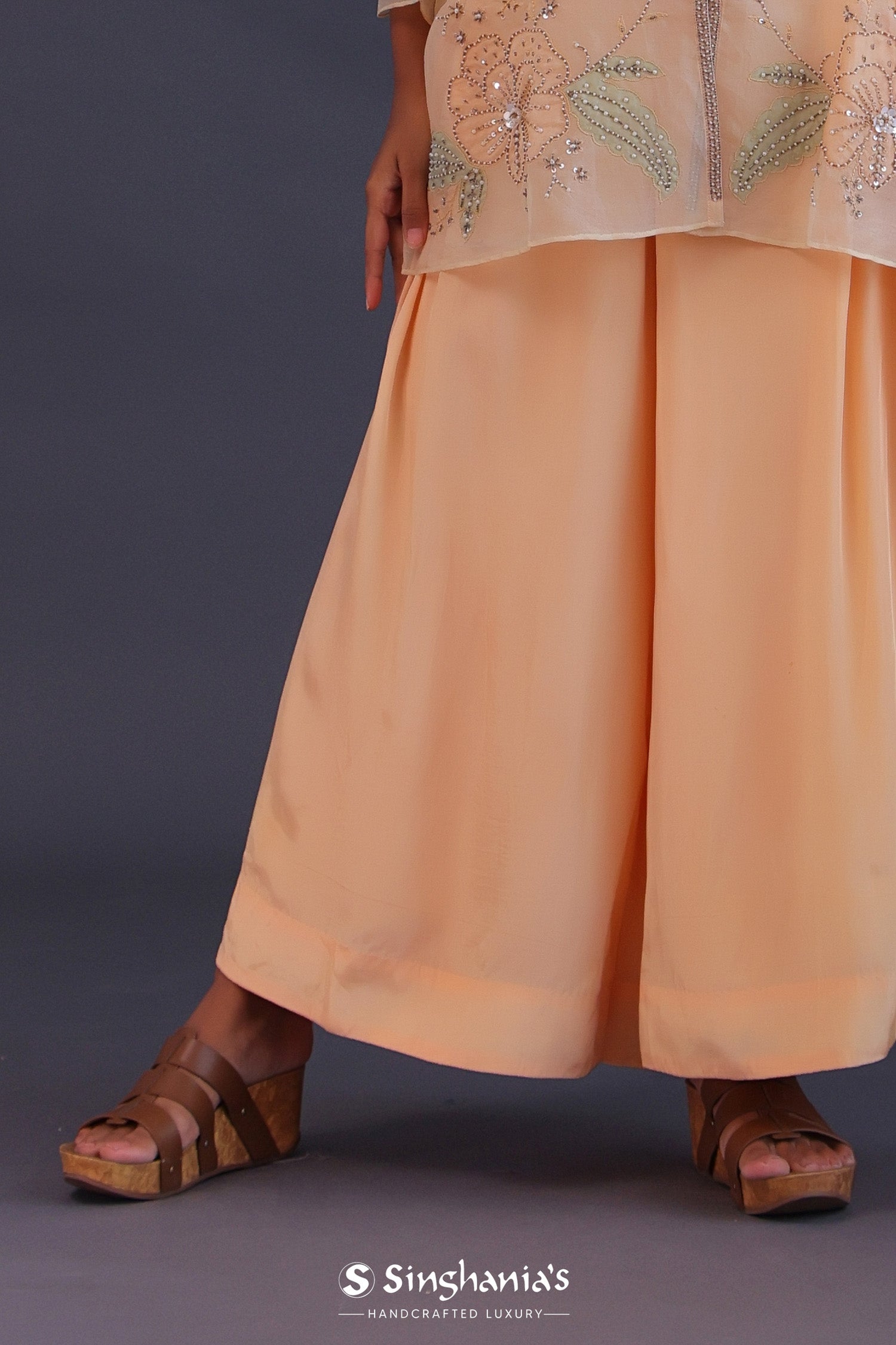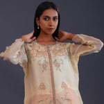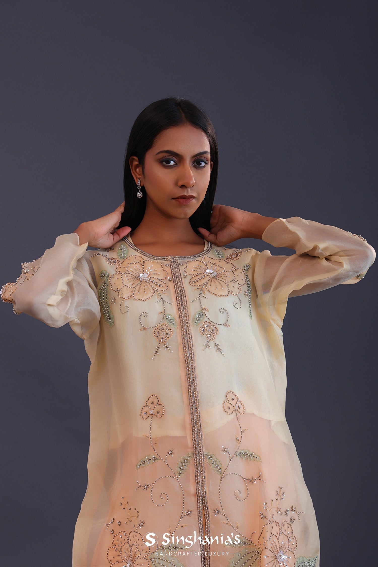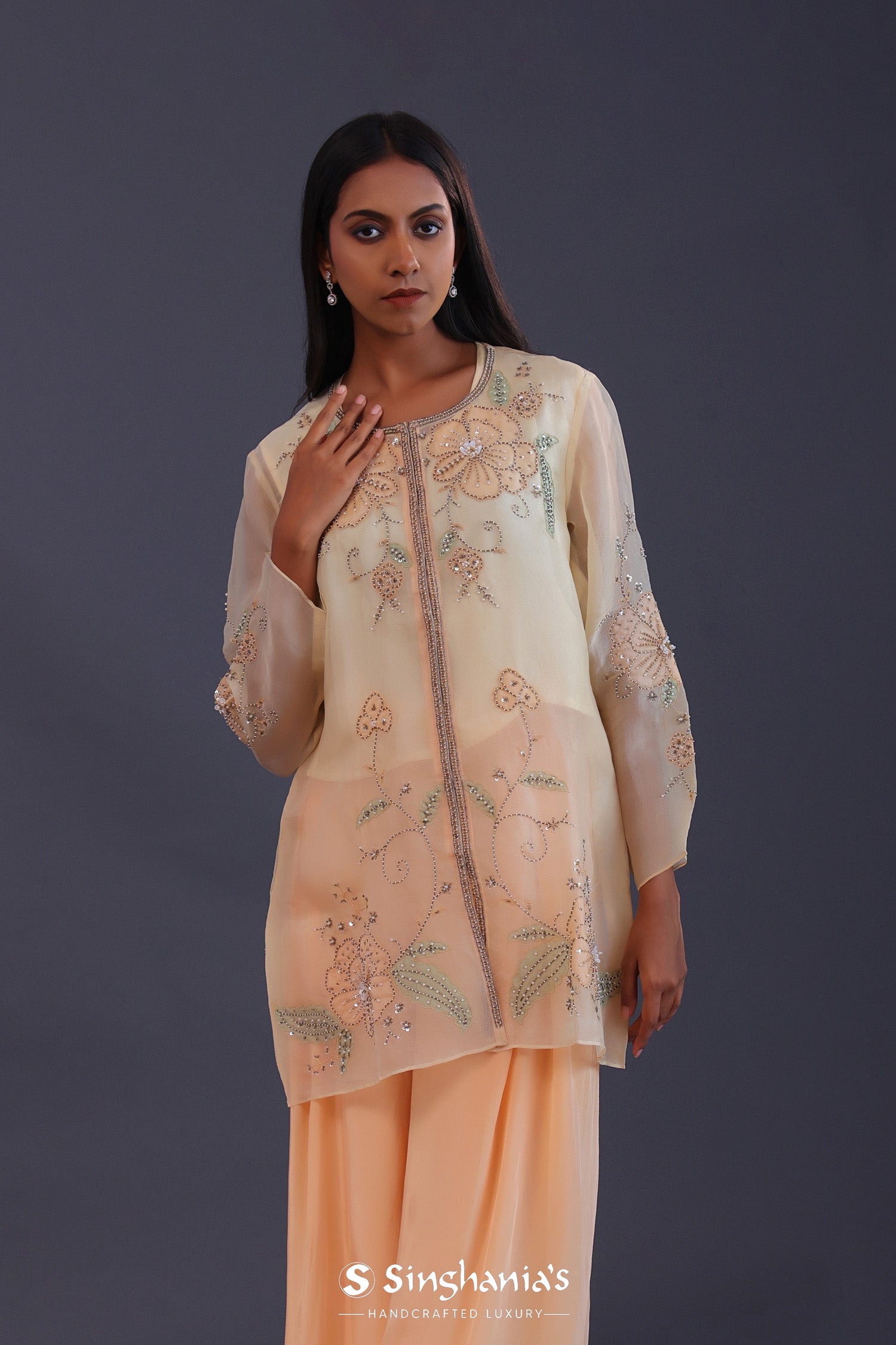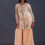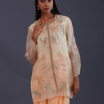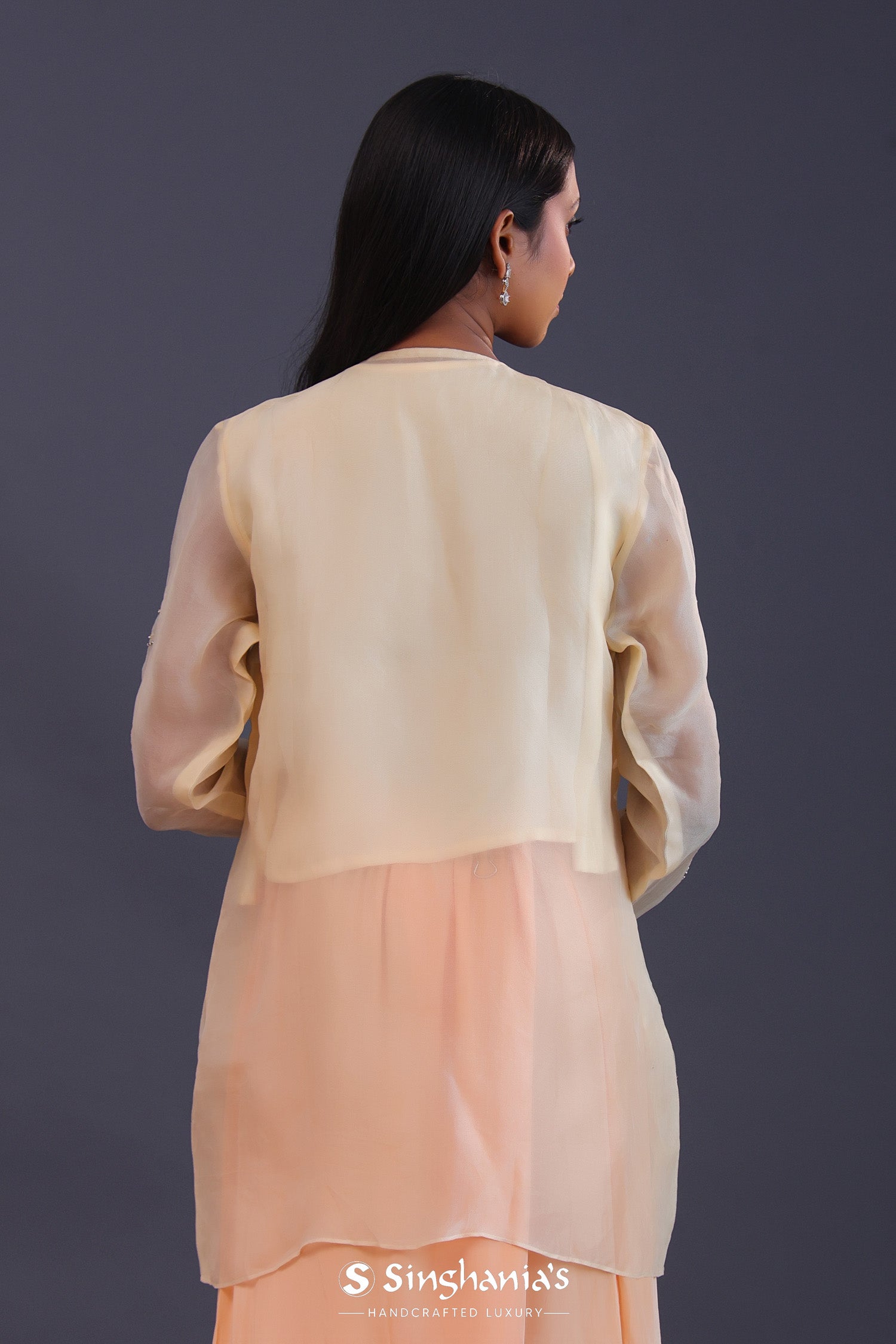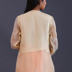 The pastel peach cutdana work kurti set with raw silk bottom and organza jacket for a charming and neat look.