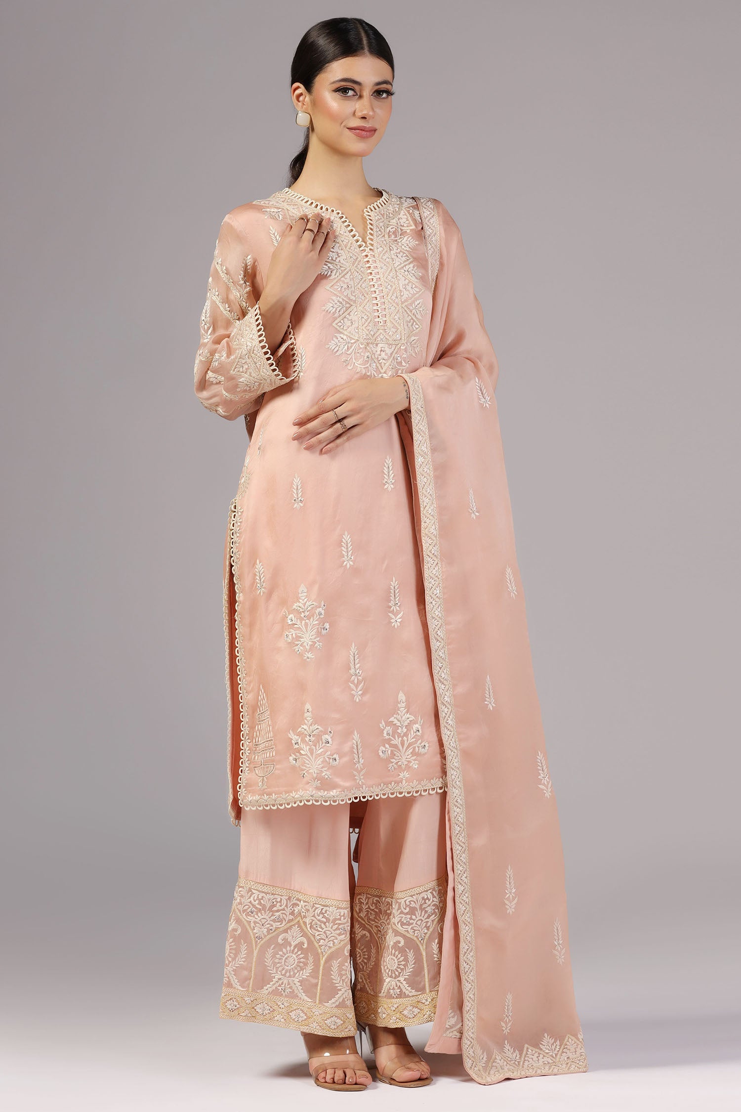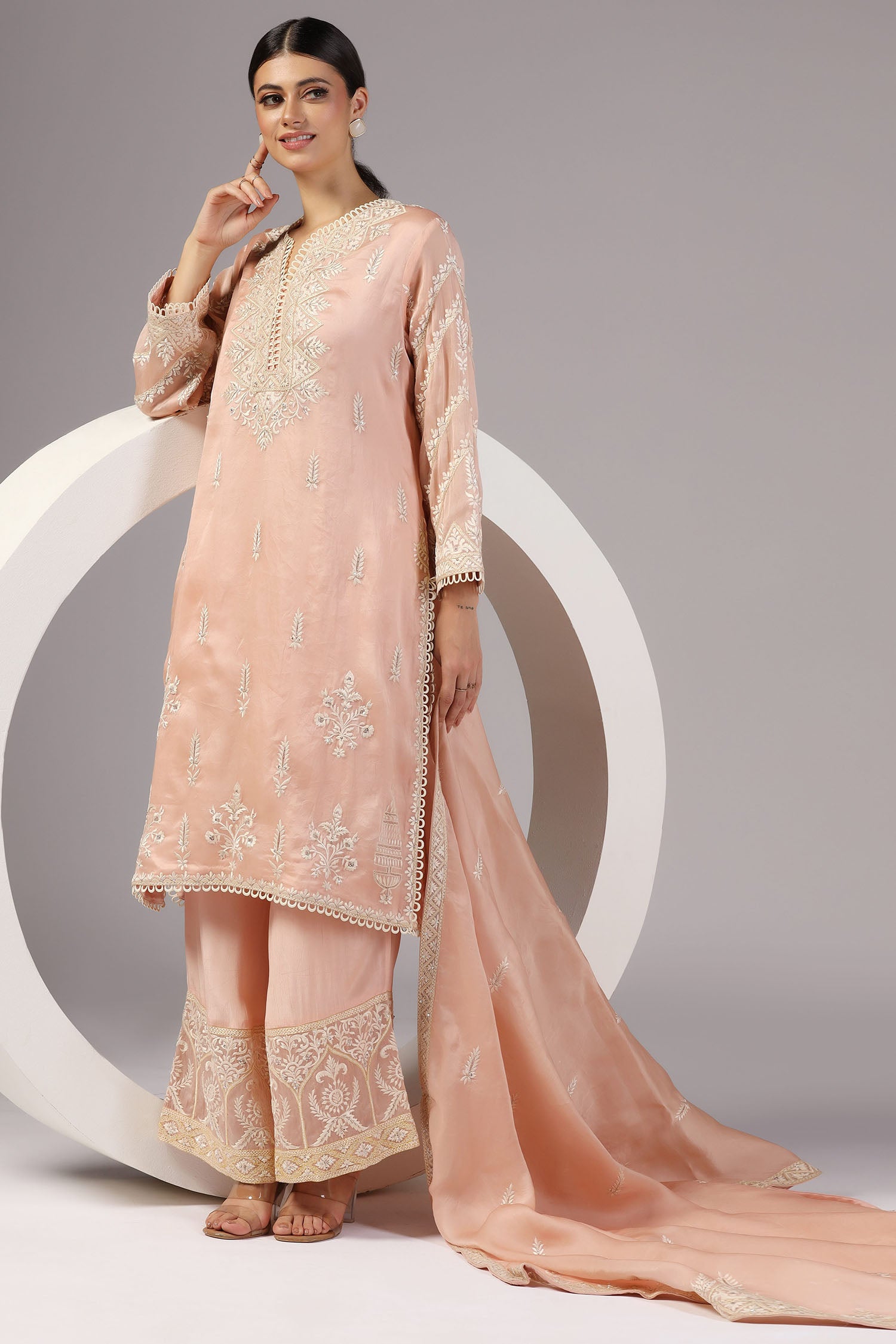 The peach pink organza thread embroidered kurti set with matching dupatta for a neat and classy look with subtle and elegant finish.