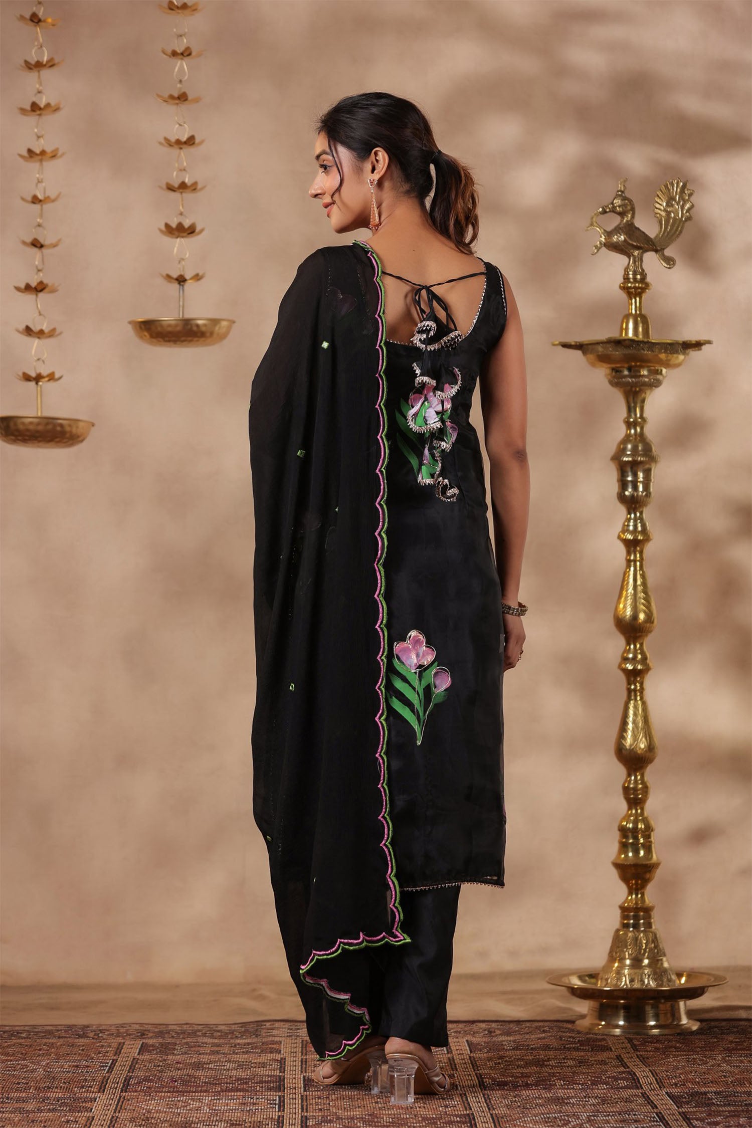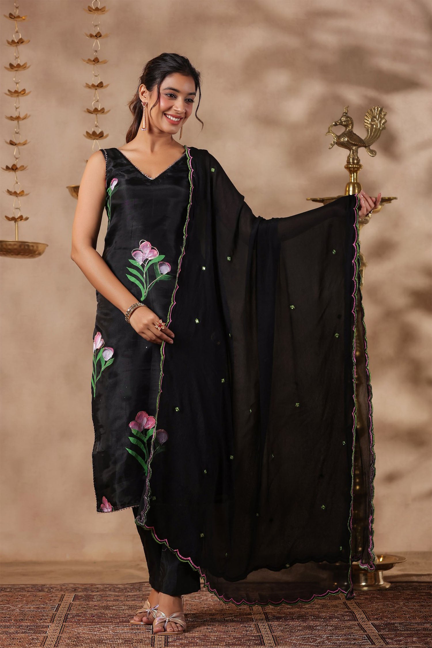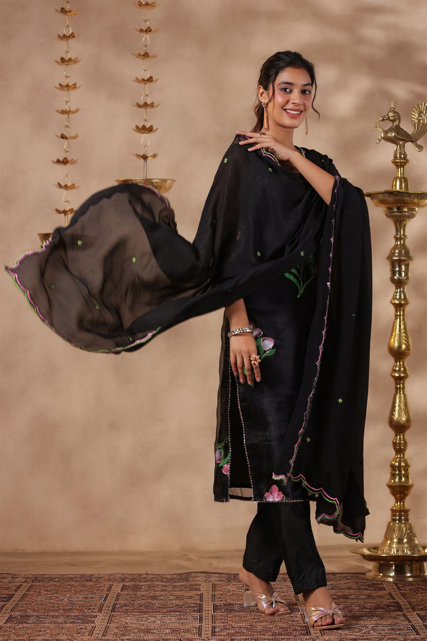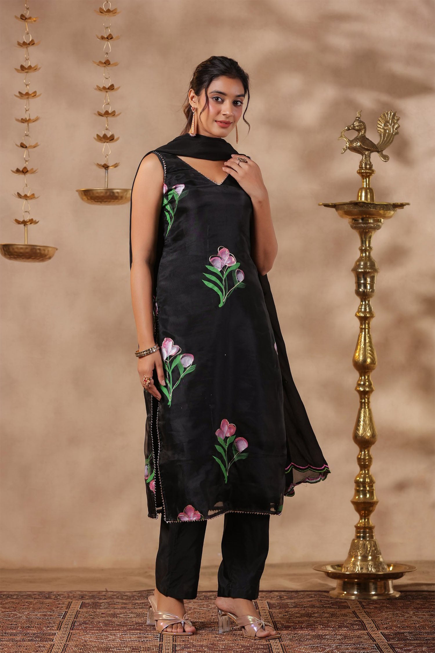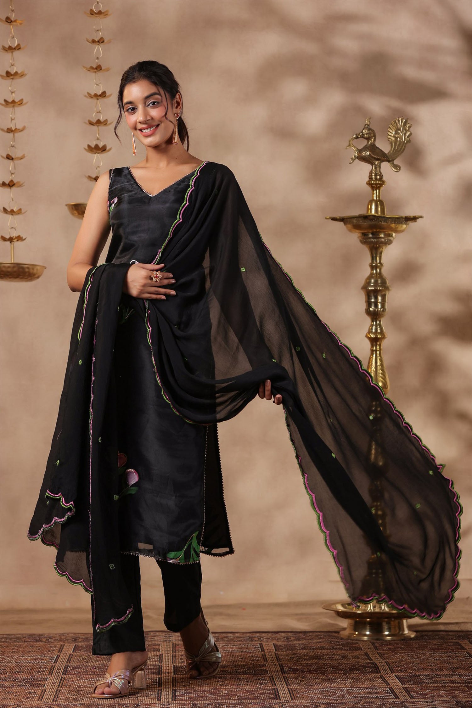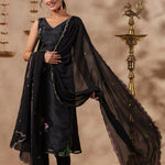 The black organza floral painted kurti set with matching pant and georgette dupatta for a neat ethnic look.