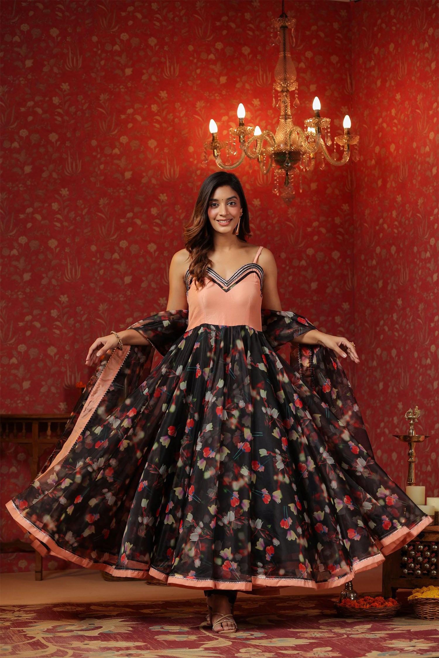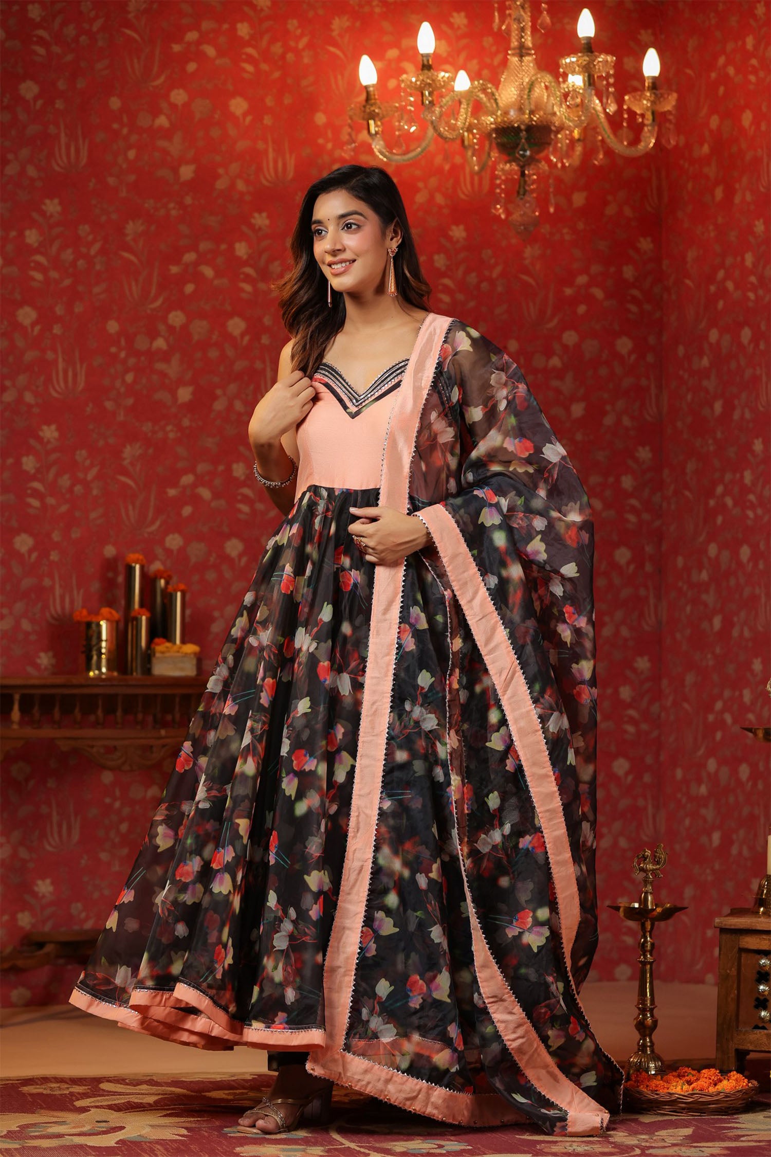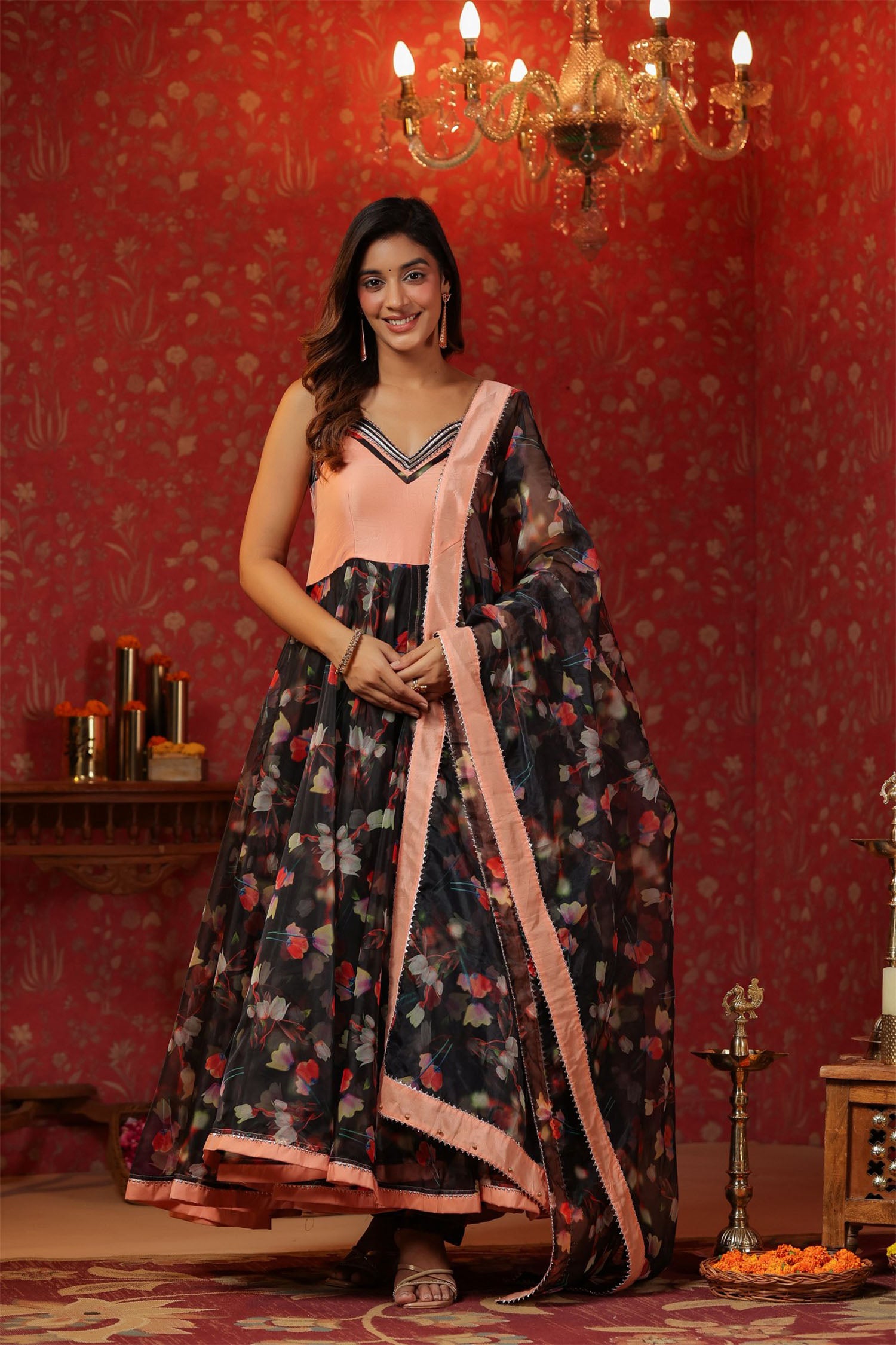 The black organza floral printed anarkali set with matching pant and dupatta for a graceful look.