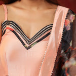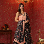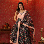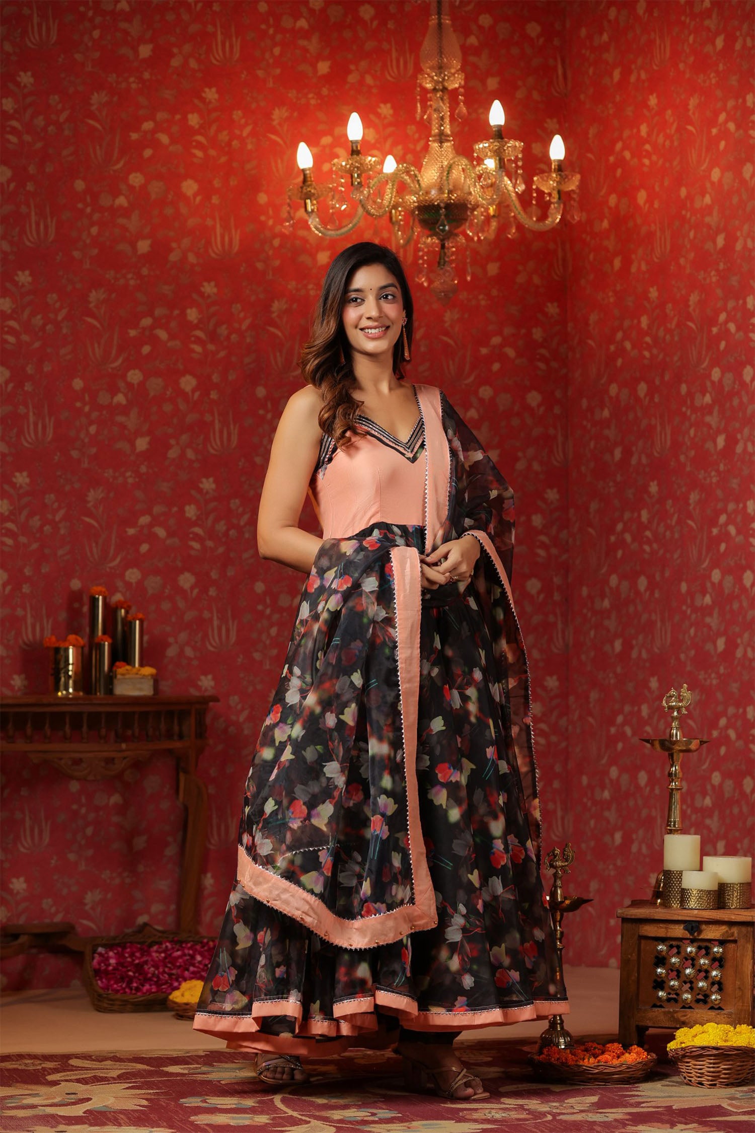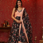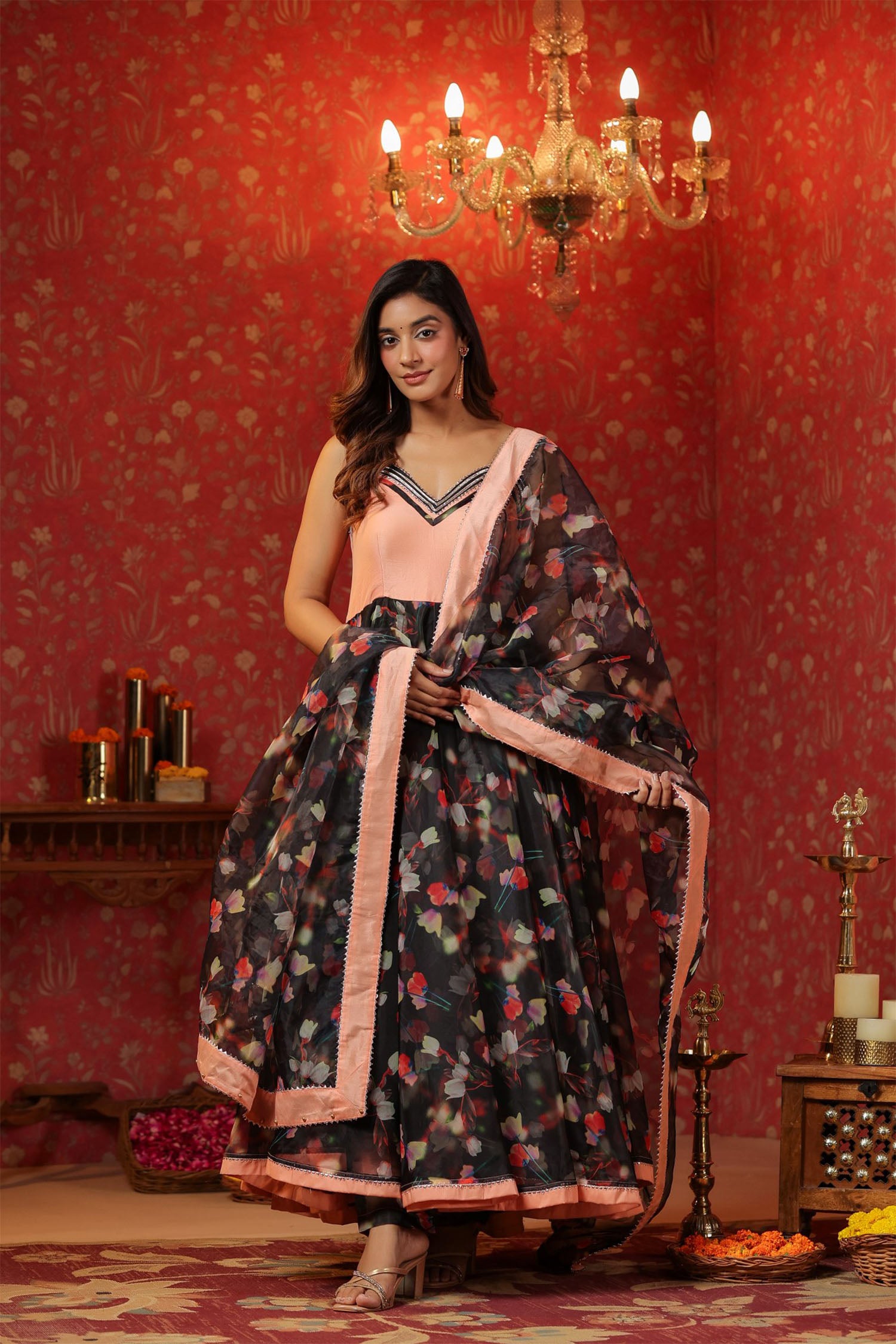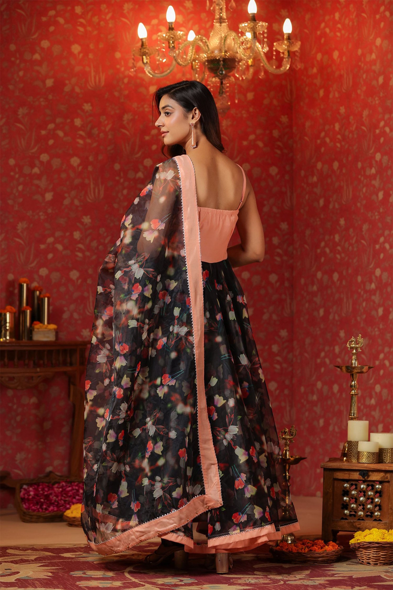 The black organza floral printed anarkali set with matching pant and dupatta for a graceful look.