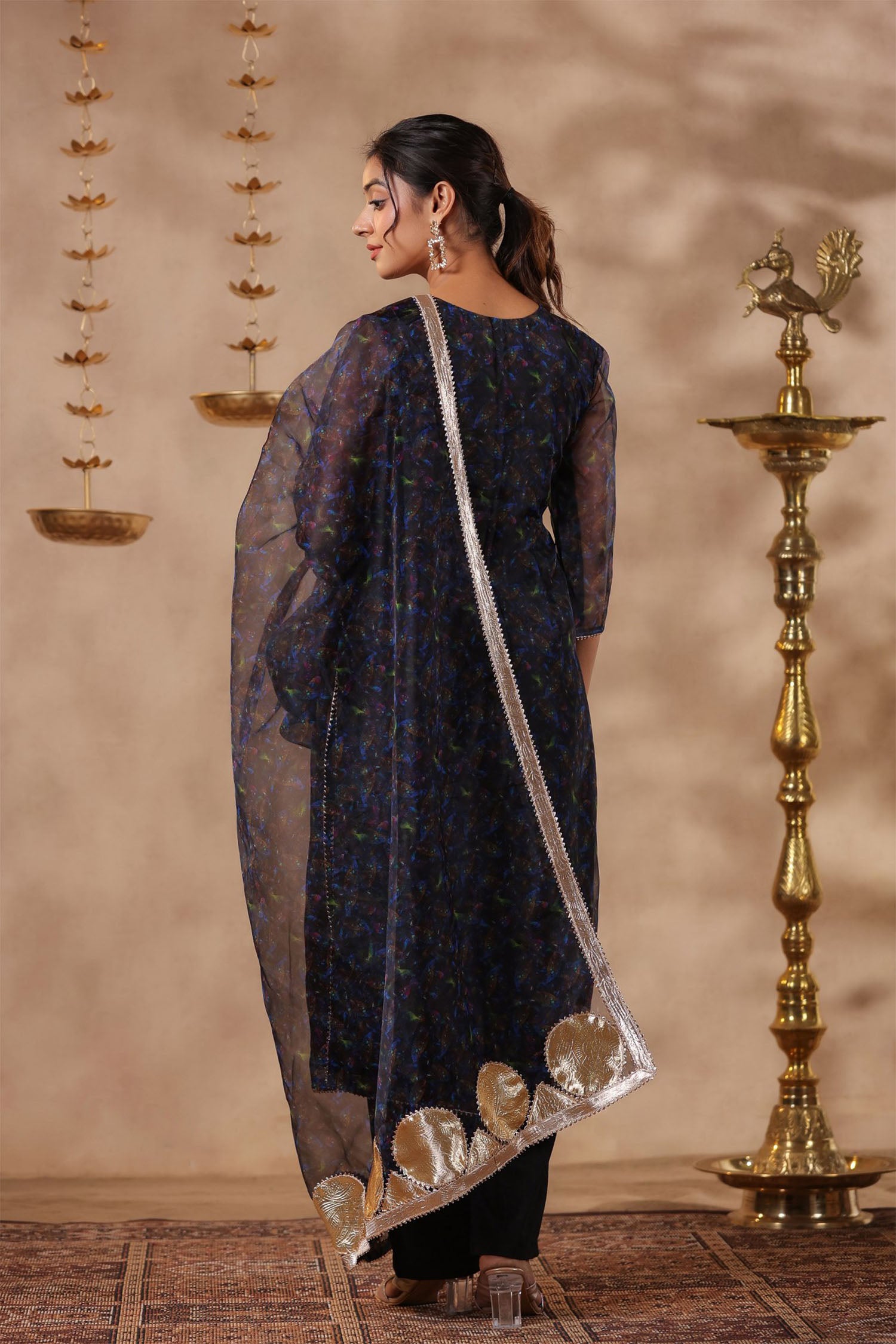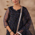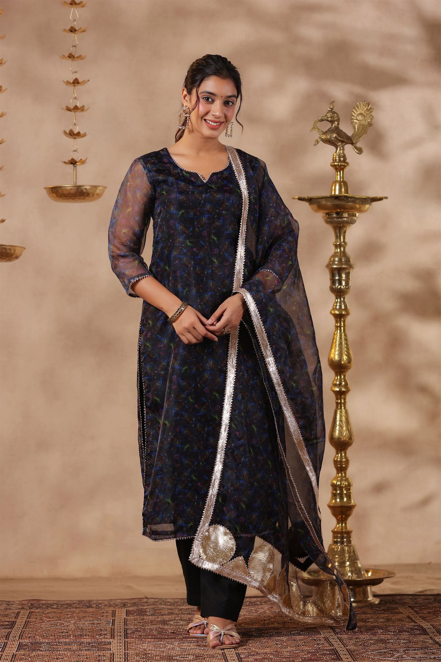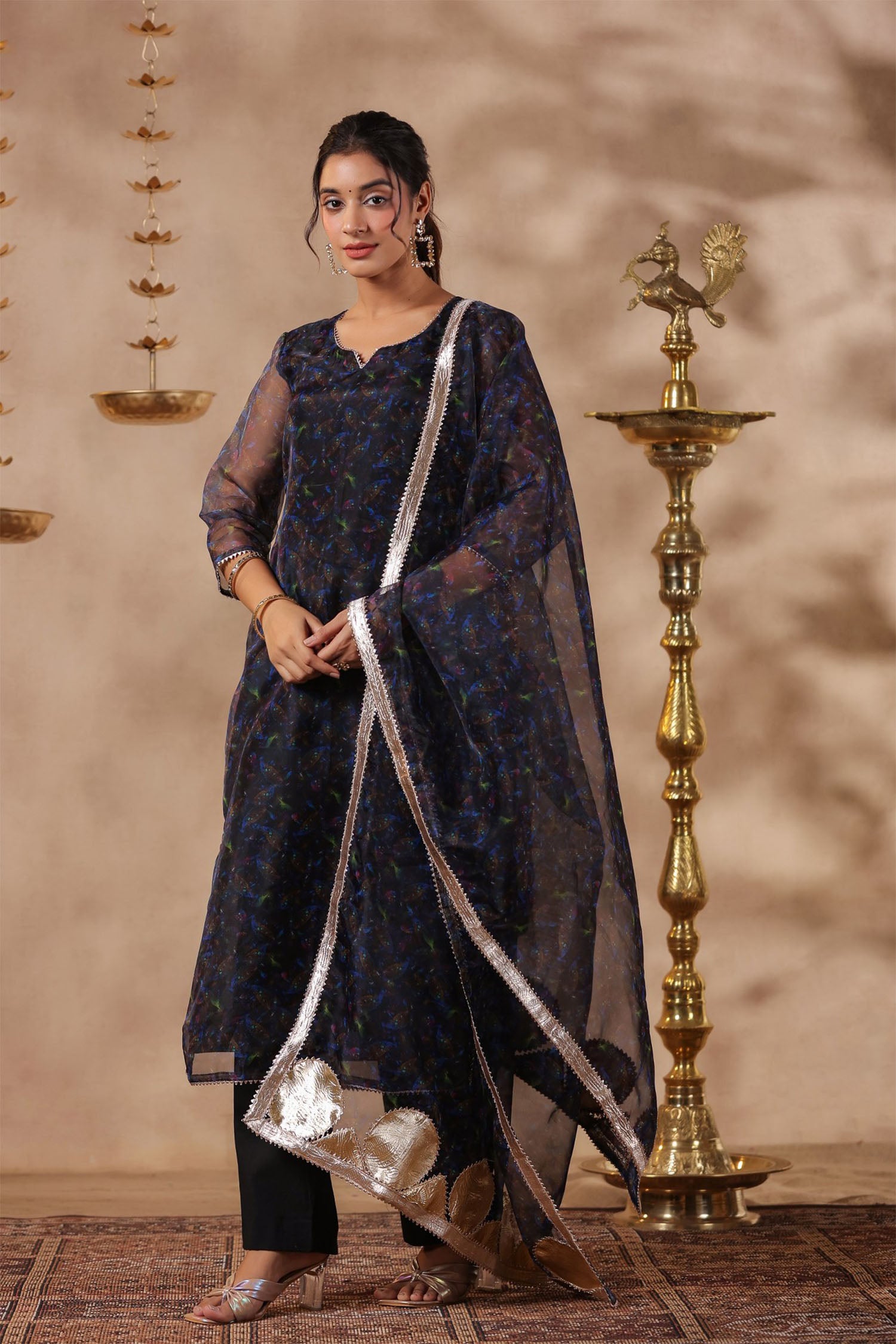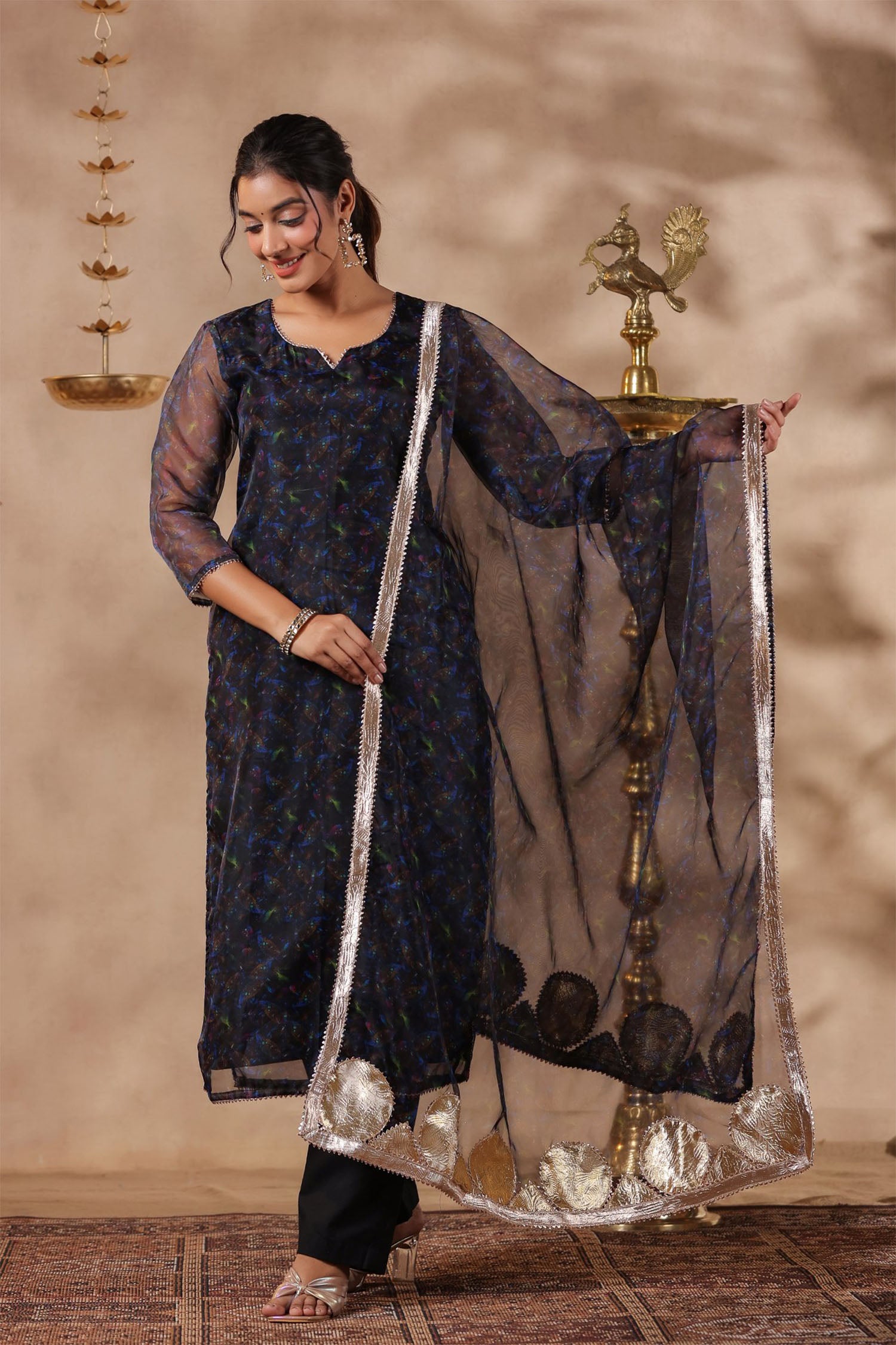 The black organza floral printed kurti set with matching pant and organza dupatta for a neat ethnic look.